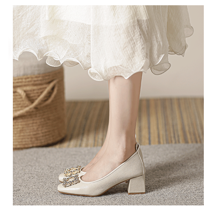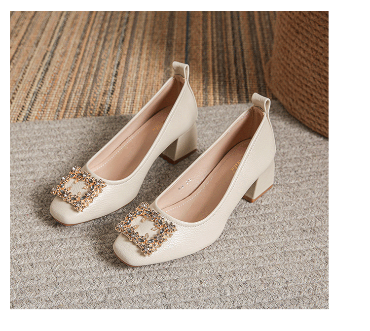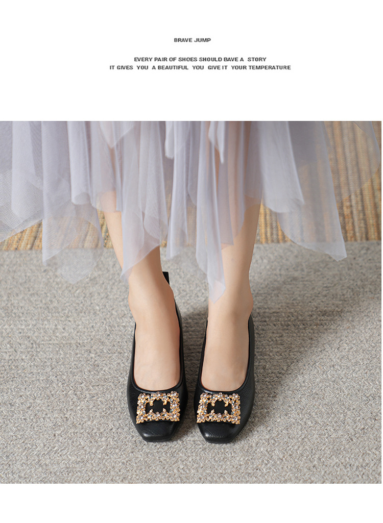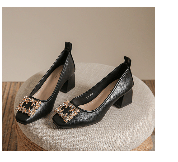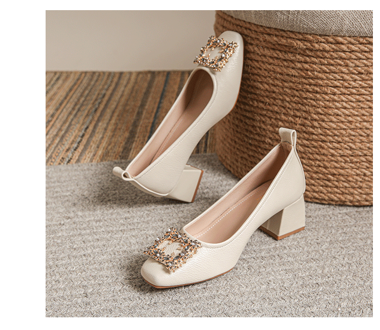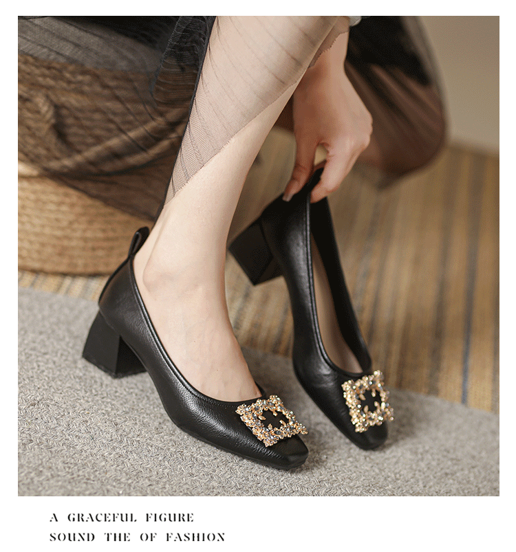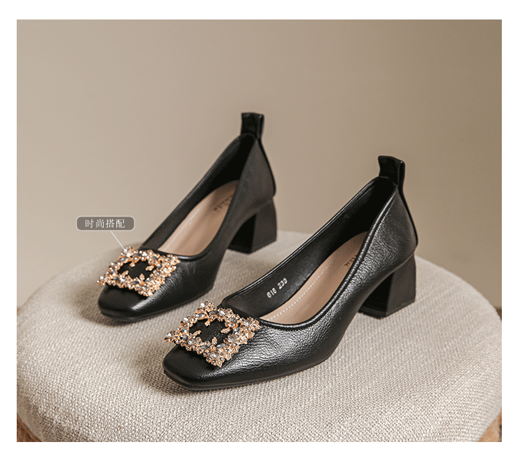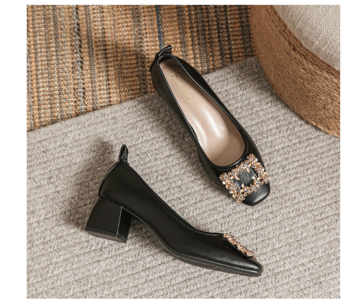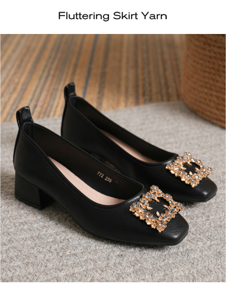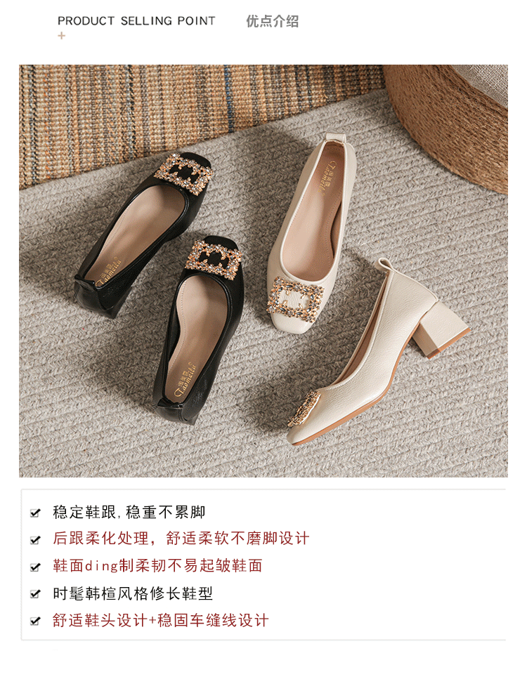 작은 사각 발가락 부드러운 가죽 신발 여성의 가을 2023 안티 킥 간단한 두꺼운 뒤꿈치 부드러운 바닥 편안한 색상 하이힐
