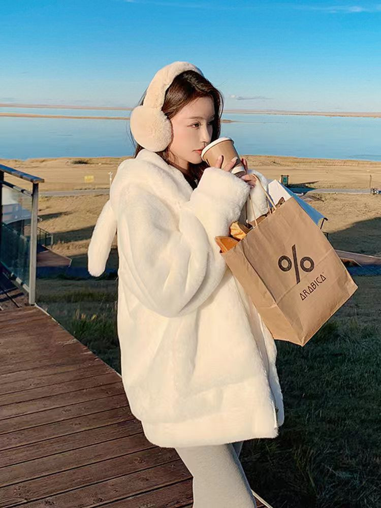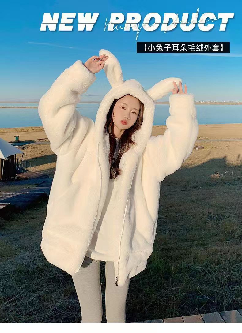 토끼 귀 모양의 양털 느낌 여성용 겨울 2023 신상 플러스 벨벳 부드럽고 푹신한 스웨트셔츠 지퍼 카디건스토어 가기