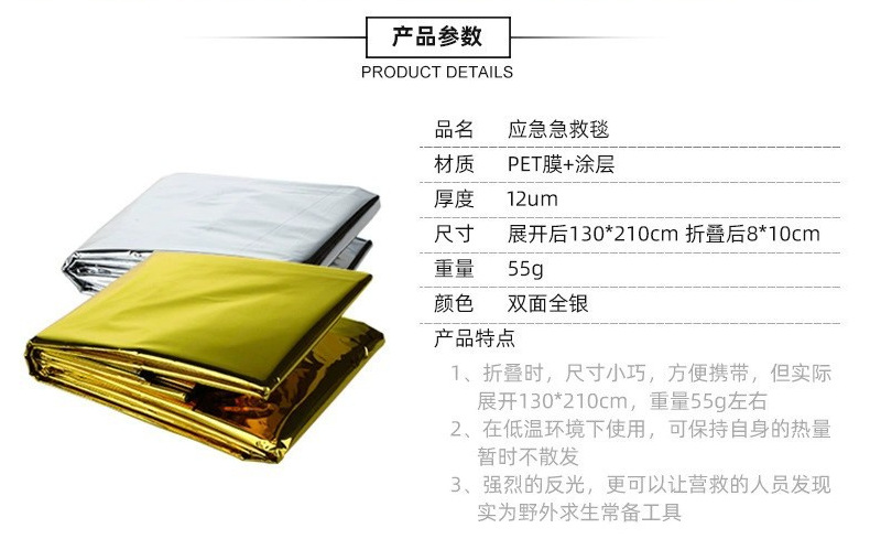 急救毯在国际上广泛应用于登山,消防,救援和军用。其实很简单,一般就是一块铝塑复合的薄膜,其重量非常轻,也就十几克左右。那么有人就问了,这么轻的一个东西究竟能有多大的用途呢?