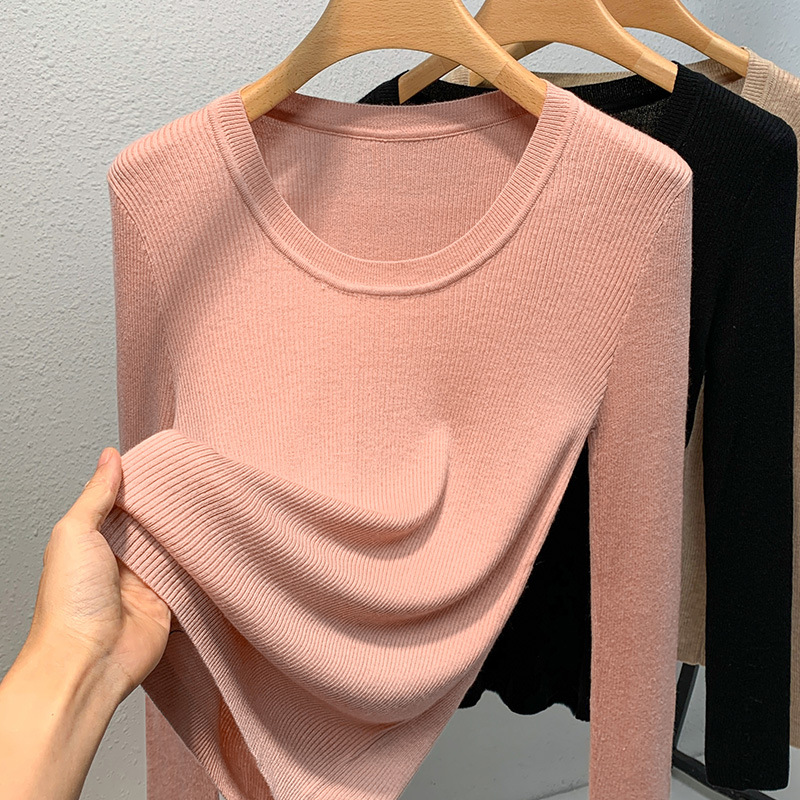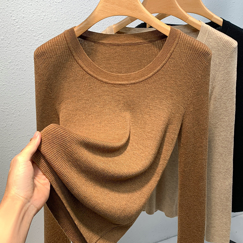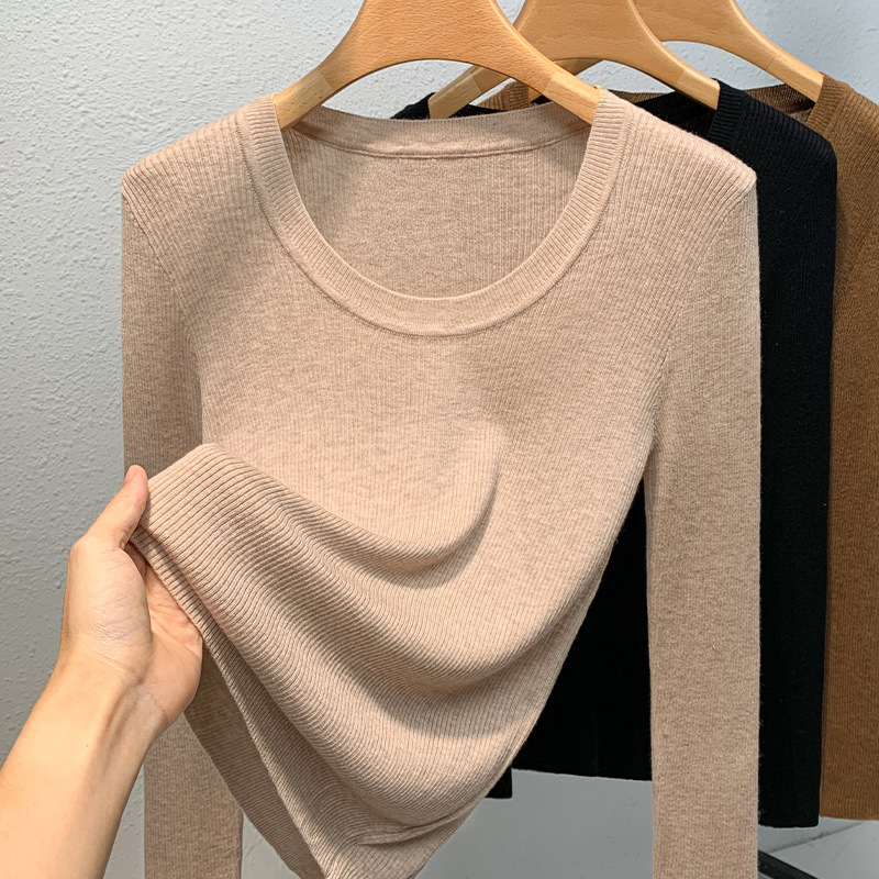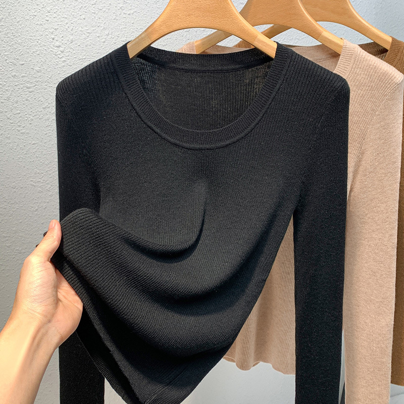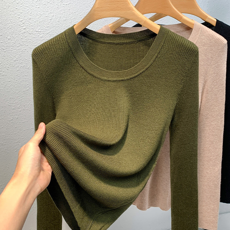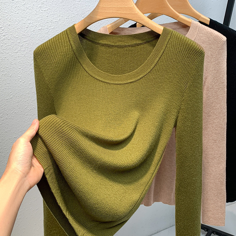 니트 베이스 셔츠 여성용 2025 신상 유럽 스타일 여성복 넓은 라운드넥 풀오버 스웨터 신축성 있는 이너웨어 허리 조절 상의스토어 가기