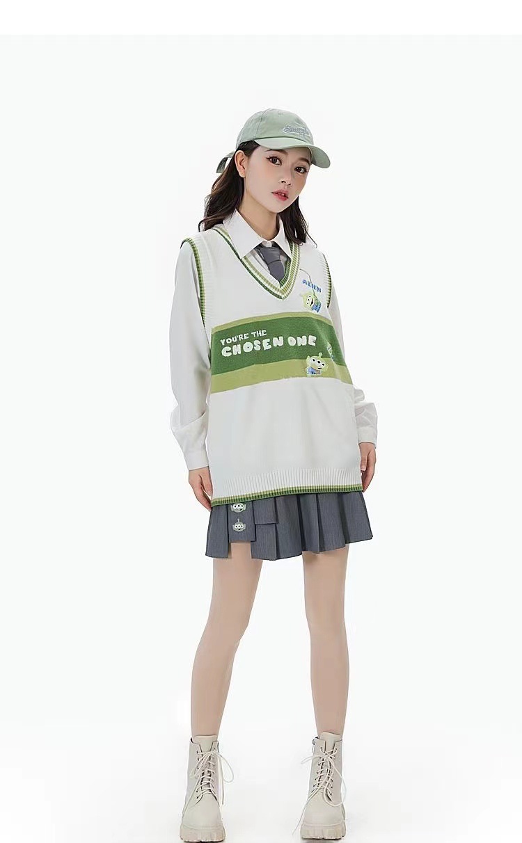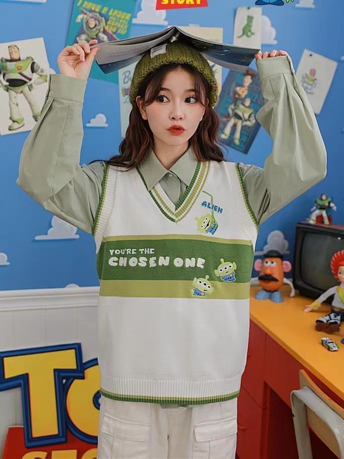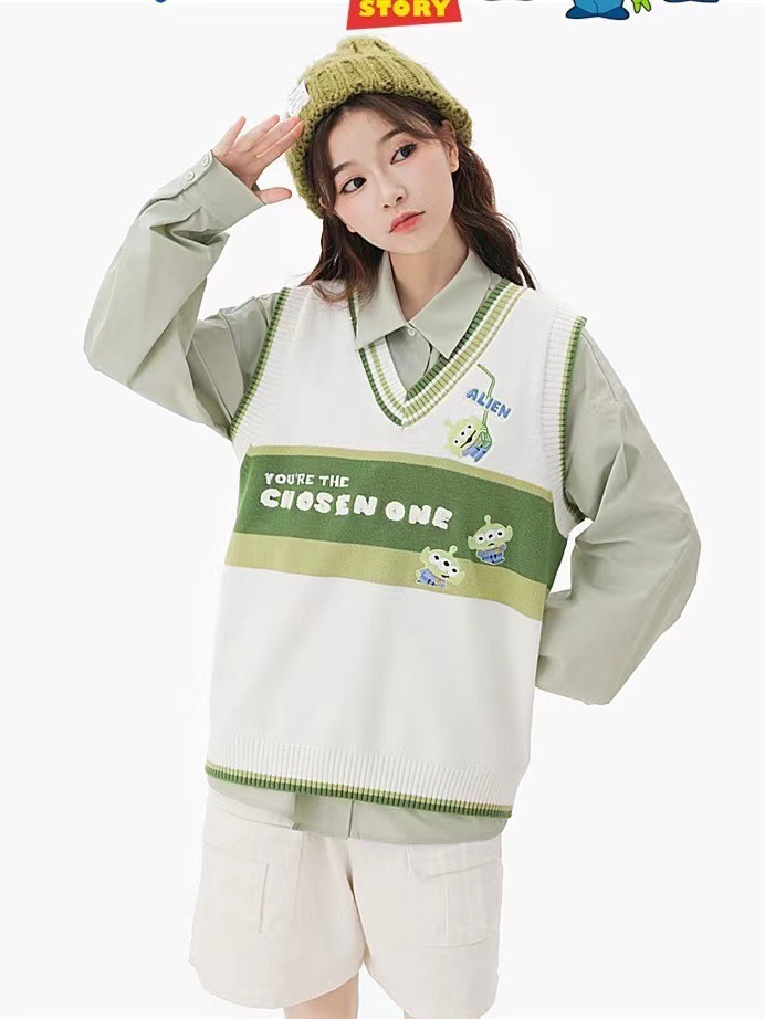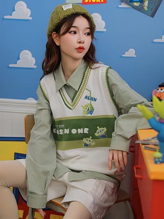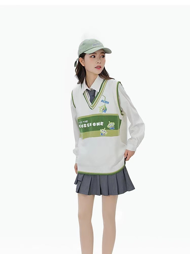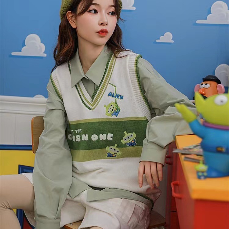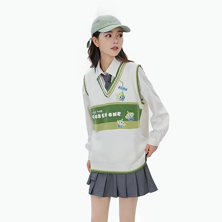 만화 세 눈 괴물 모리 V-넥 니트 조끼 여자 대학 스타일 귀여운 봄과 가을 민소매 스웨터 오버웨어스토어 가기