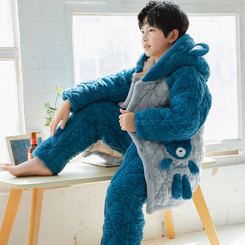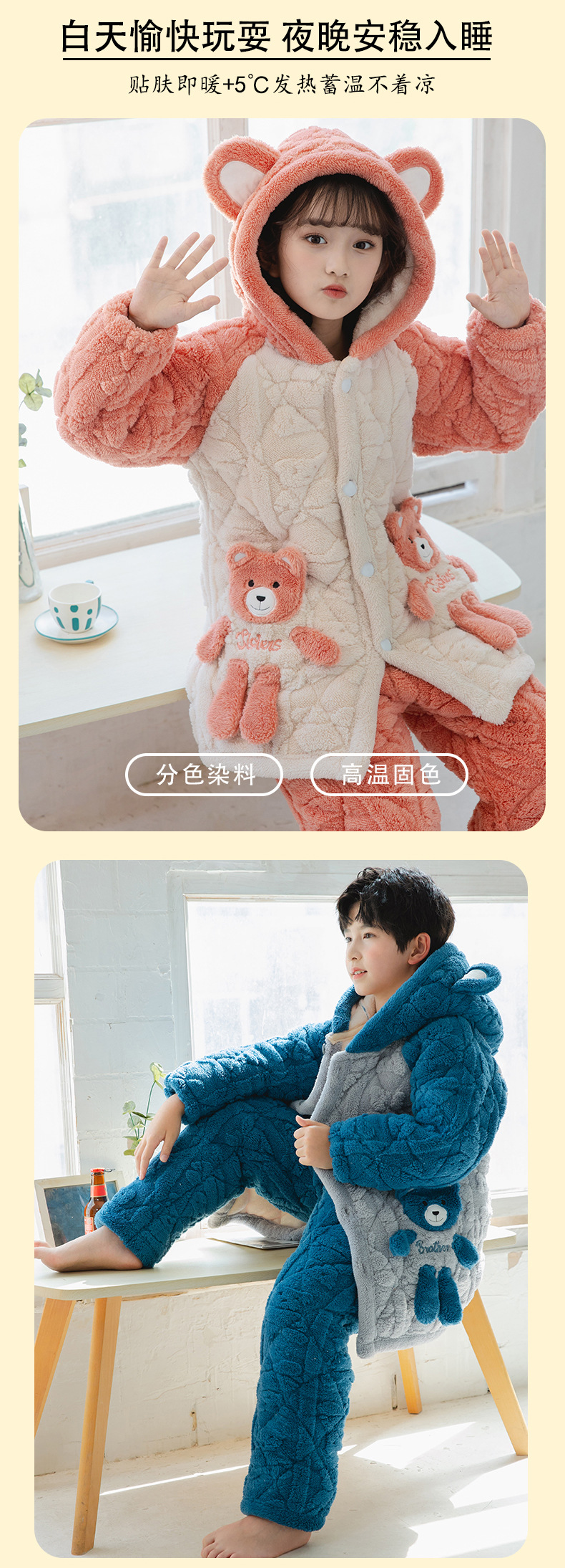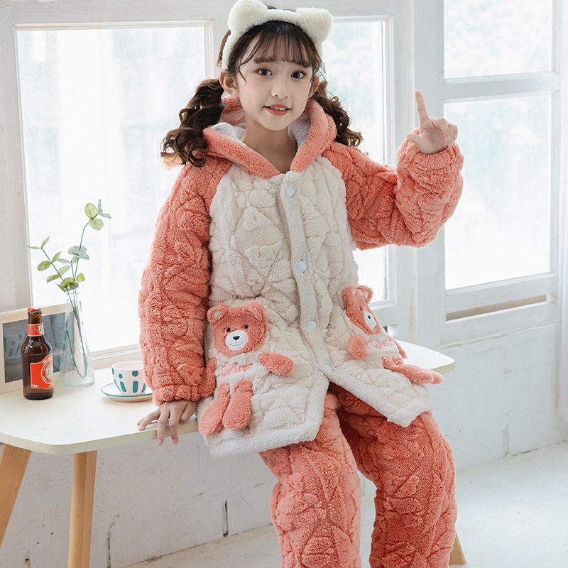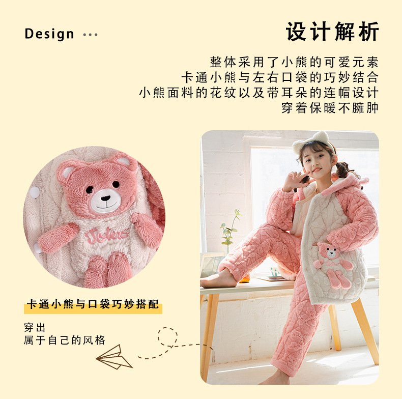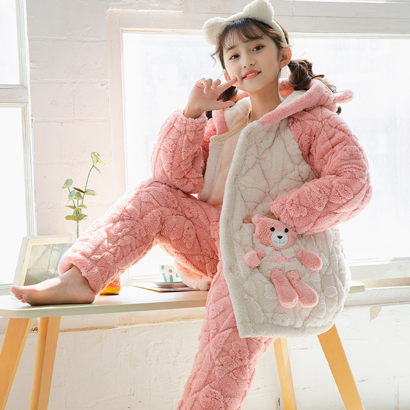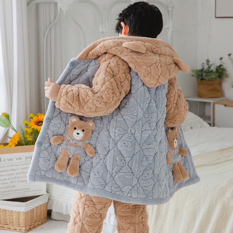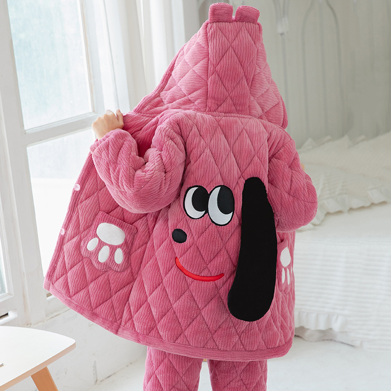 새로운 귀여운 곰 3 층 누비 이불 잠옷 두꺼운 플란넬 가정 옷 세트 기모 후드 강아지 세트