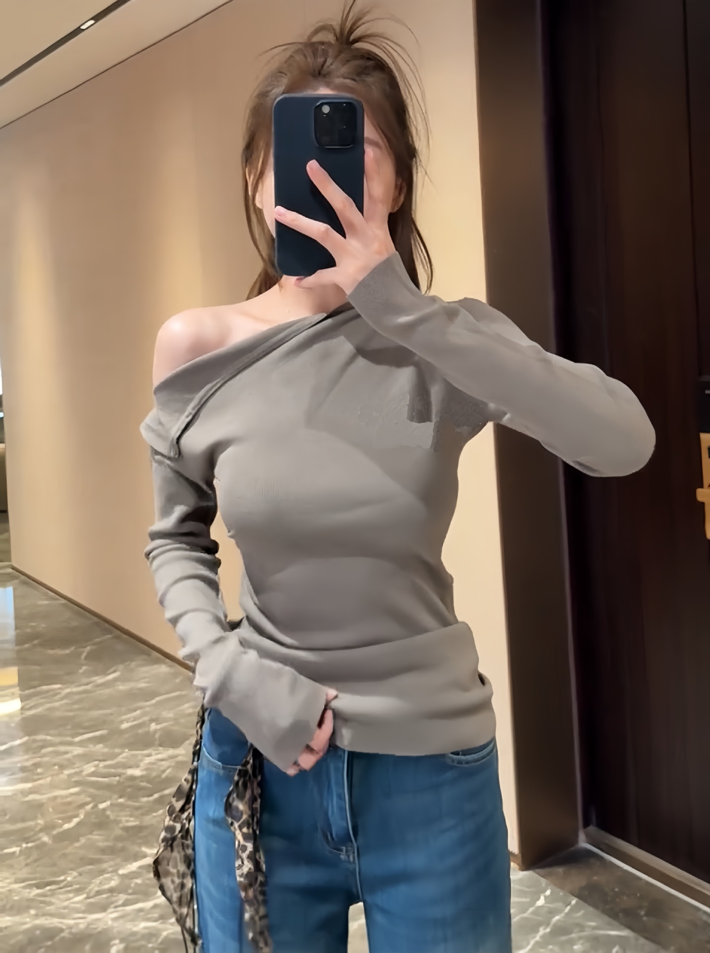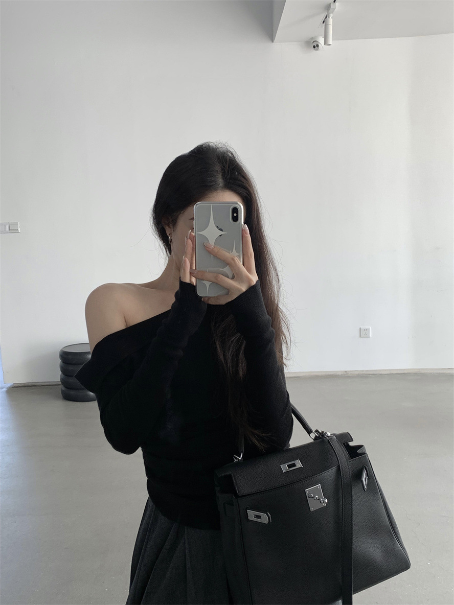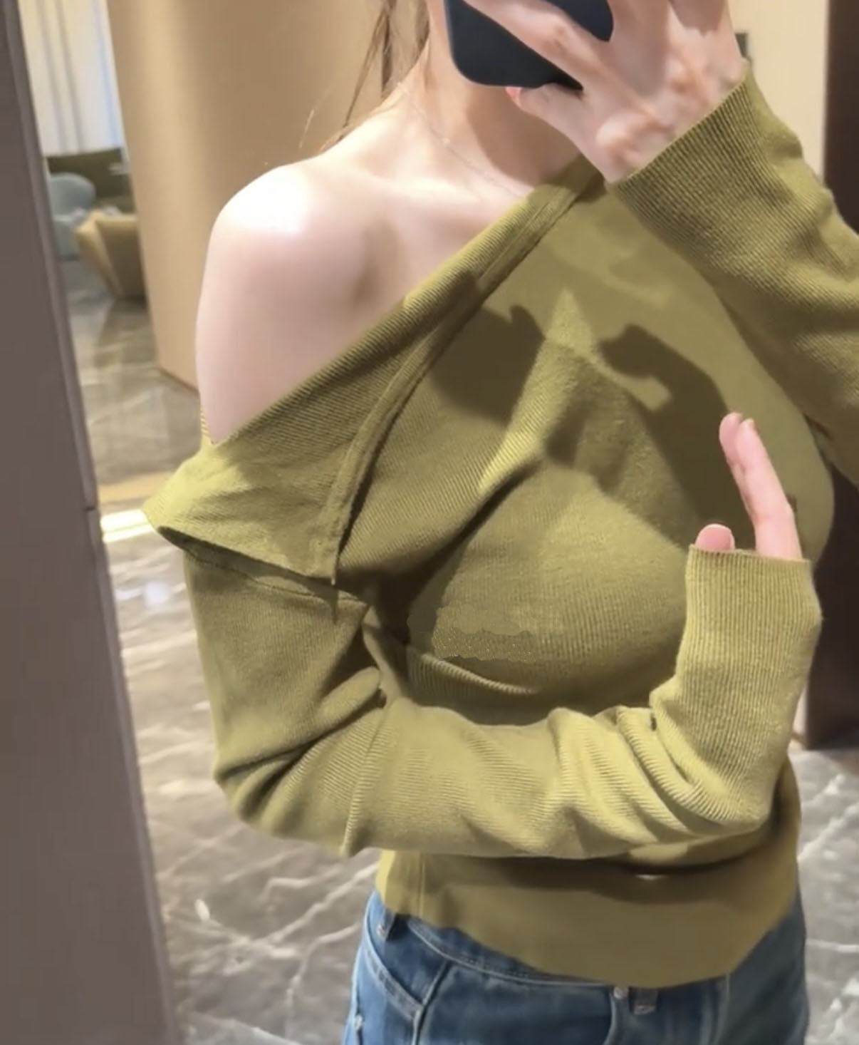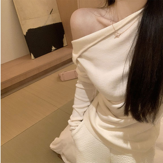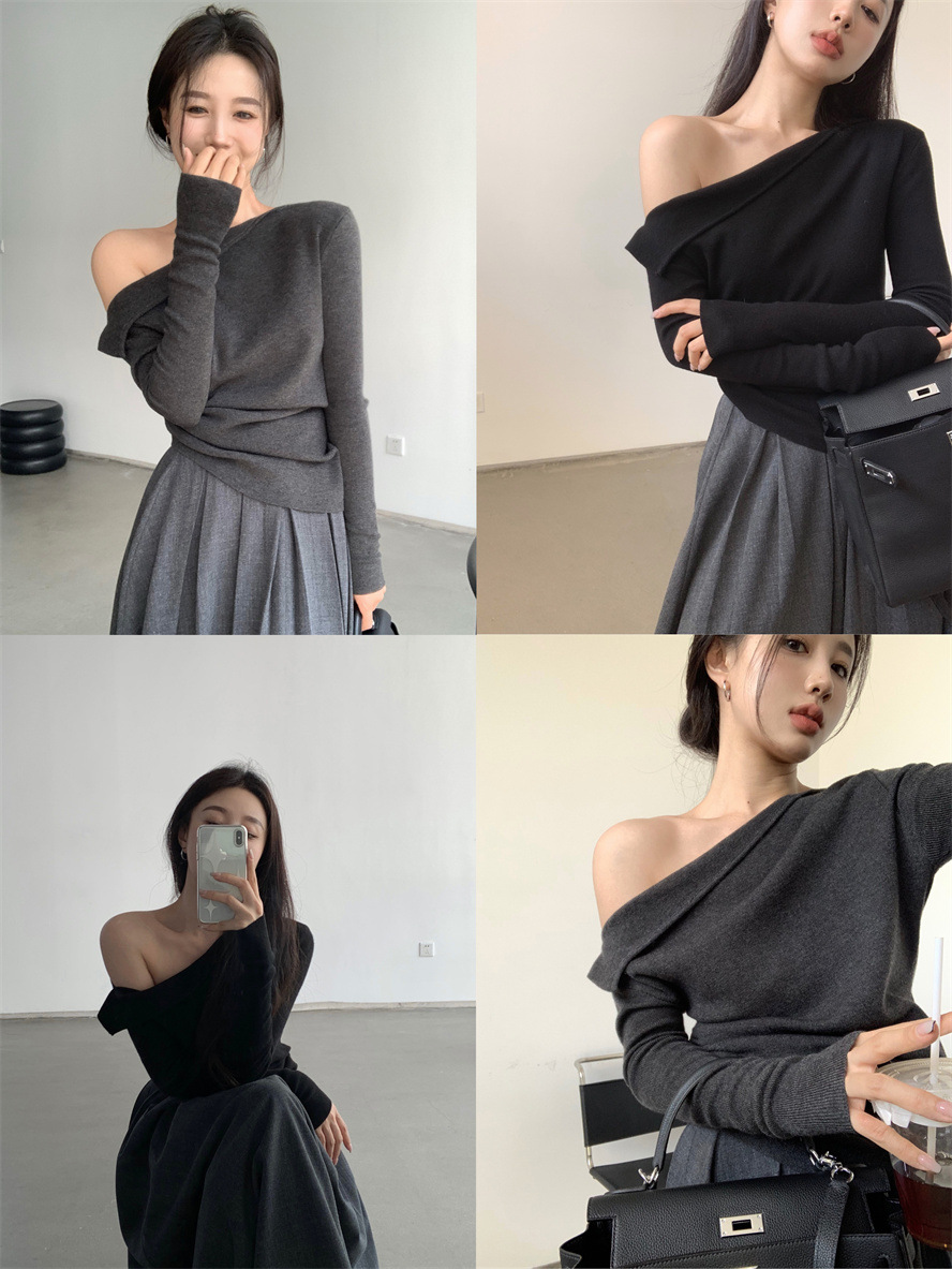 하이엔드 니치 디자인의 오프숄더 밑단 셔츠, 긴팔 스웨터, 중간길이, 복고풍, 시크하고 패셔너블한 스타일스토어 가기