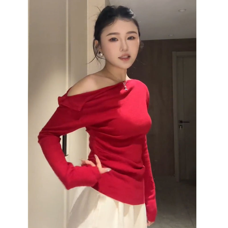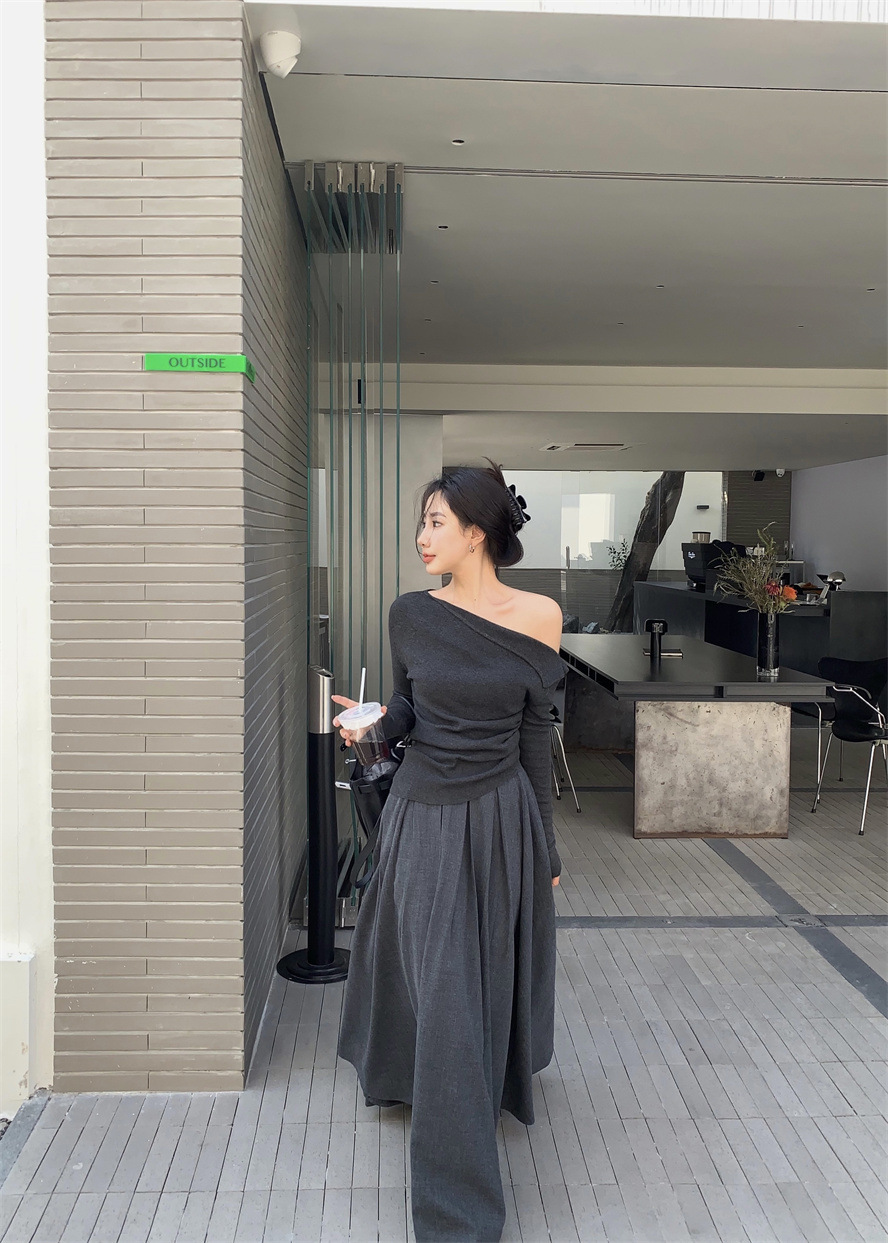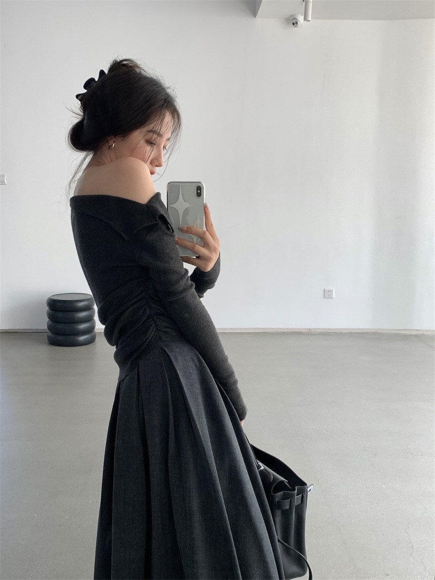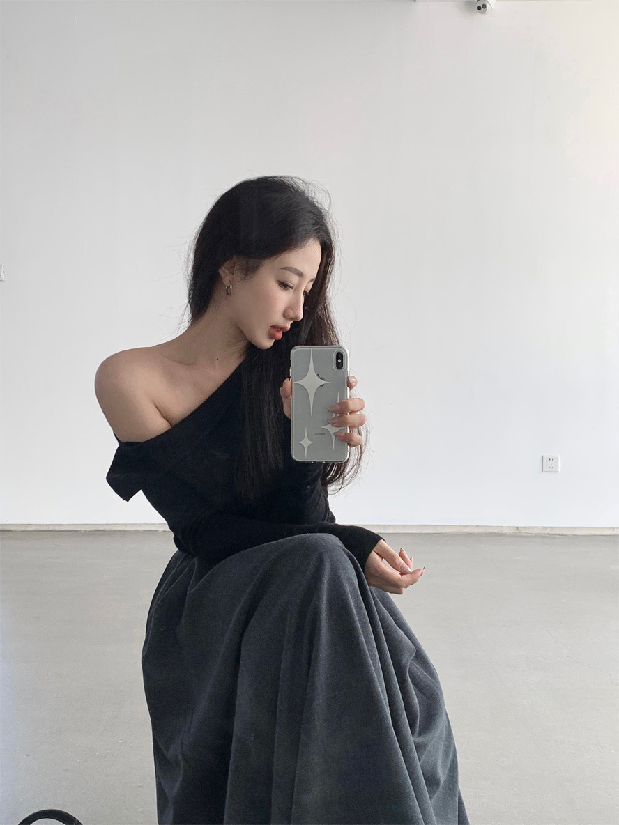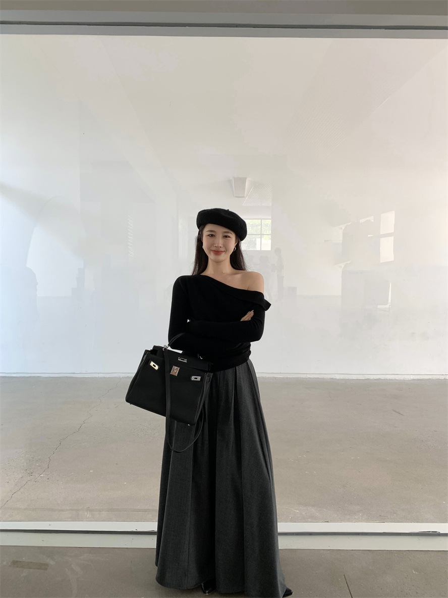 하이엔드 니치 디자인의 오프숄더 밑단 셔츠, 긴팔 스웨터, 중간길이, 복고풍, 시크하고 패셔너블한 스타일스토어 가기