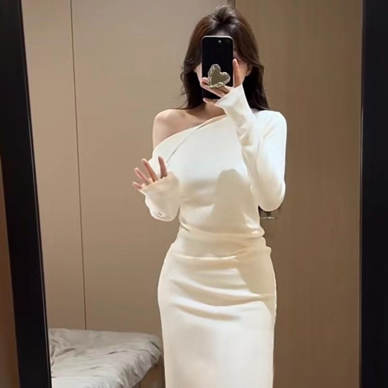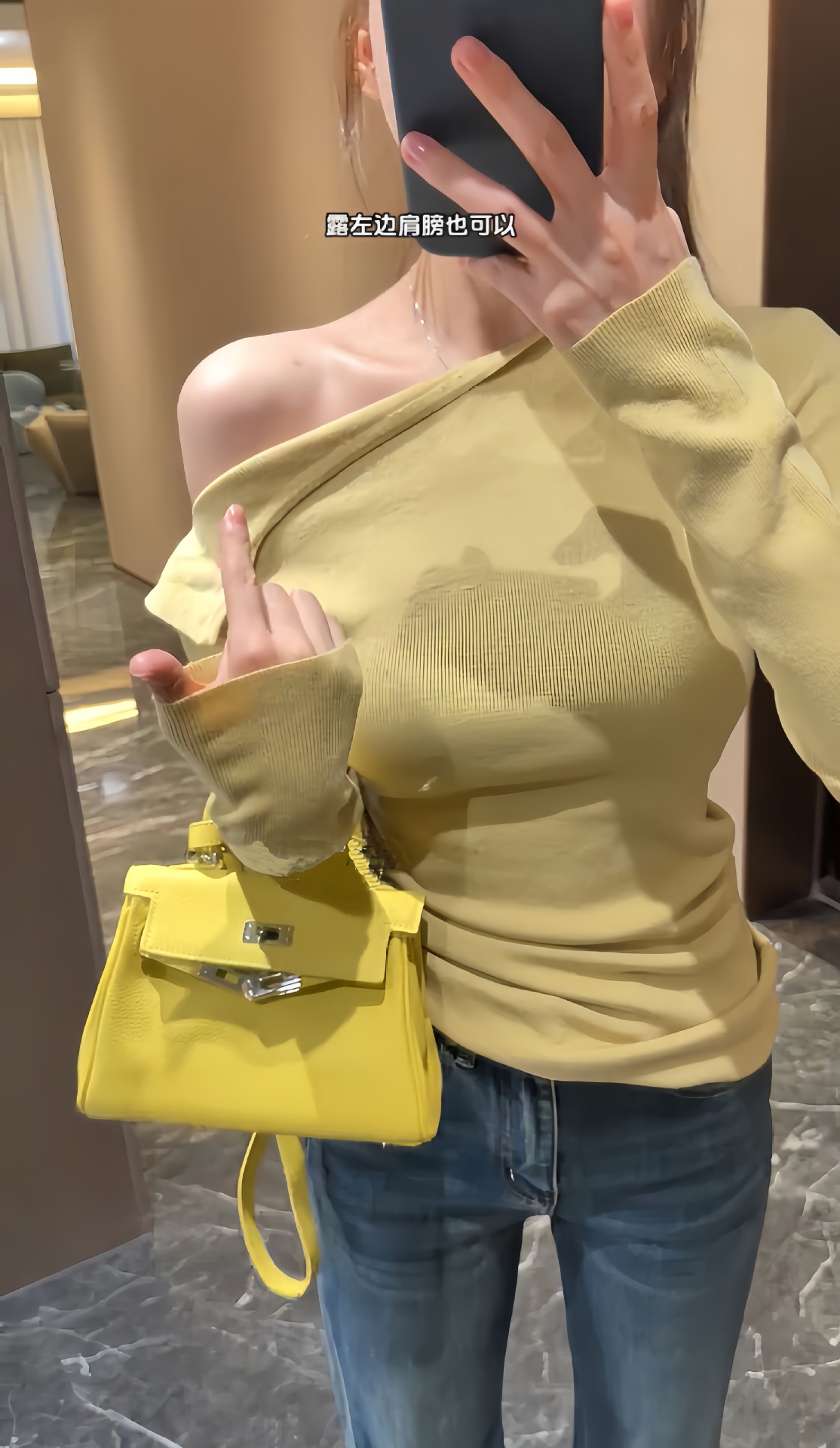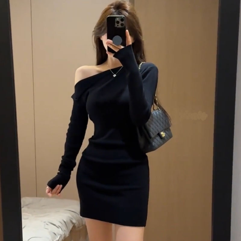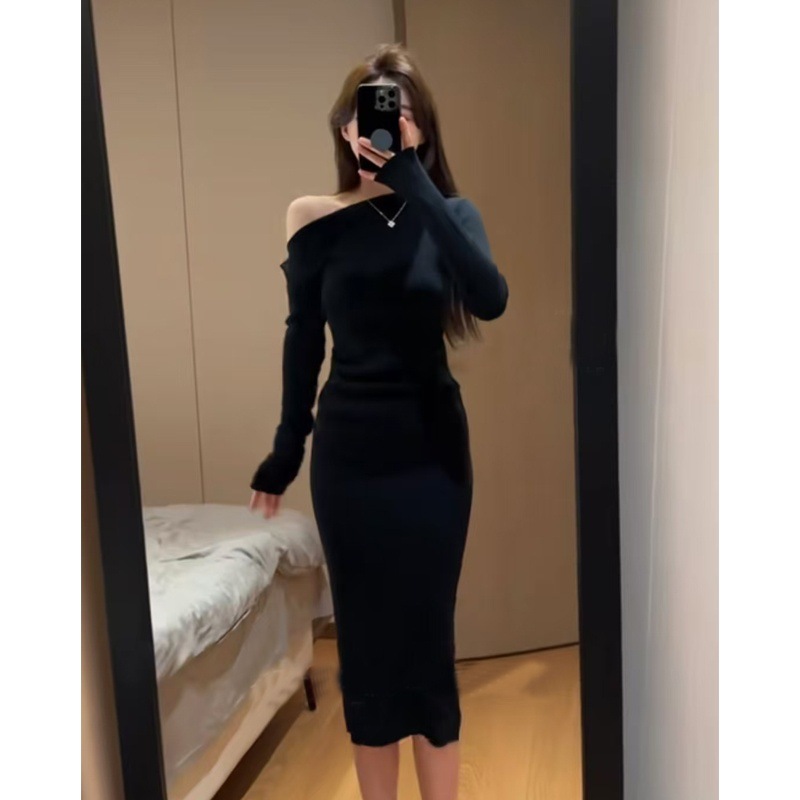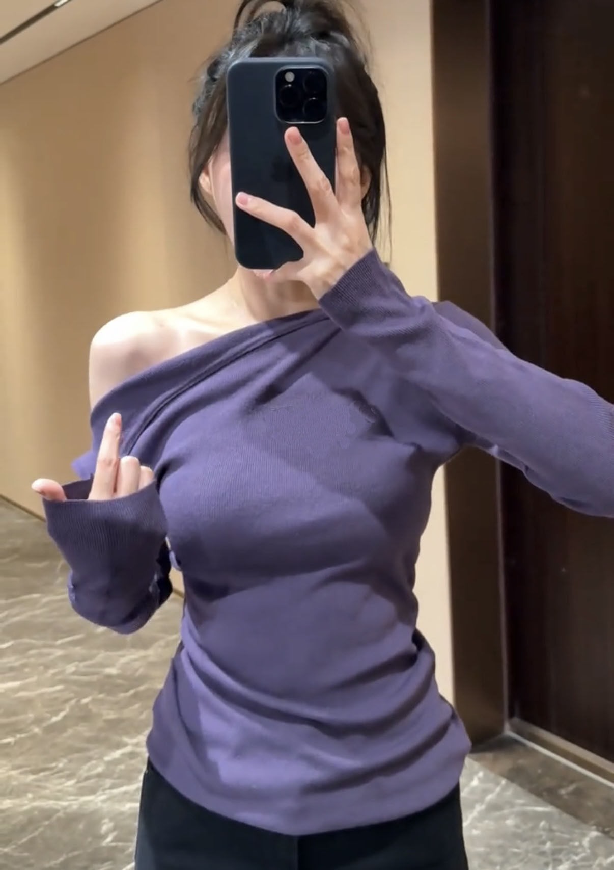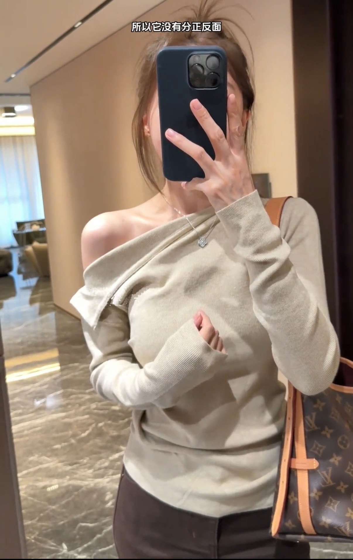 하이엔드 니치 디자인의 오프숄더 밑단 셔츠, 긴팔 스웨터, 중간길이, 복고풍, 시크하고 패셔너블한 스타일스토어 가기