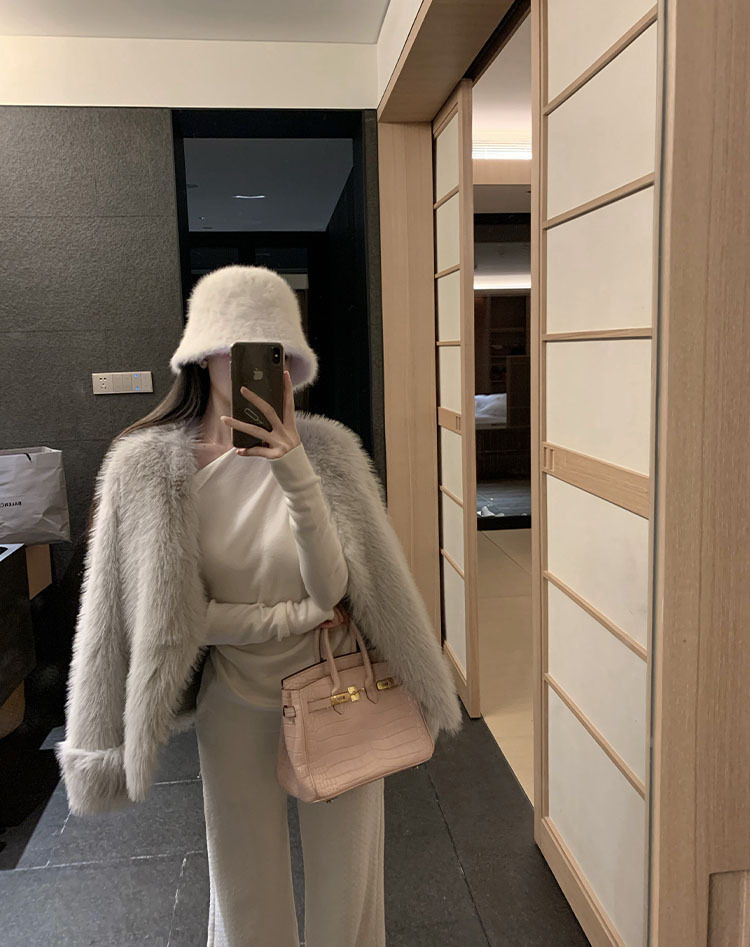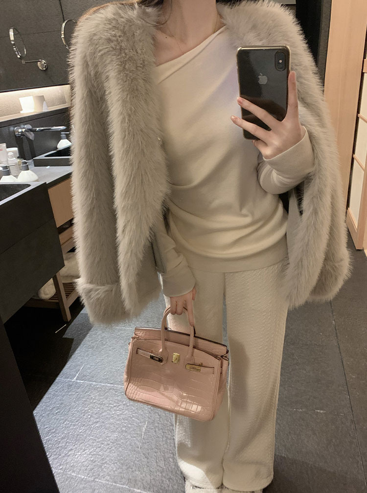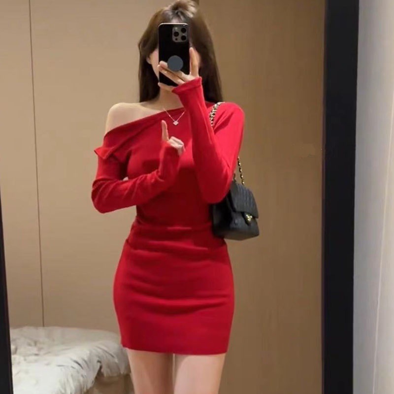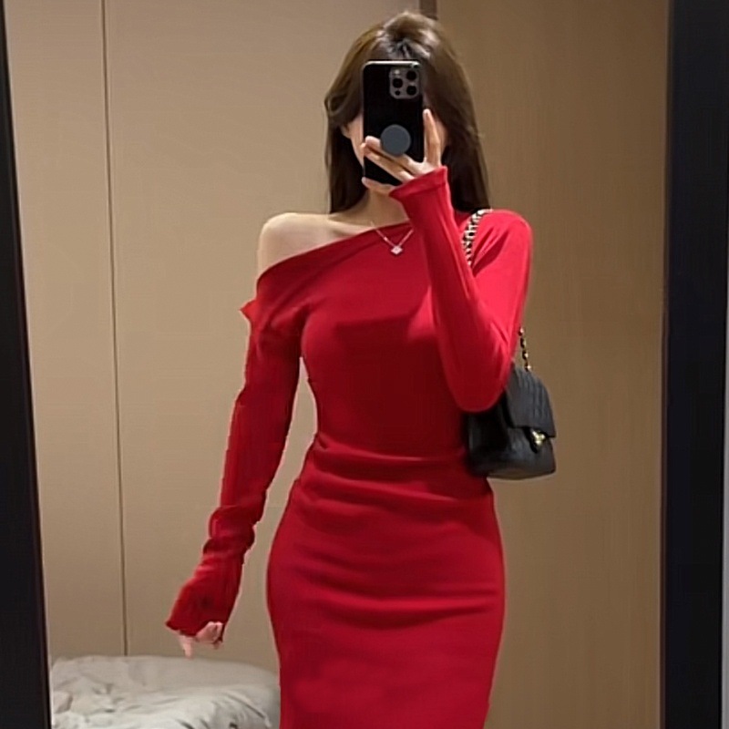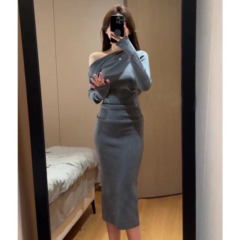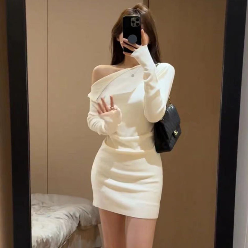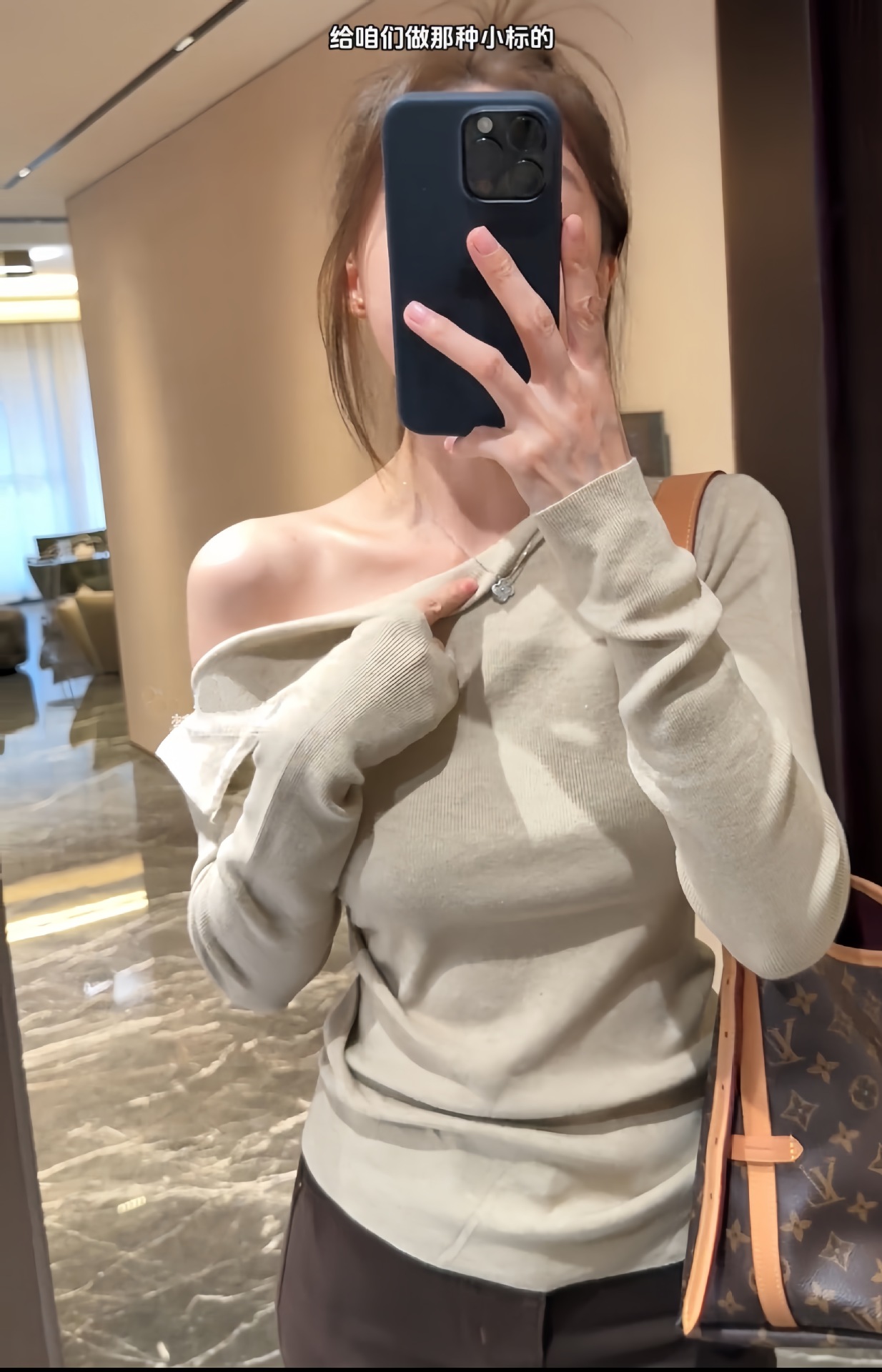 하이엔드 니치 디자인의 오프숄더 밑단 셔츠, 긴팔 스웨터, 중간길이, 복고풍, 시크하고 패셔너블한 스타일스토어 가기