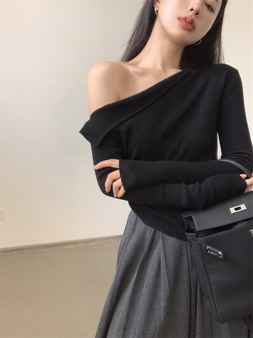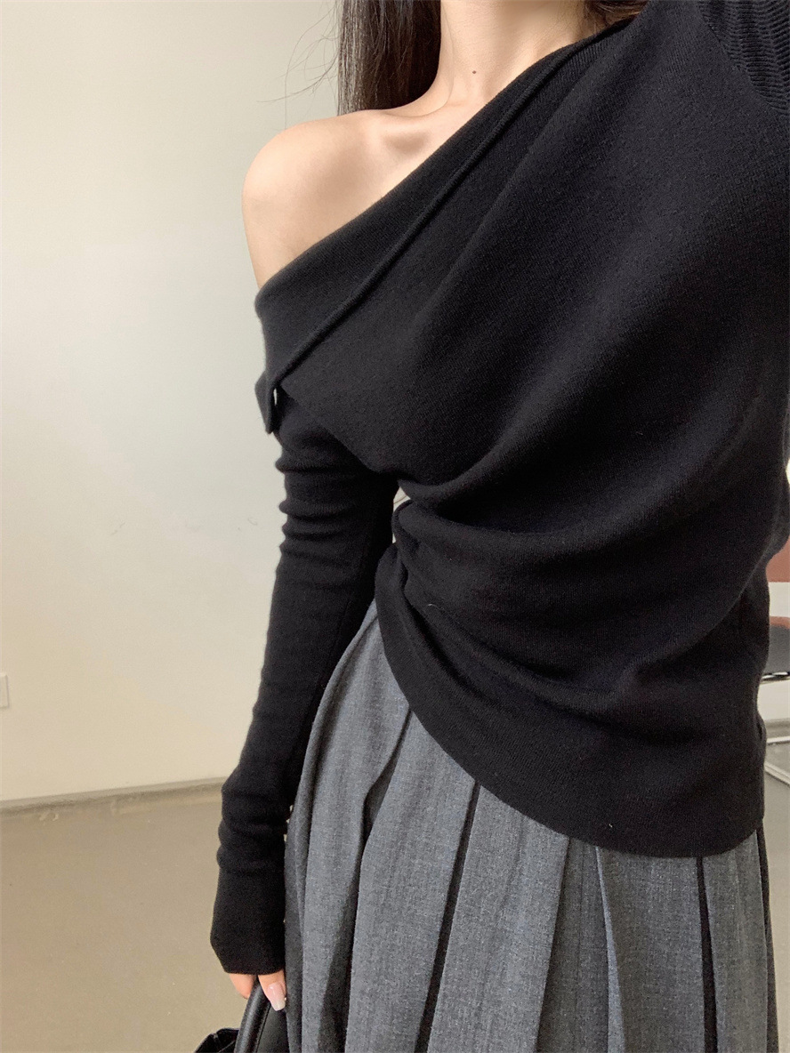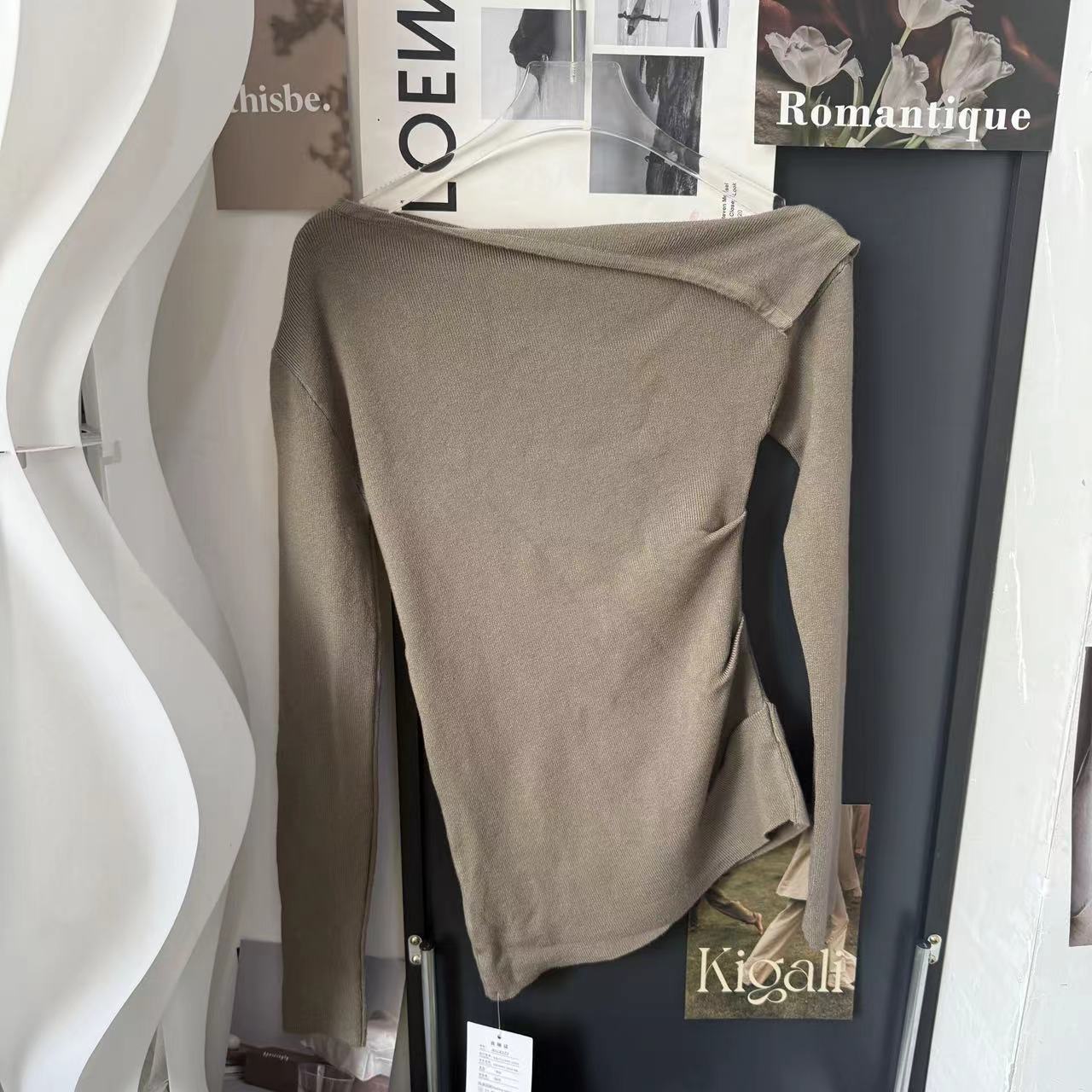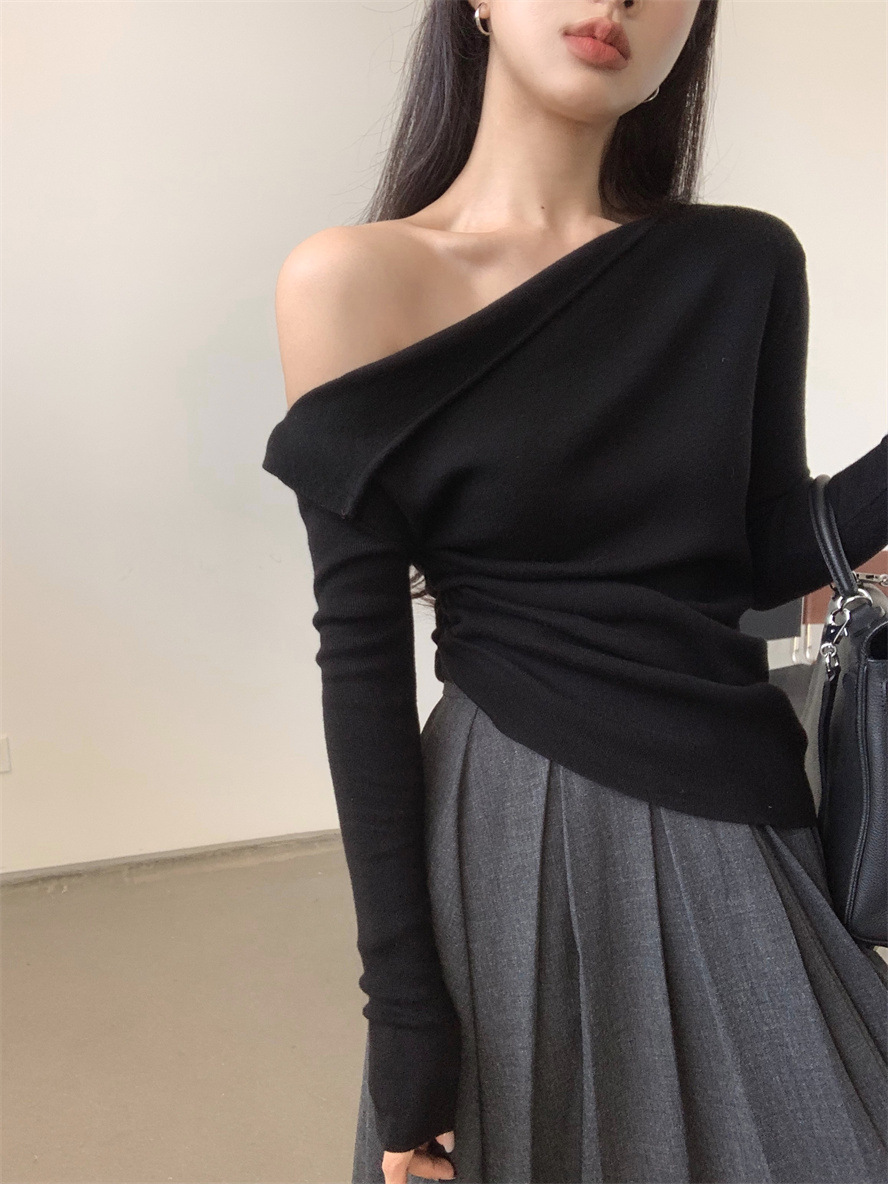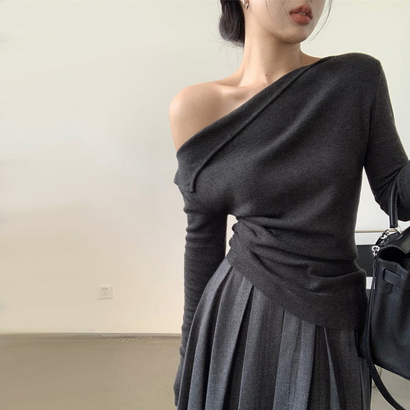 하이엔드 니치 디자인의 오프숄더 밑단 셔츠, 긴팔 스웨터, 중간길이, 복고풍, 시크하고 패셔너블한 스타일