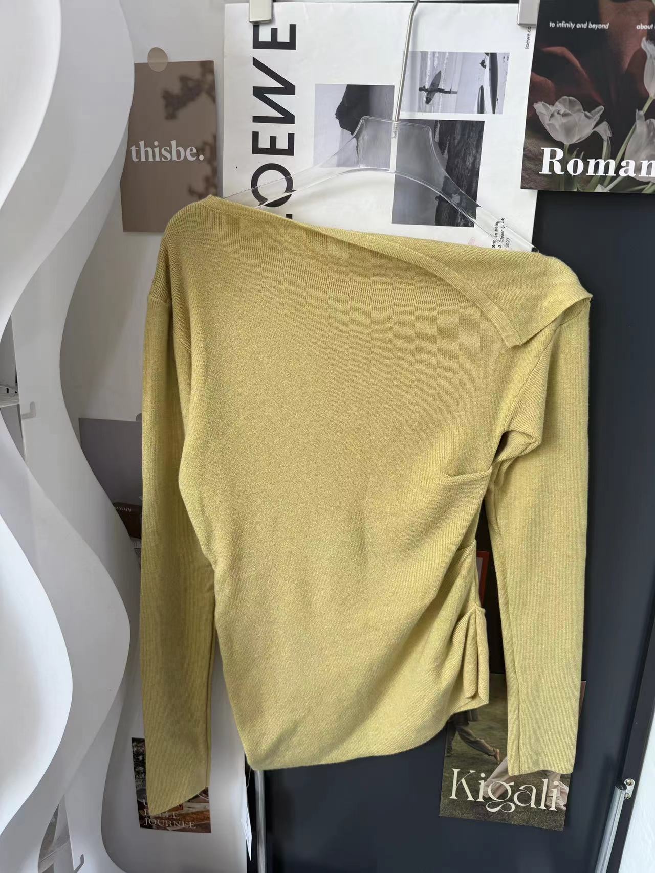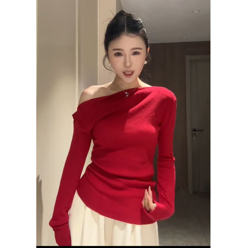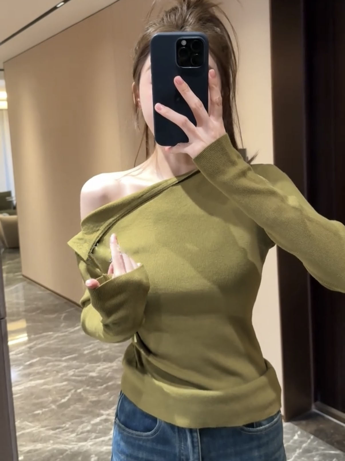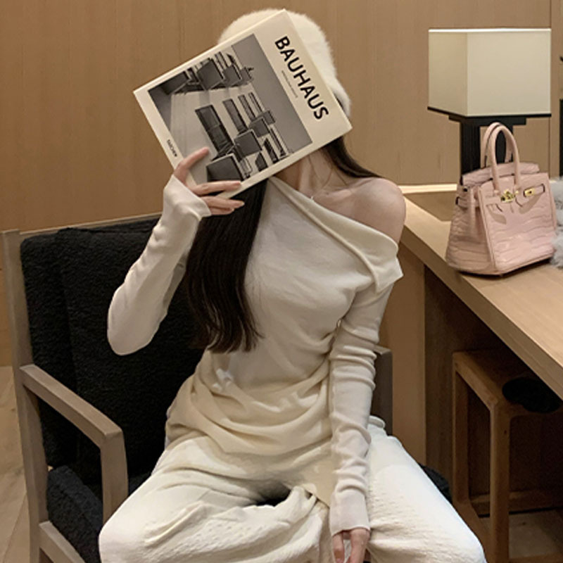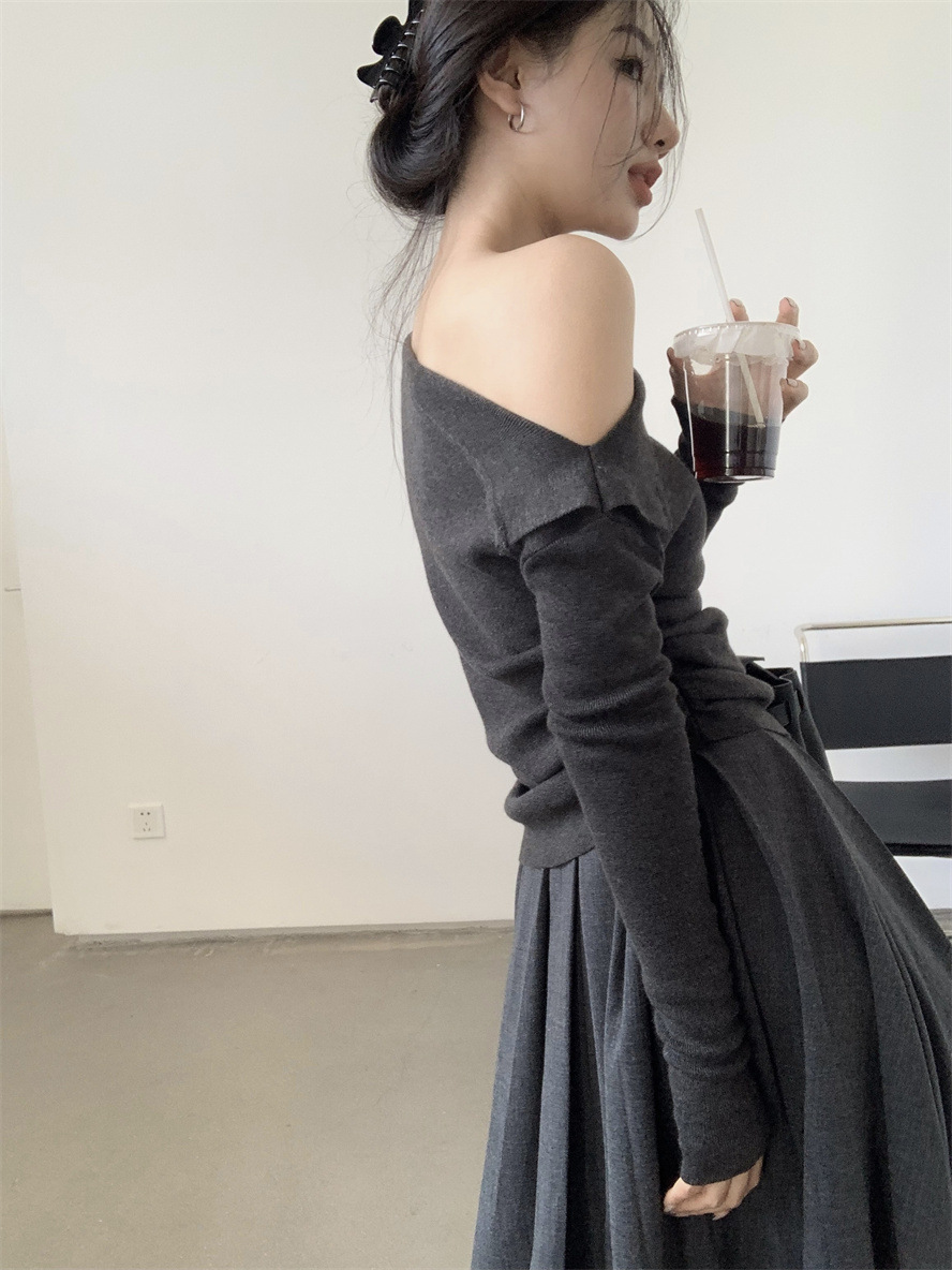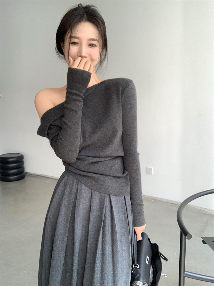 하이엔드 니치 디자인의 오프숄더 밑단 셔츠, 긴팔 스웨터, 중간길이, 복고풍, 시크하고 패셔너블한 스타일
