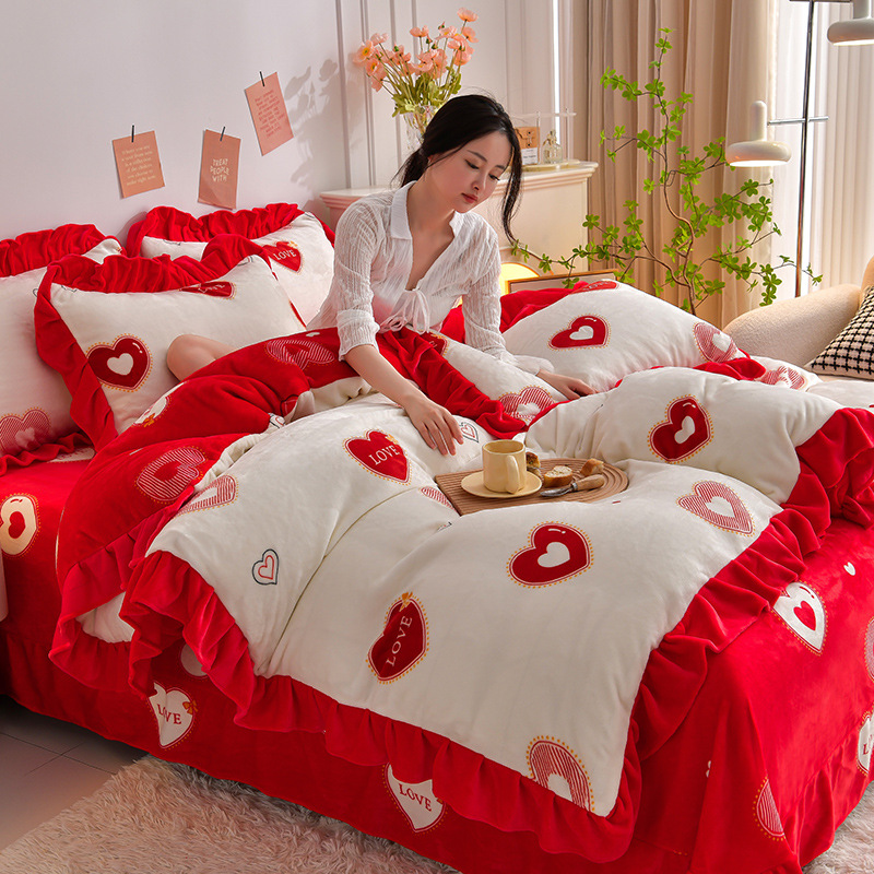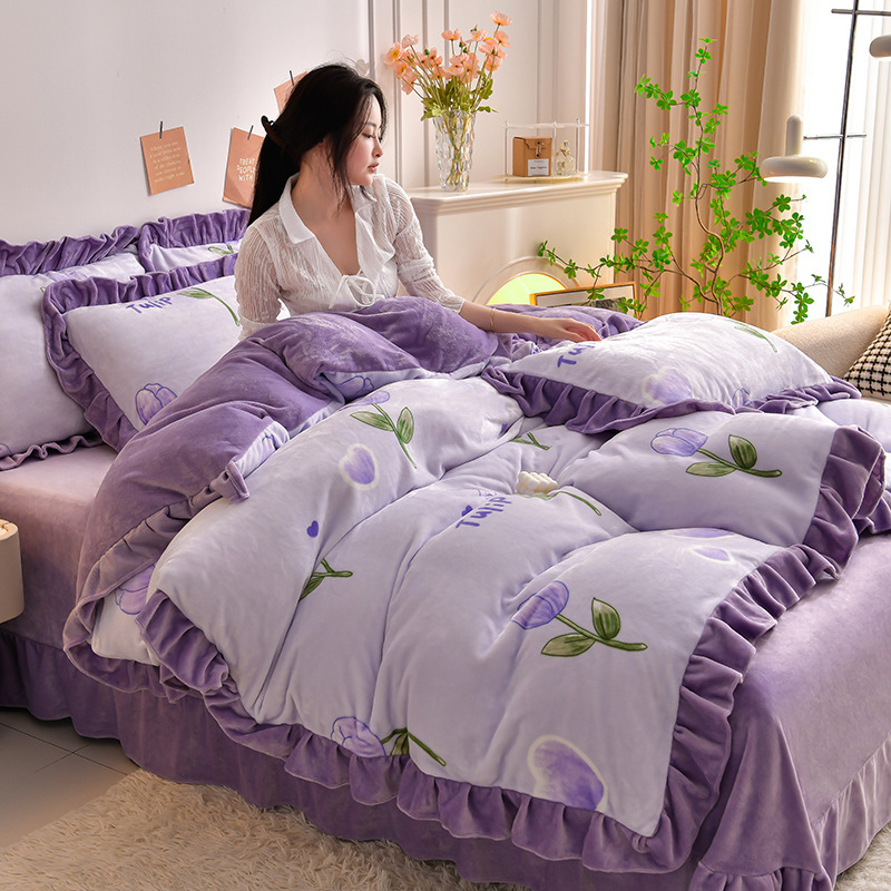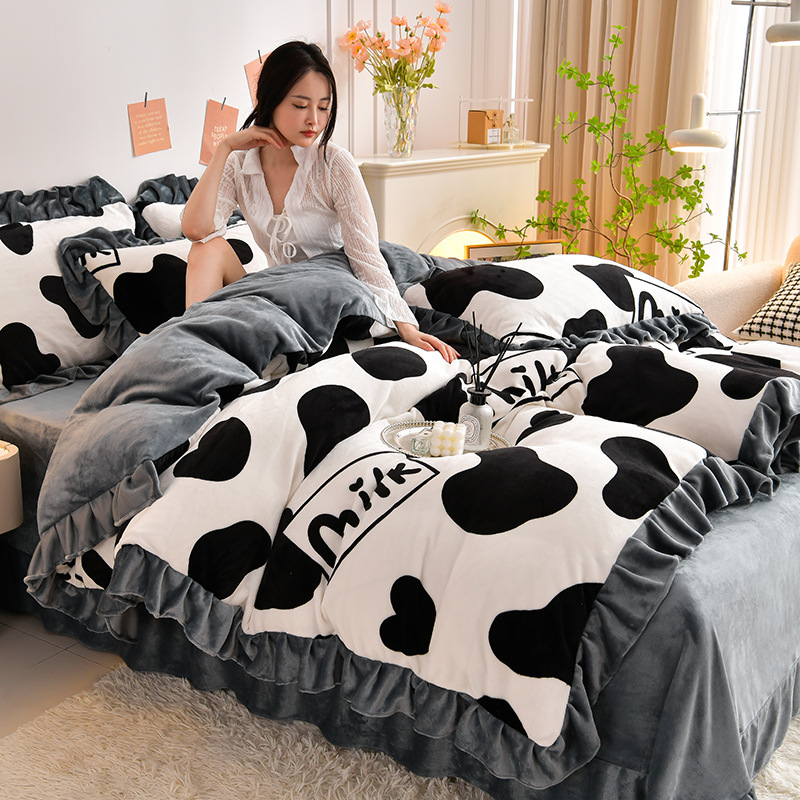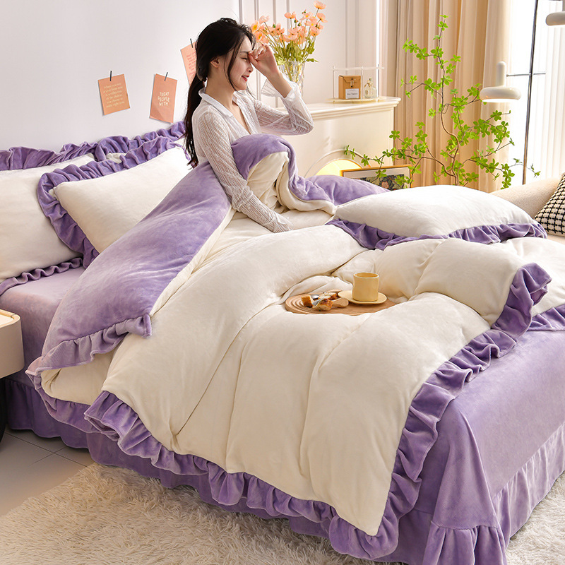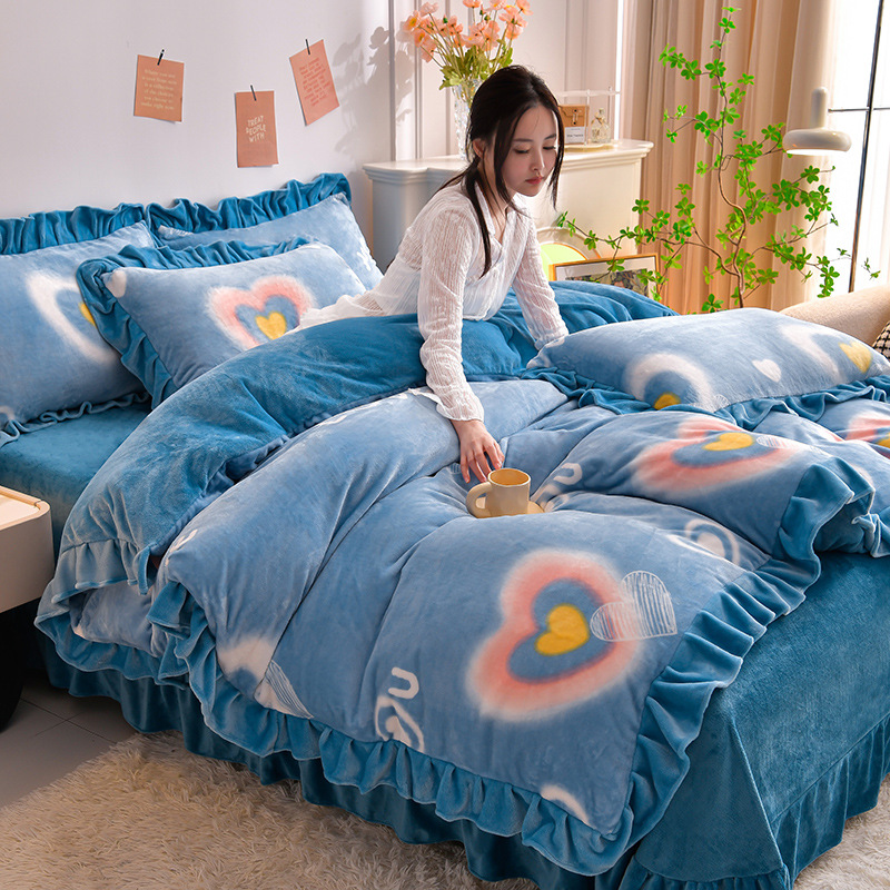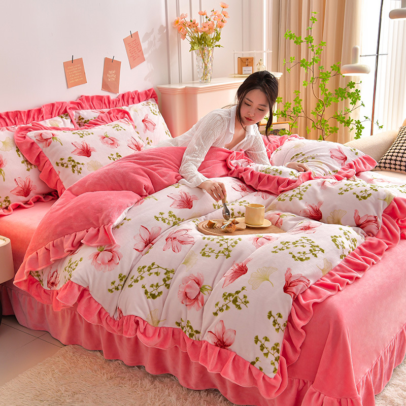 공장 도매 레이스 밀크 벨벳 4 종 세트 두꺼운 가을과 겨울 폭발 키트 공주 바람 침구 벨벳 4 종 세트