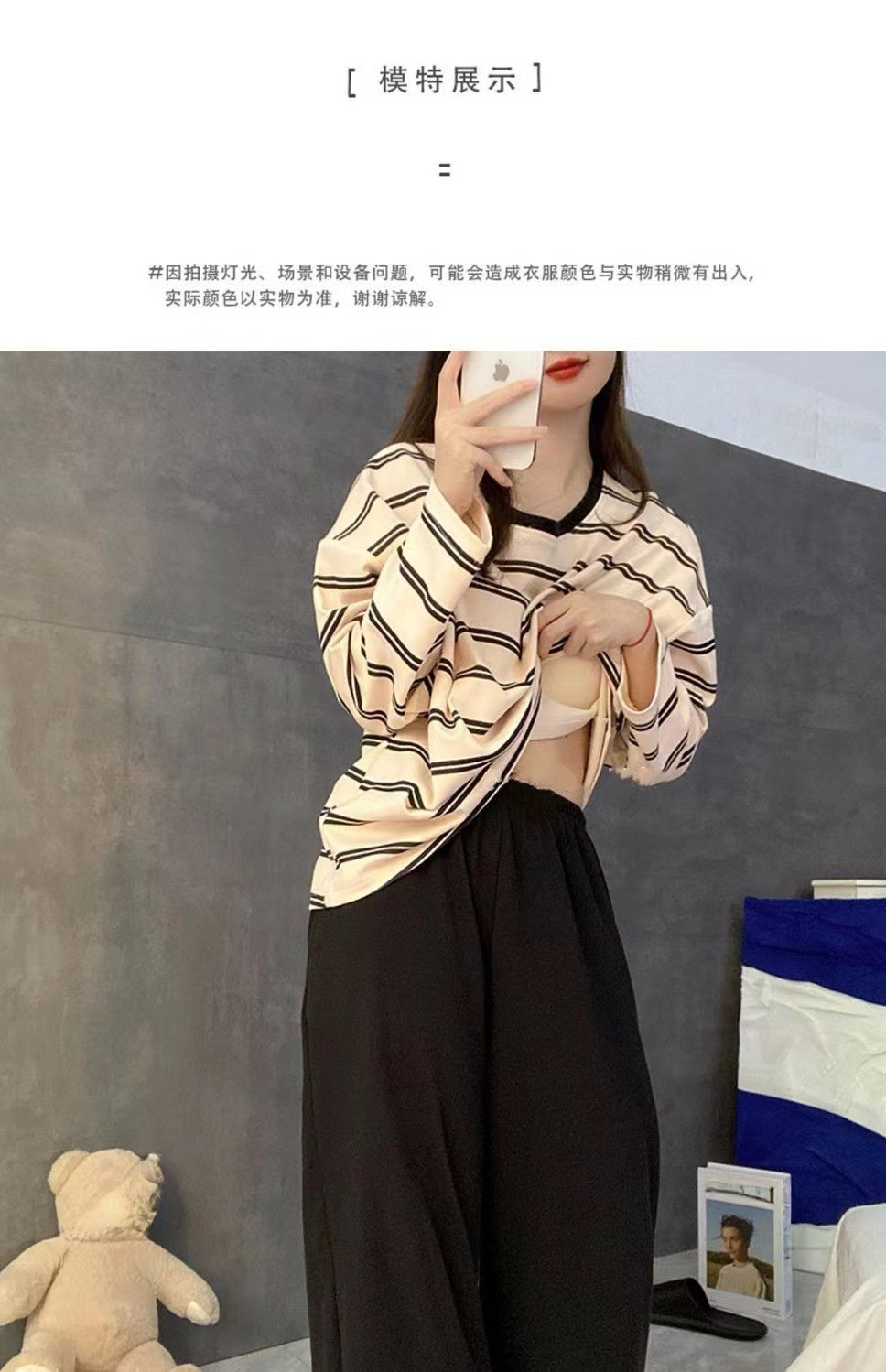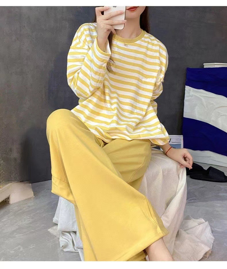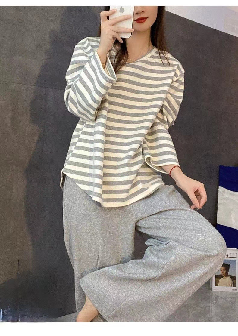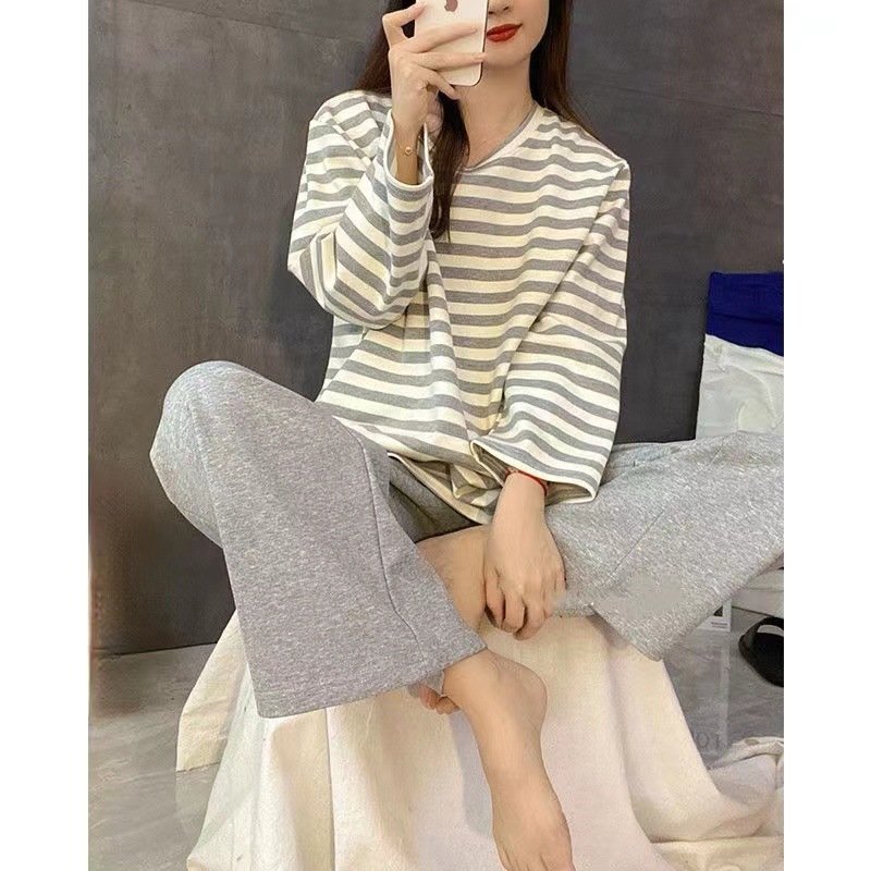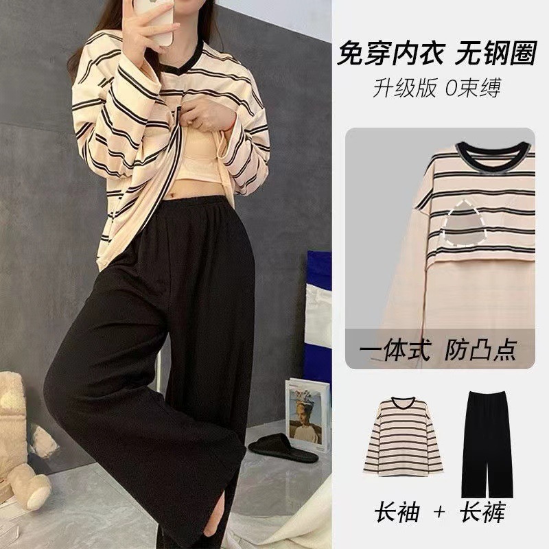 여성용 가슴 패드 잠옷이 달린 스트라이프 긴팔 바지 봄과 가을 간단한 캐주얼 느슨한 학생 홈웨어는 외부에서 착용 할 수 있습니다.스토어 가기