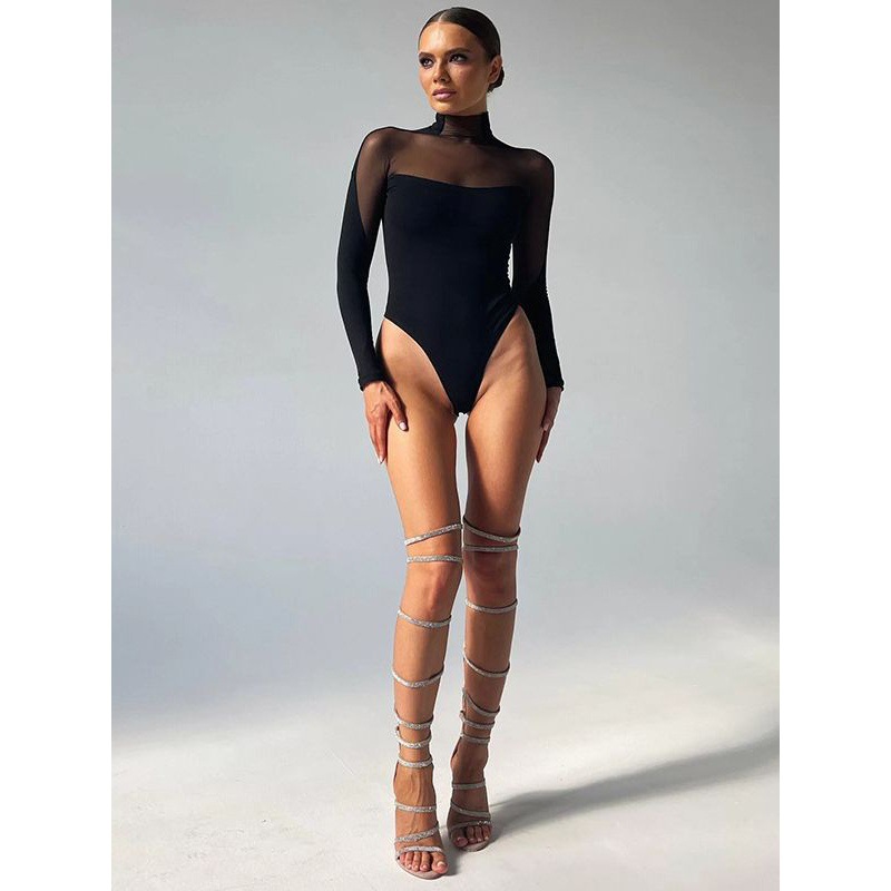 유럽과 미국의 대외 무역 국경 간 여성 의류 AliExpress Amazon ins 섹시한 메쉬 스플 라이스 긴팔 점프 슈트 탑 티셔츠스토어 가기