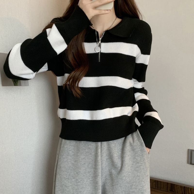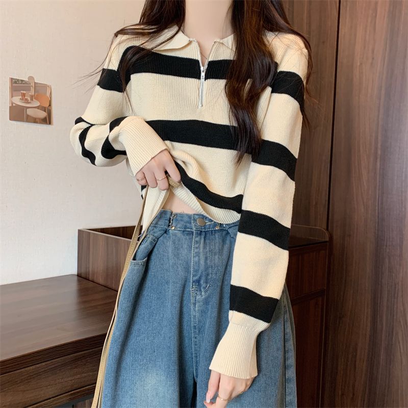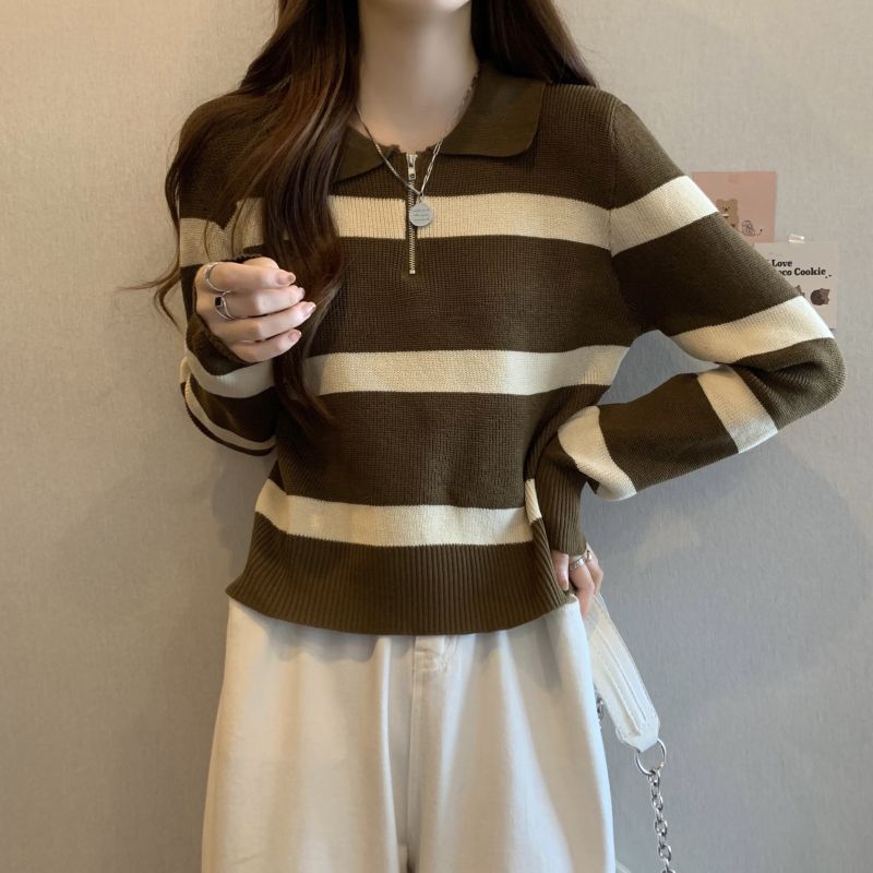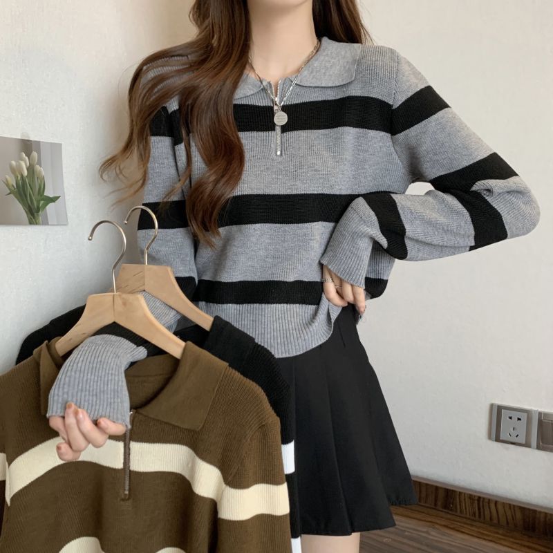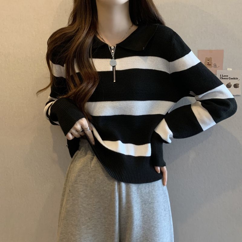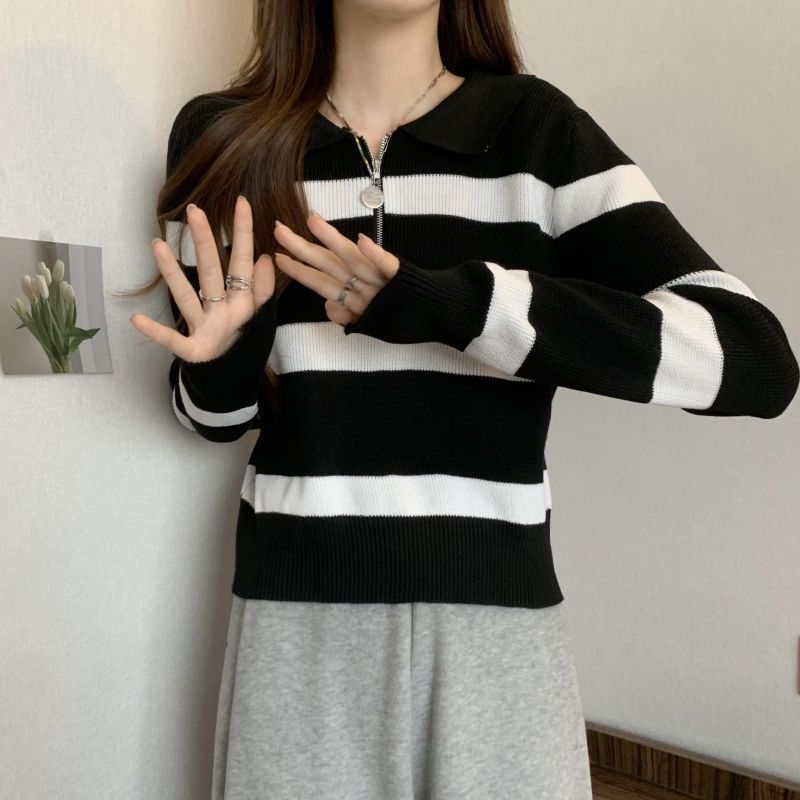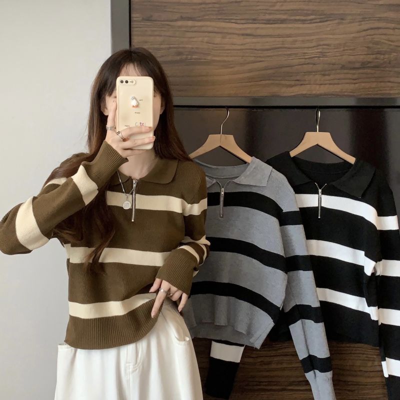레트로 배색 스트라이프 반지퍼 풀오버 니트 여성용 2025 가을 신상 이너웨어 디자인 탑스토어 가기