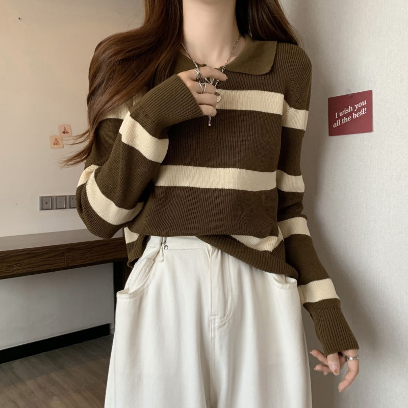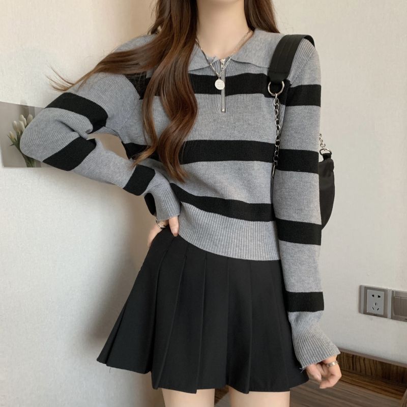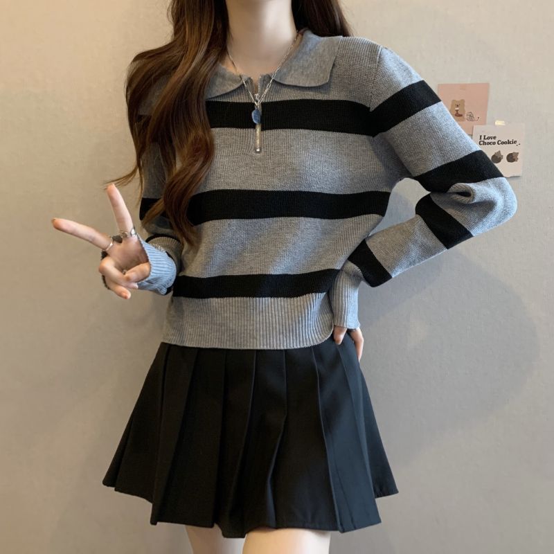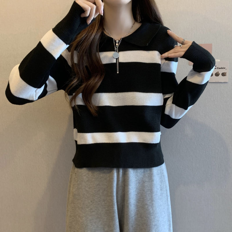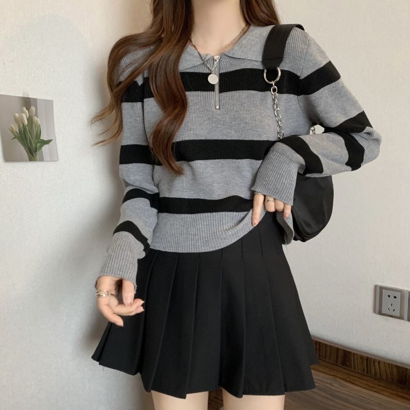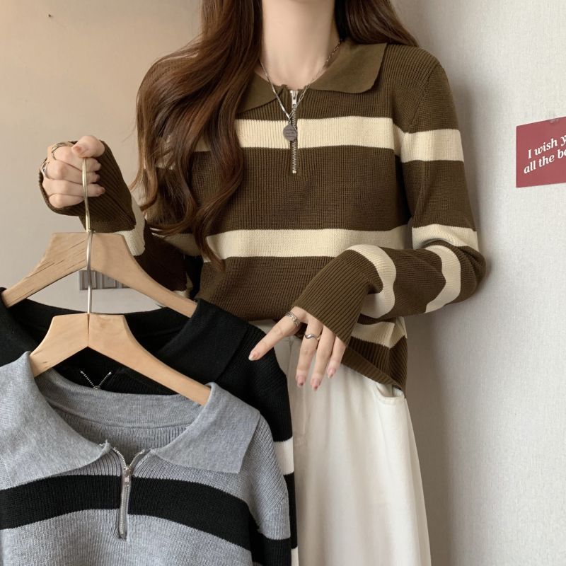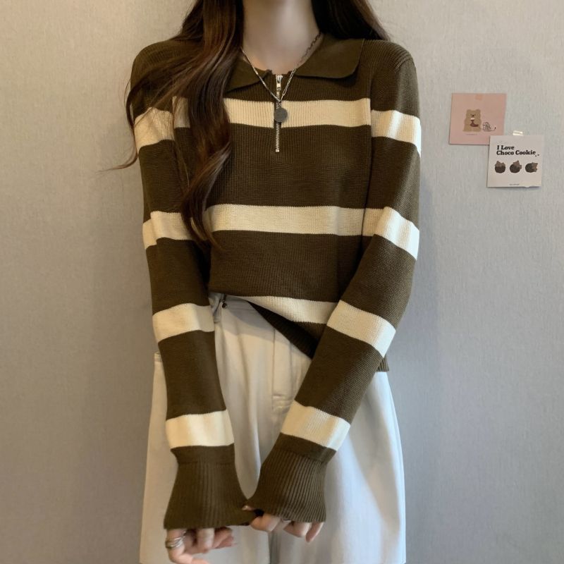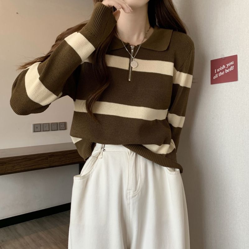 레트로 배색 스트라이프 반지퍼 풀오버 니트 여성용 2025 가을 신상 이너웨어 디자인 탑스토어 가기