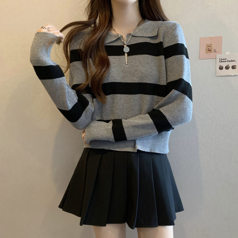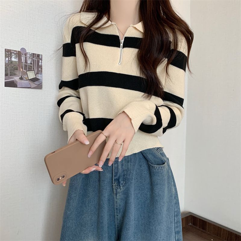 레트로 배색 스트라이프 반지퍼 풀오버 니트 여성용 2025 가을 신상 이너웨어 디자인 탑