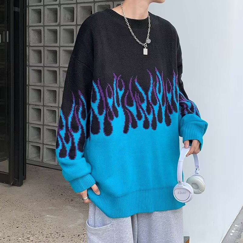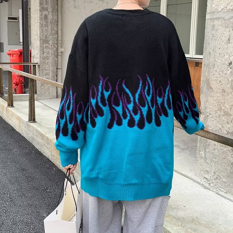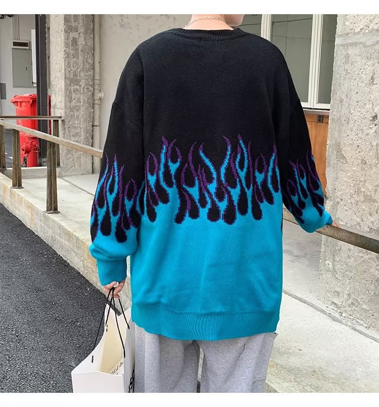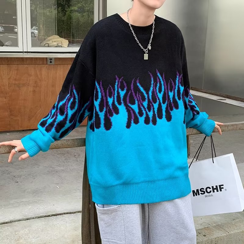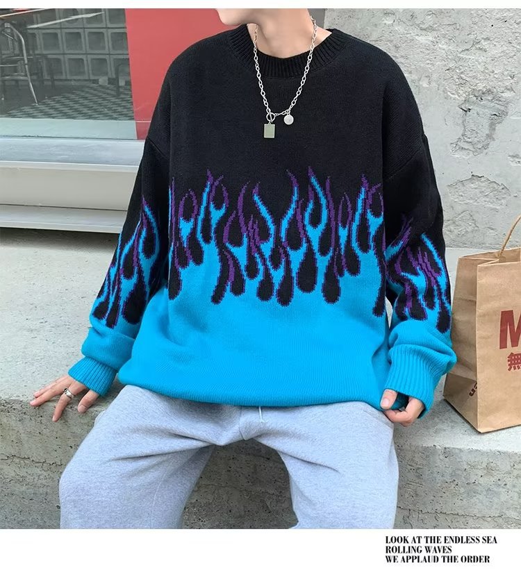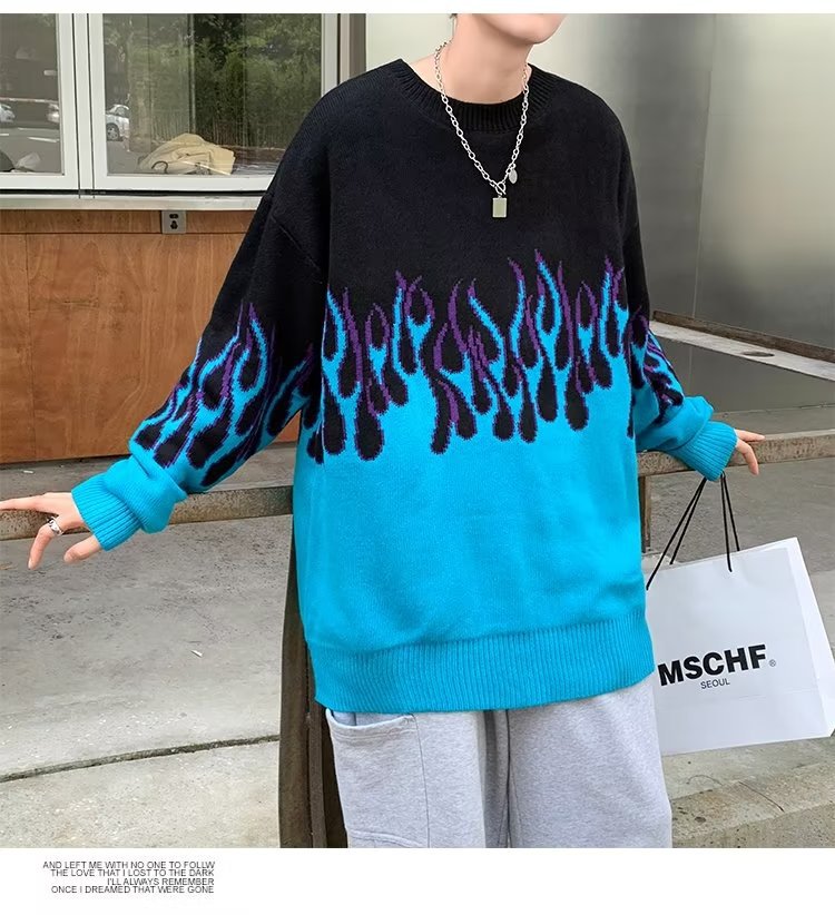힙합 불꽃 자카드 스웨터 남성용 홍콩 스타일 패션 브랜드 게으른 스타일 커플 풀오버 가을과 겨울 와이드 스웨터 탑스토어 가기