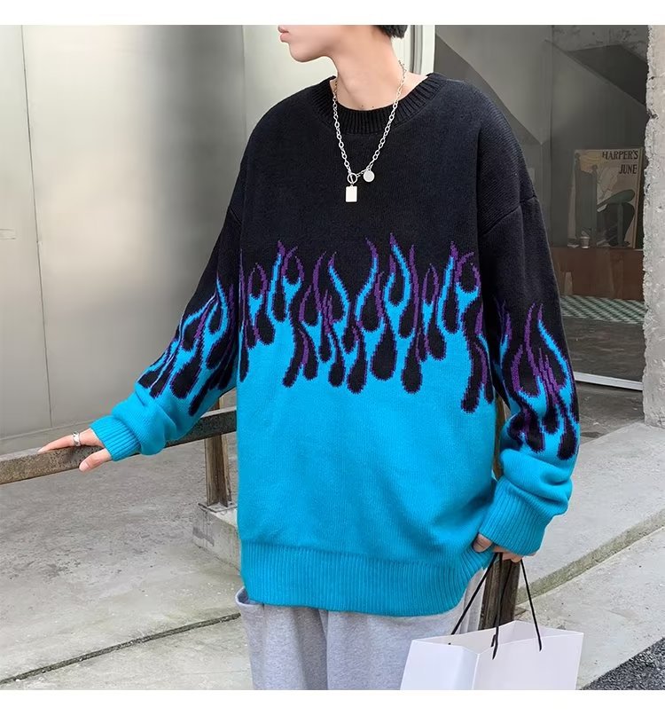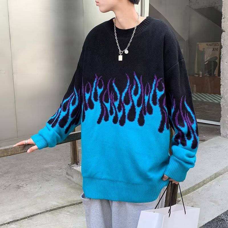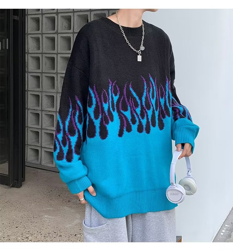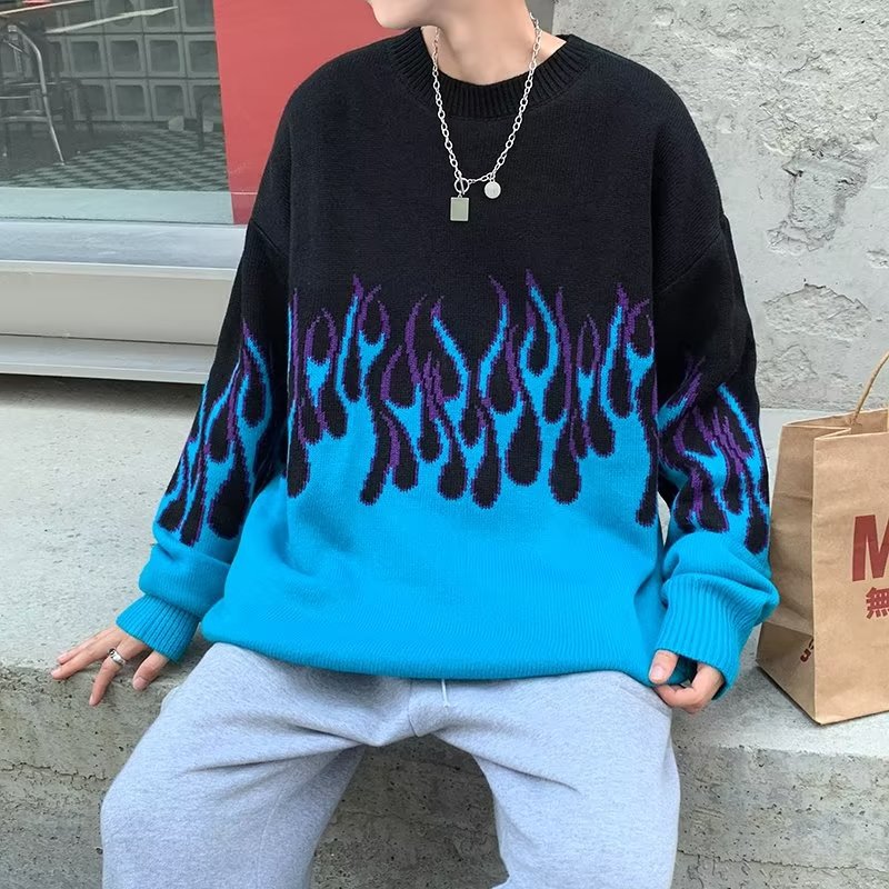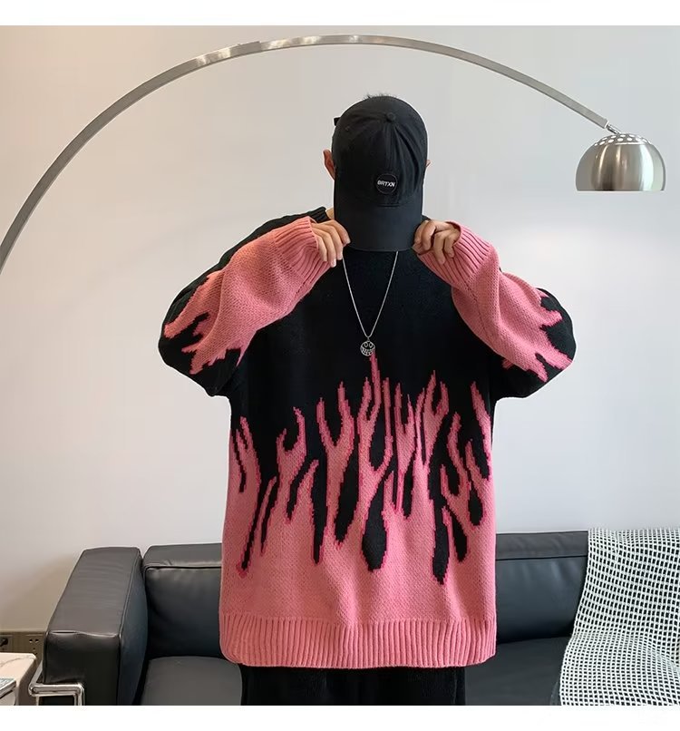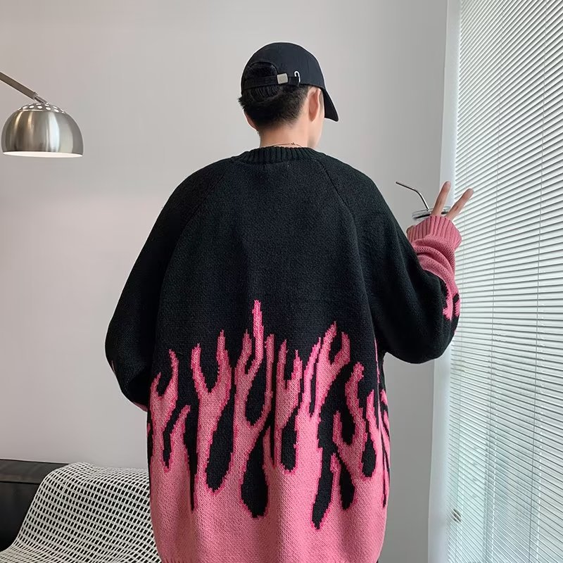 힙합 불꽃 자카드 스웨터 남성용 홍콩 스타일 패션 브랜드 게으른 스타일 커플 풀오버 가을과 겨울 와이드 스웨터 탑