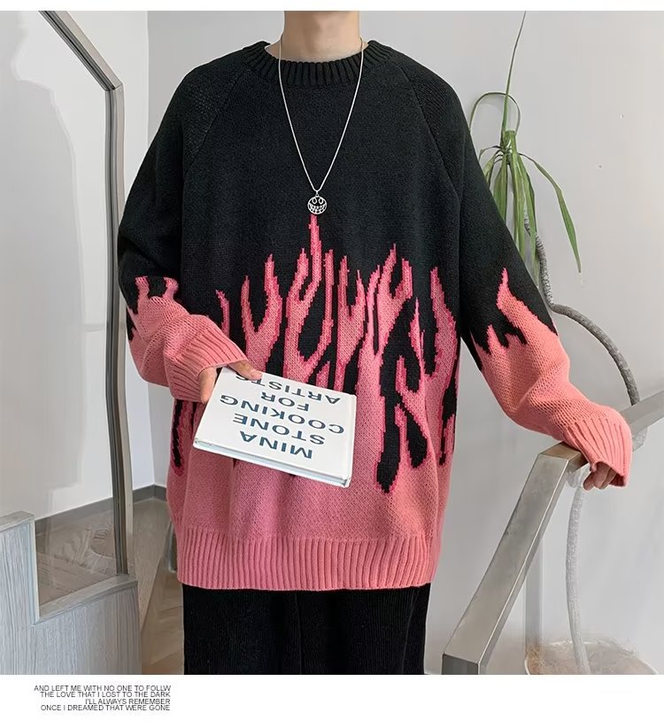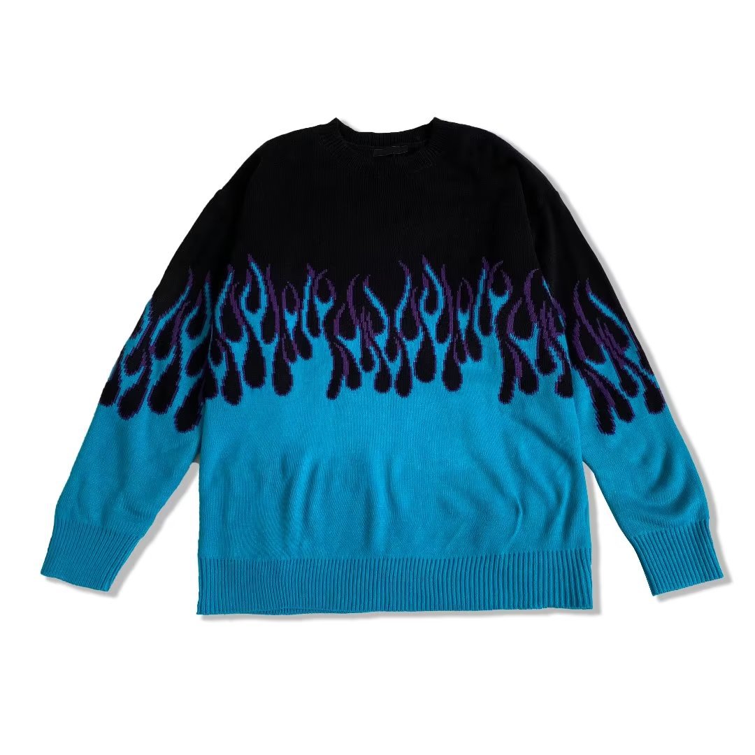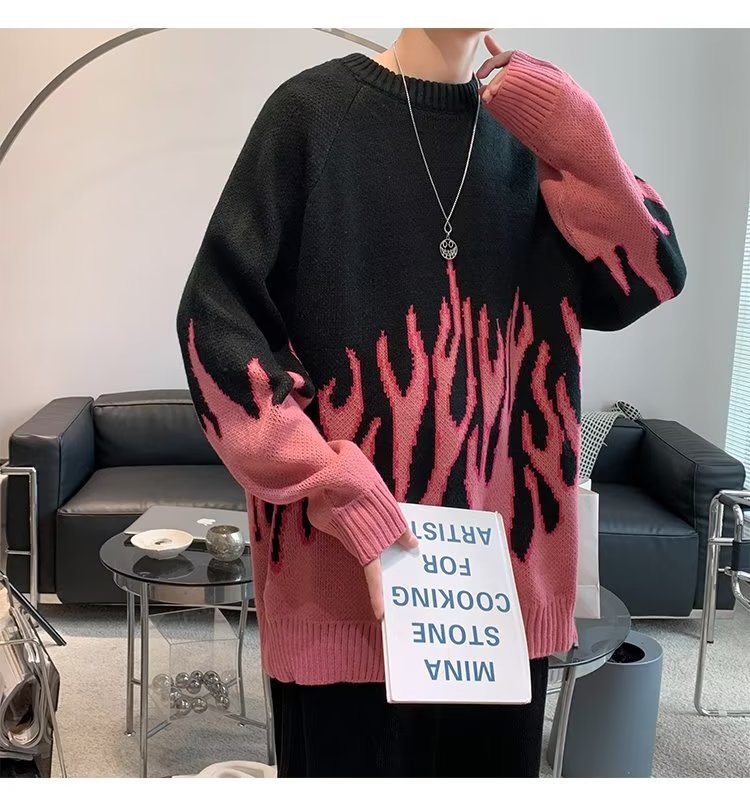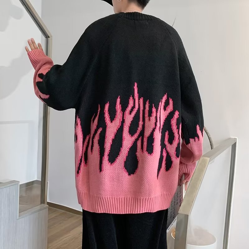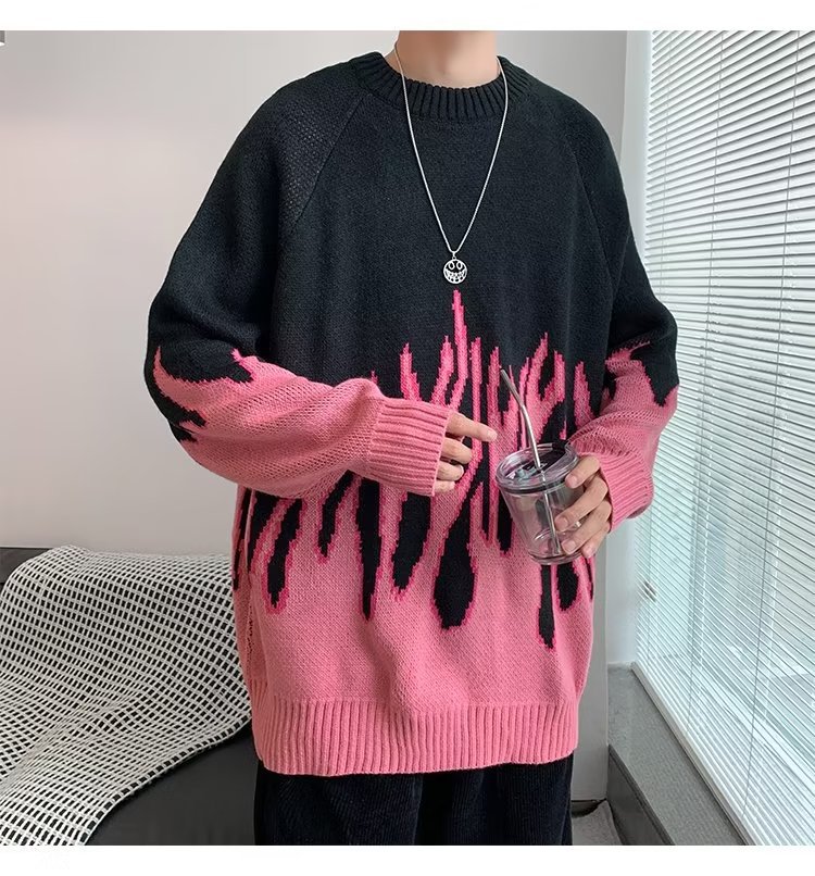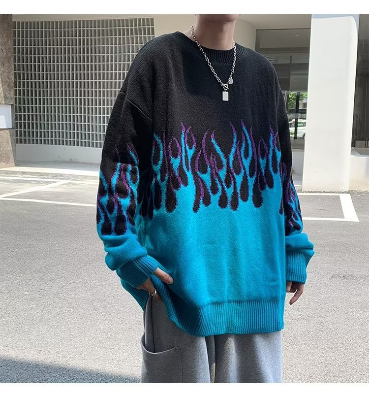 힙합 불꽃 자카드 스웨터 남성용 홍콩 스타일 패션 브랜드 게으른 스타일 커플 풀오버 가을과 겨울 와이드 스웨터 탑