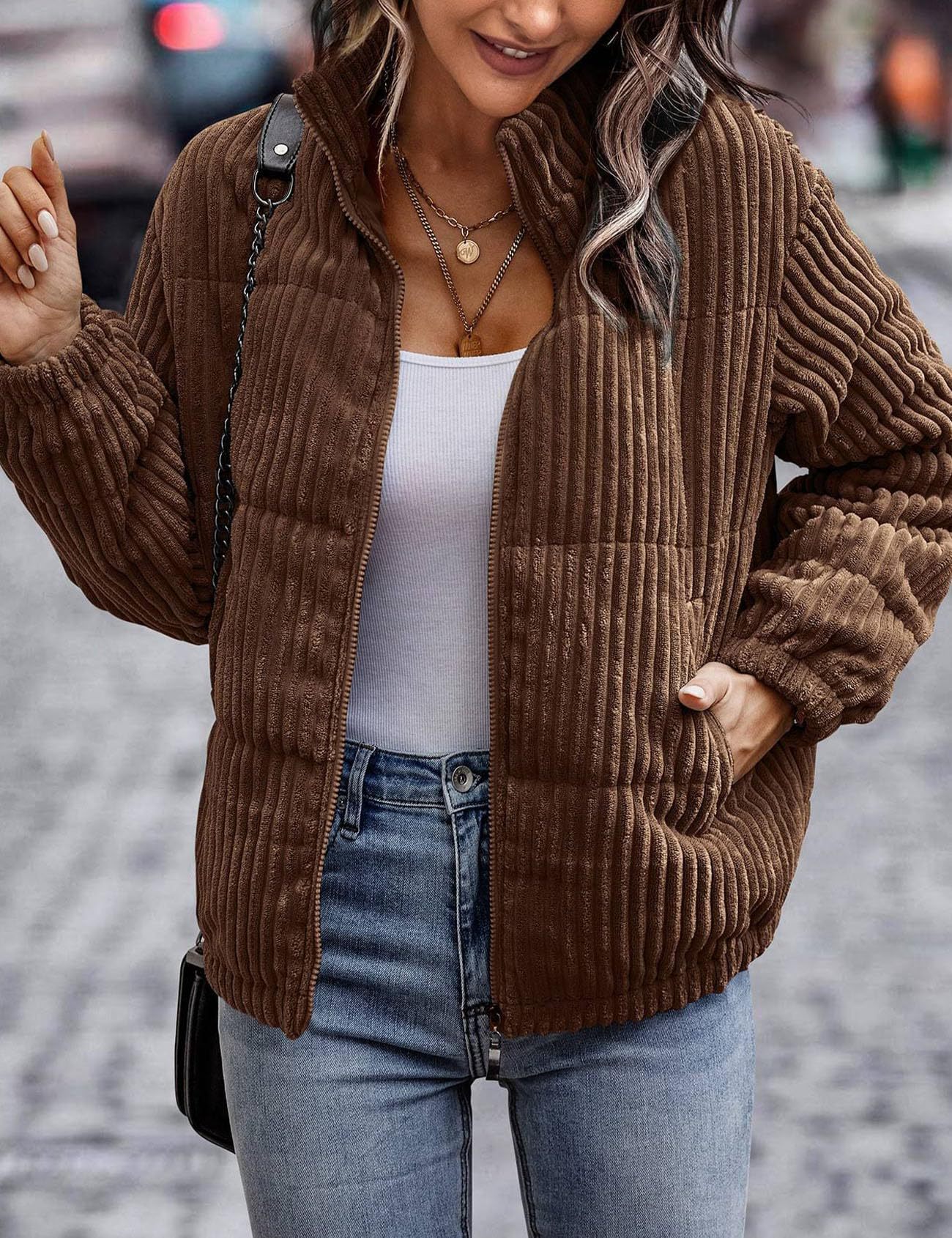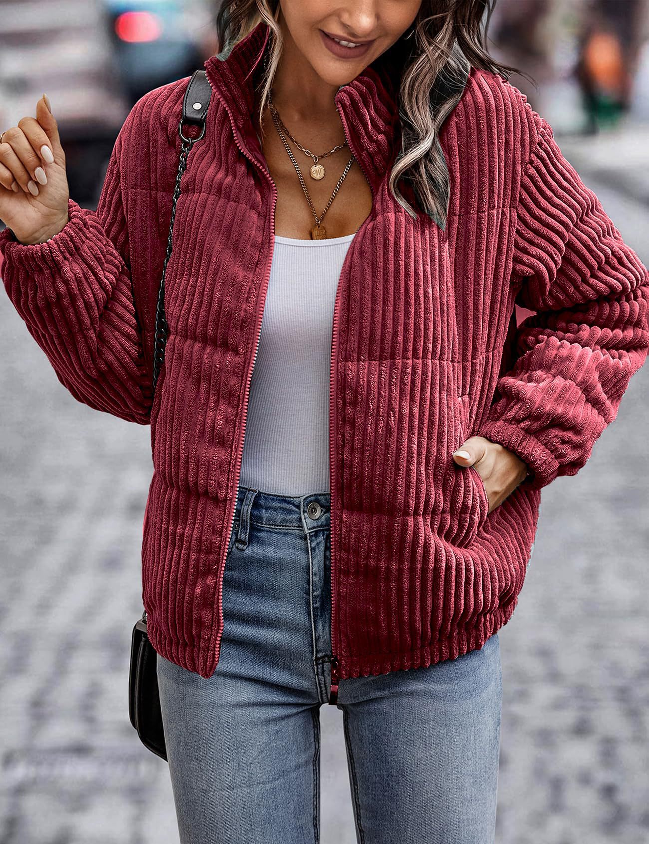 2024년 크로스보더 여성 의류 가을 겨울 코듀로이 스탠드 칼라 긴팔 숏 포켓 재킷 두꺼운 면 코트