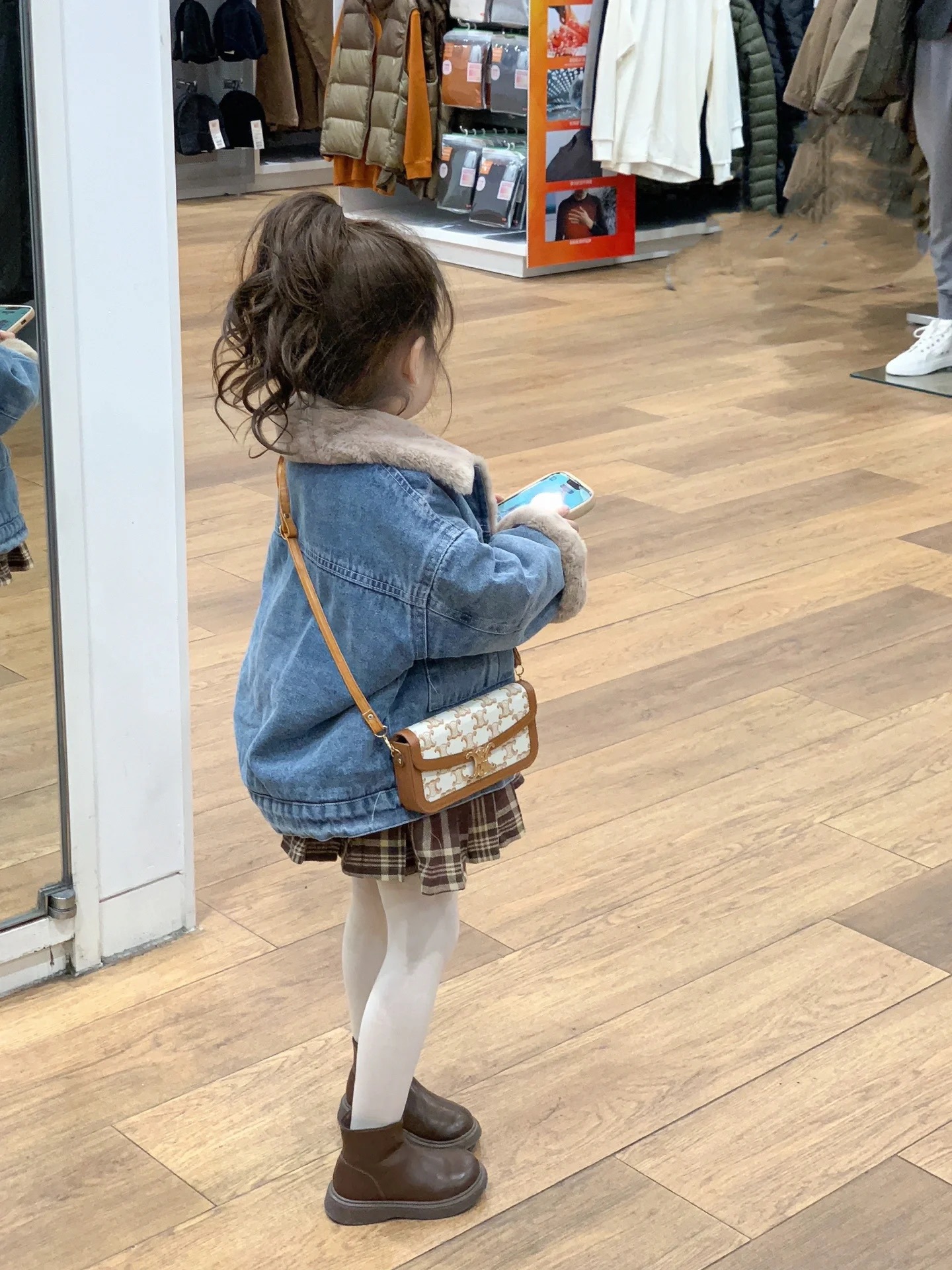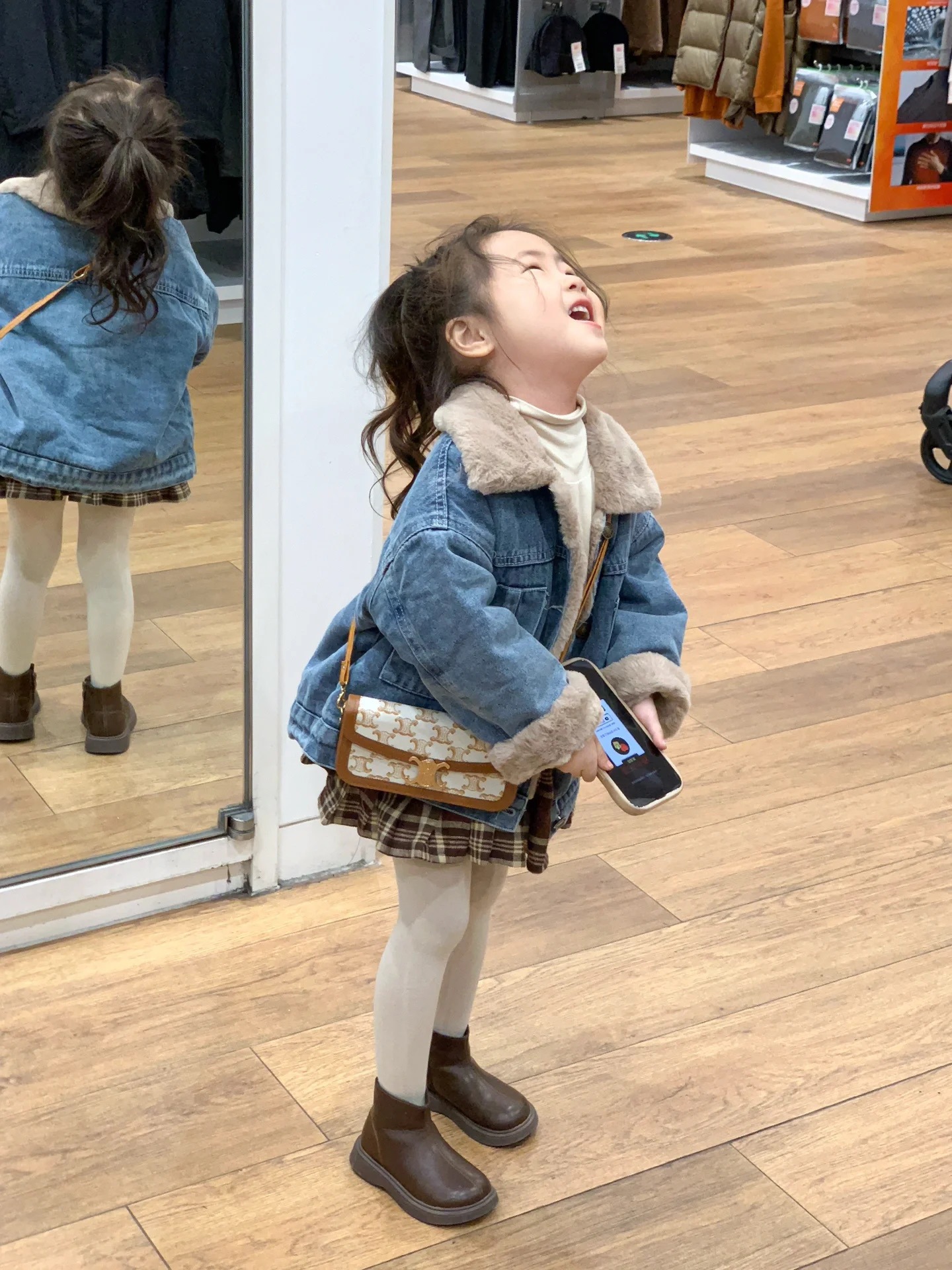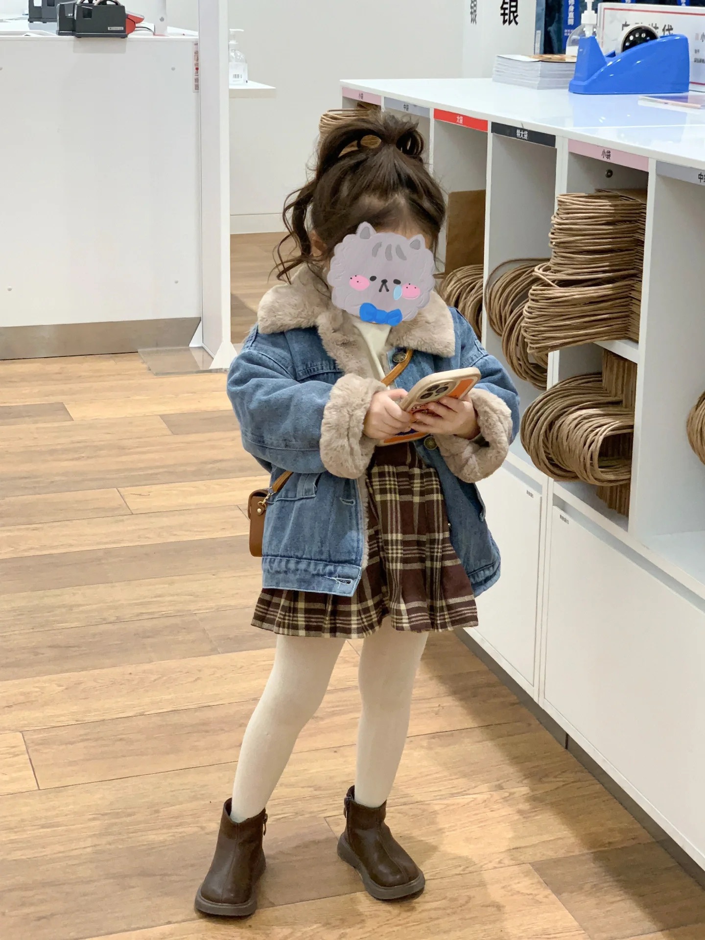 어린이 기모 재킷 2023 가을과 겨울 의류 소년과 소녀 한국 회색 토끼 모피 내부 따뜻한 두꺼운 데님 코트스토어 가기