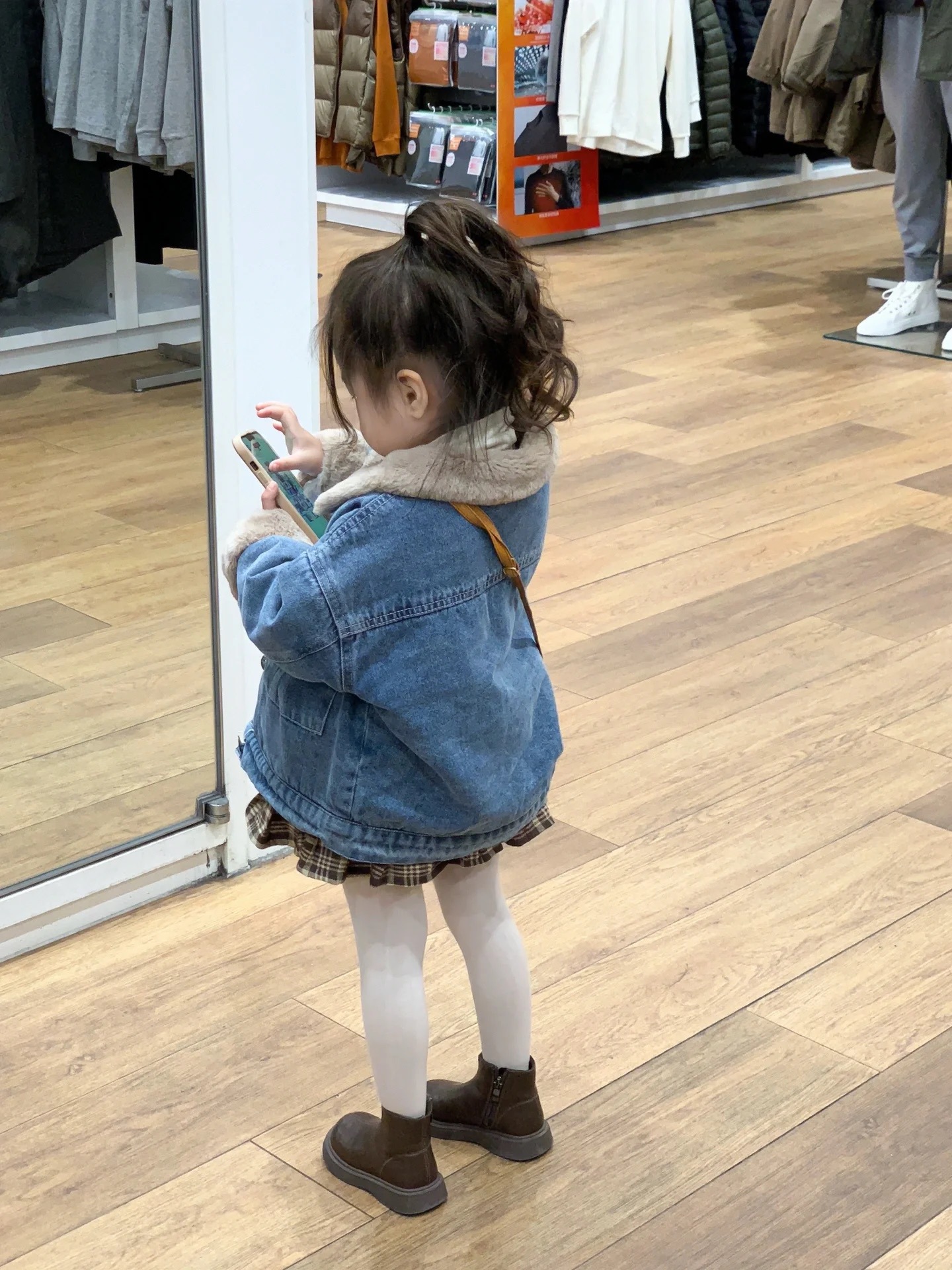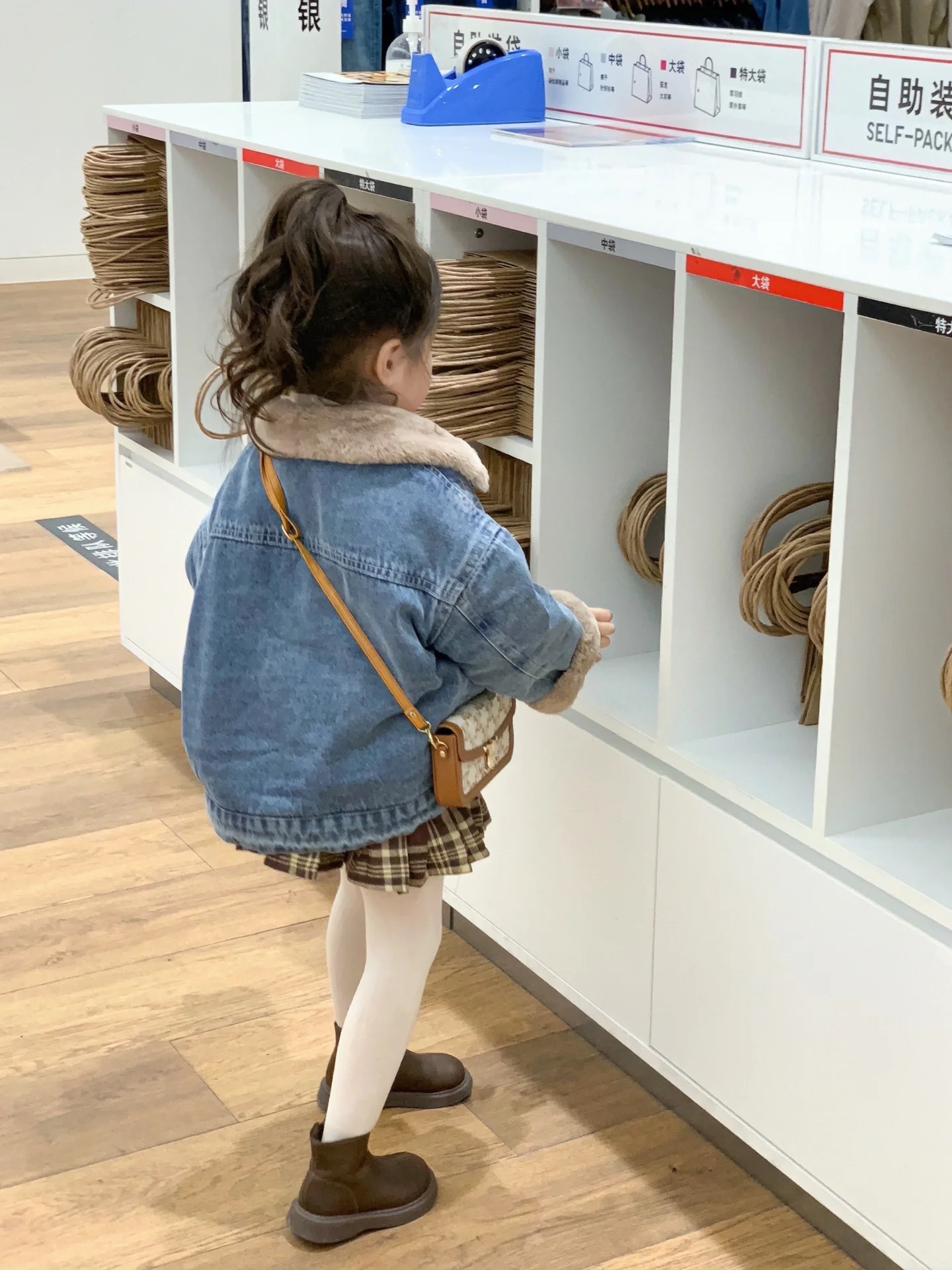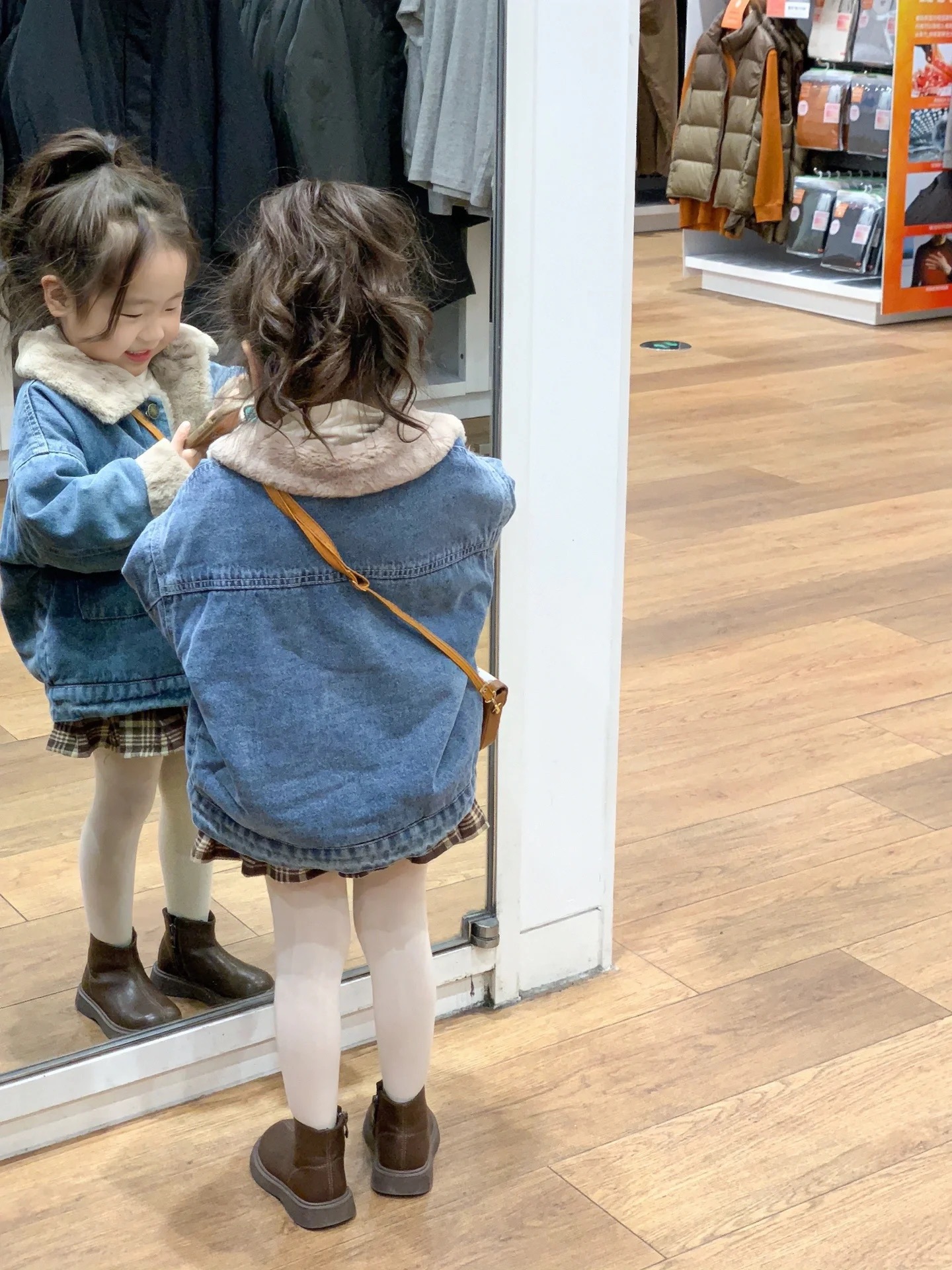 어린이 기모 재킷 2023 가을과 겨울 의류 소년과 소녀 한국 회색 토끼 모피 내부 따뜻한 두꺼운 데님 코트스토어 가기