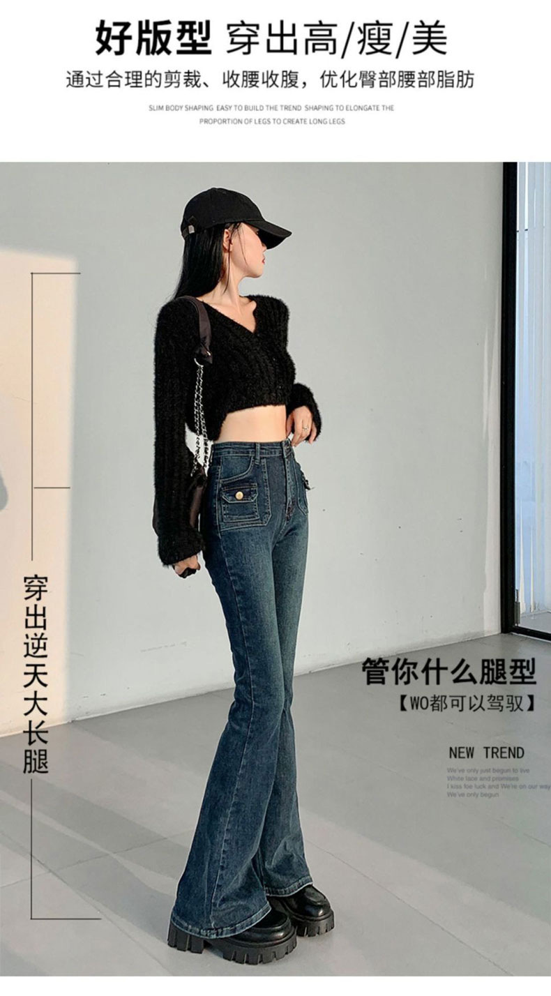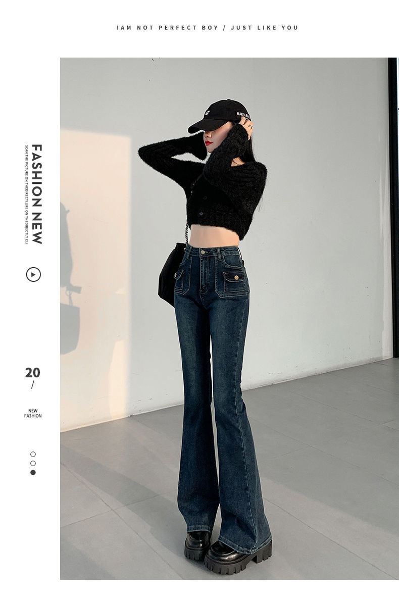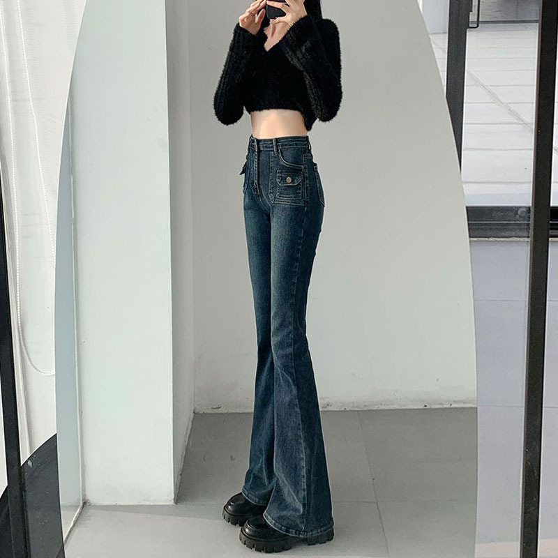 블루 그레이 슬림 핏 바지 아메리칸 스타일 멀티 포켓 틈새 디자인 마이크로 혼 호스슈 여성용 하이 웨이스트 스트레치 진