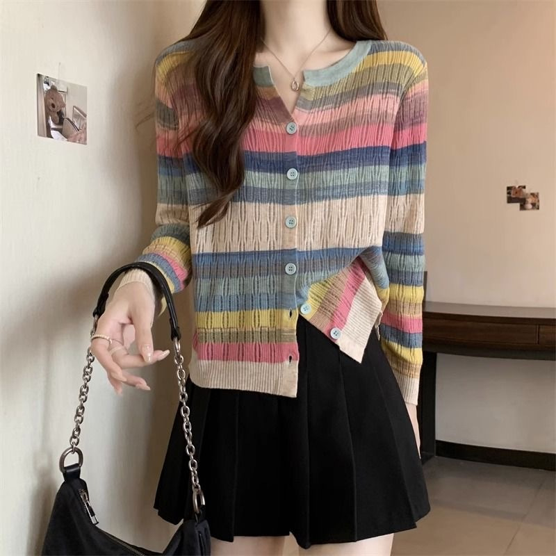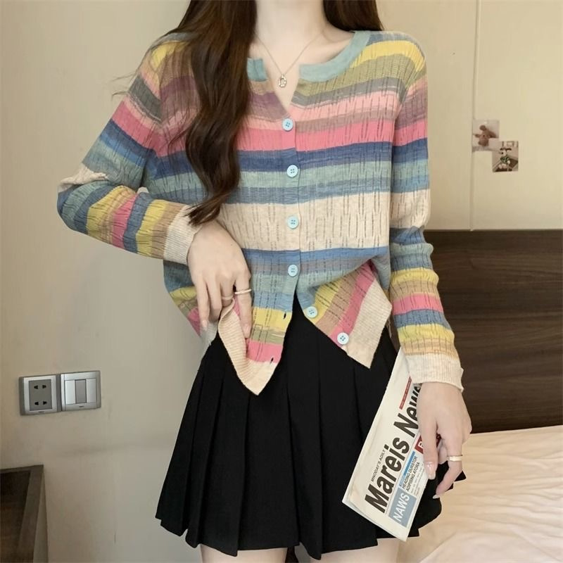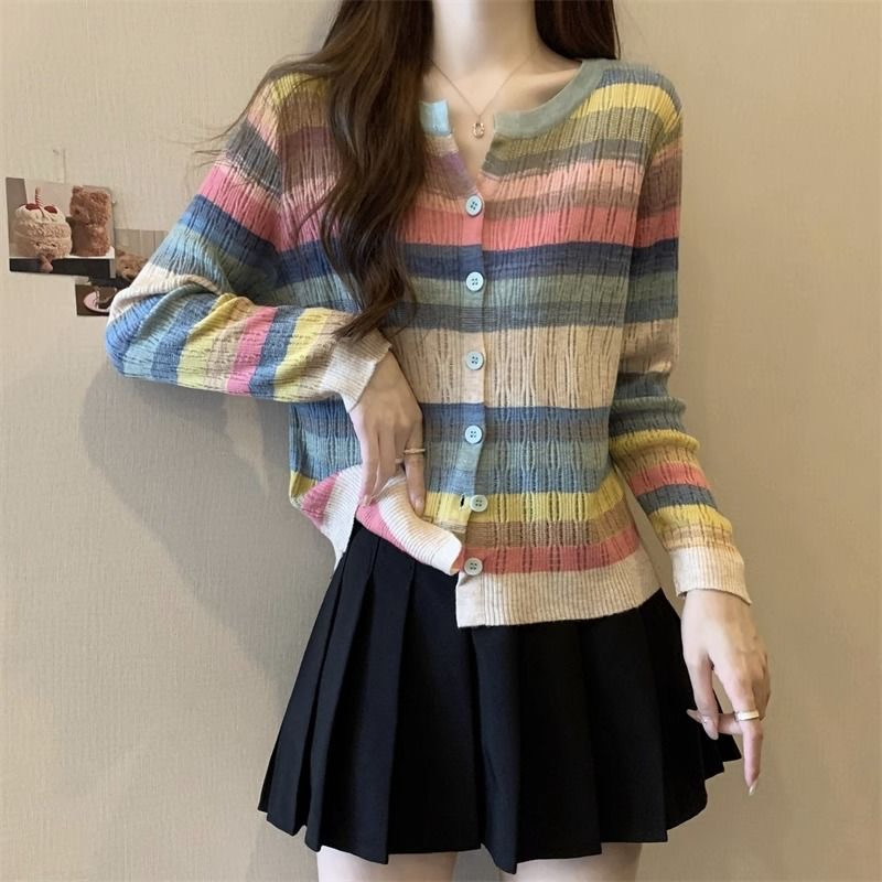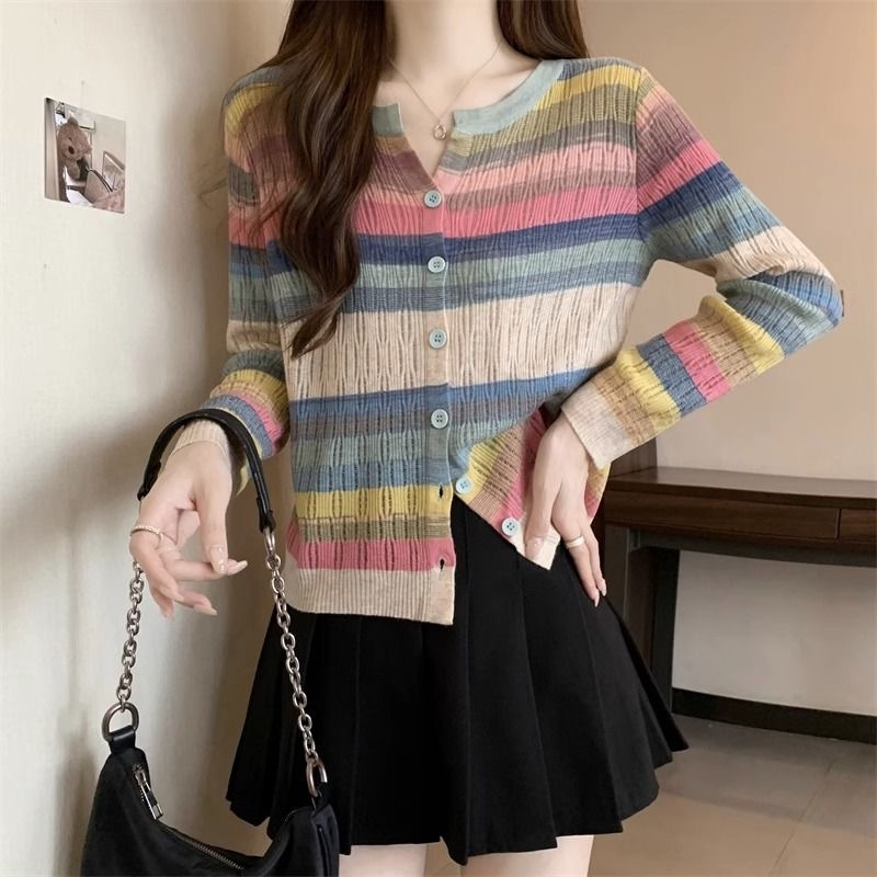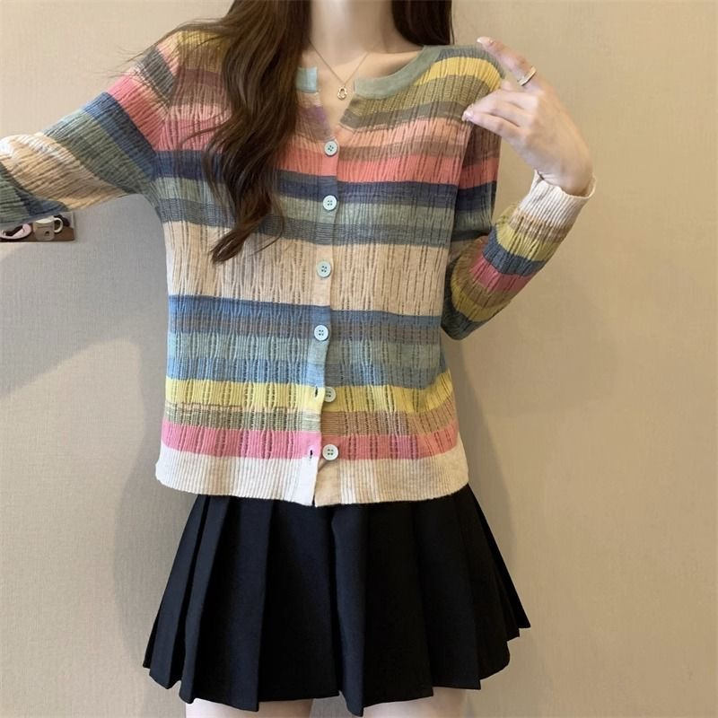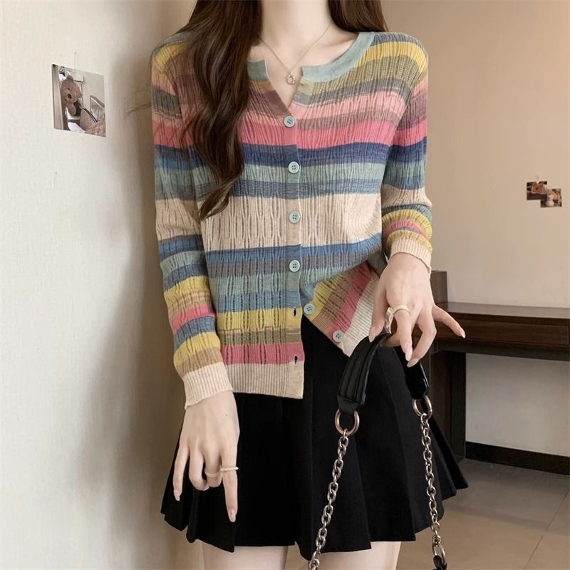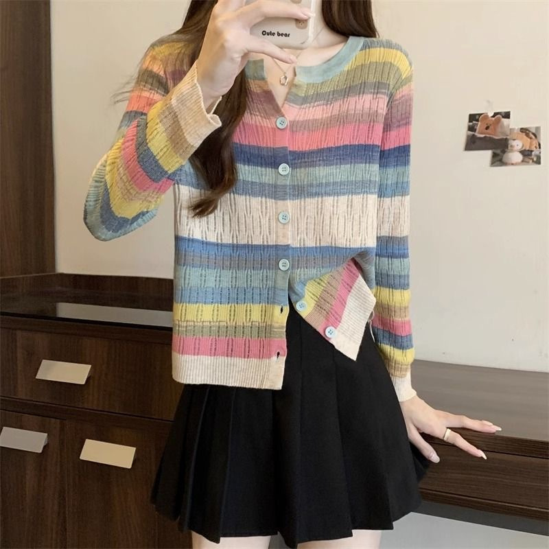 2023 새로운 가을 무지개 줄무늬 라운드 넥 한국 스타일 긴팔 니트 카디건 여성을위한 느슨한 슬리밍 중공 스웨터