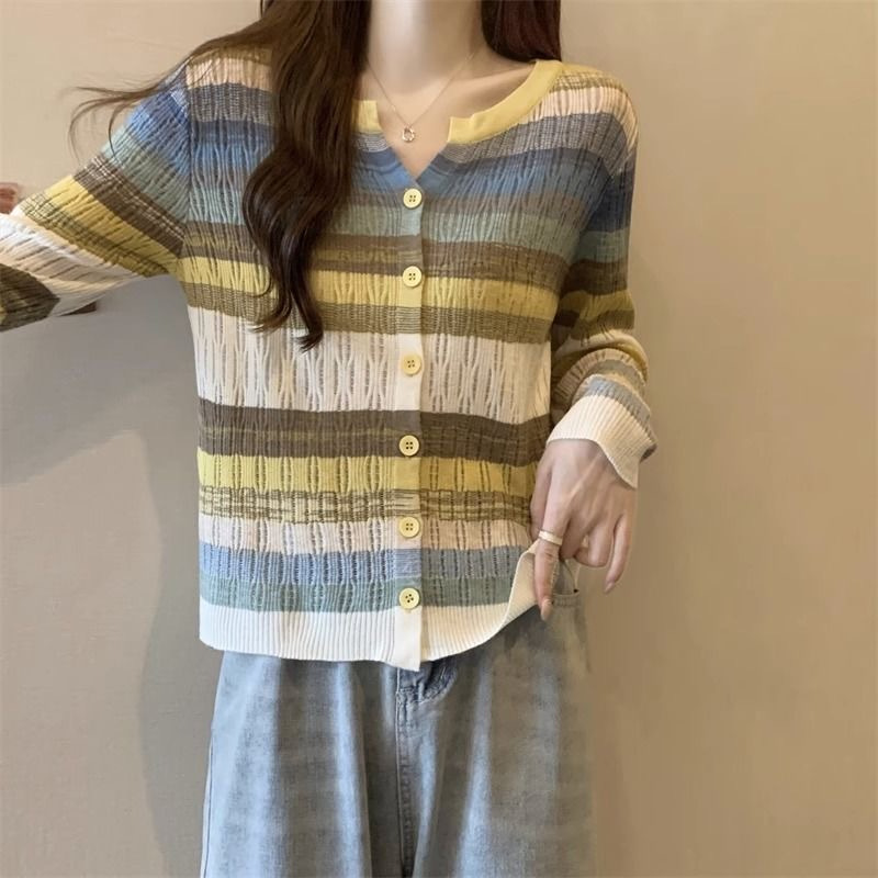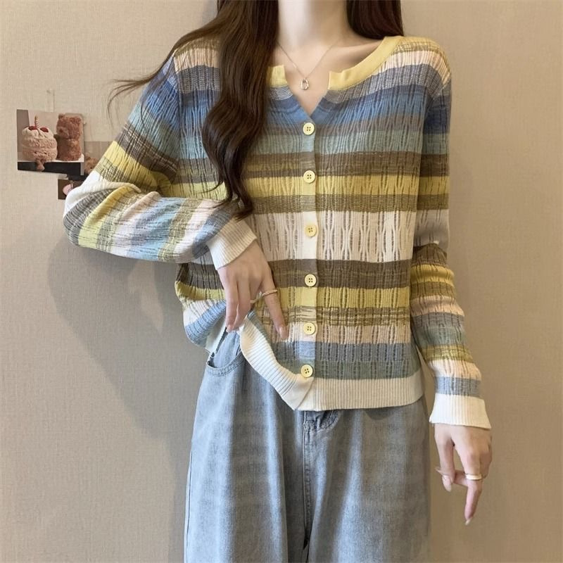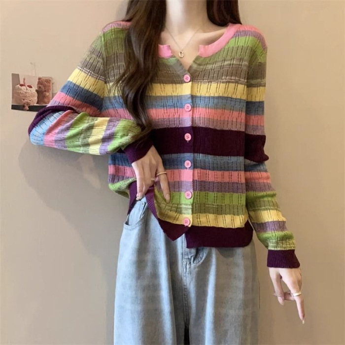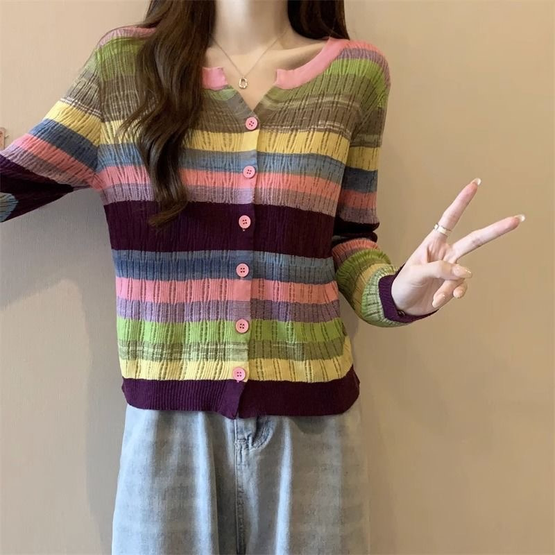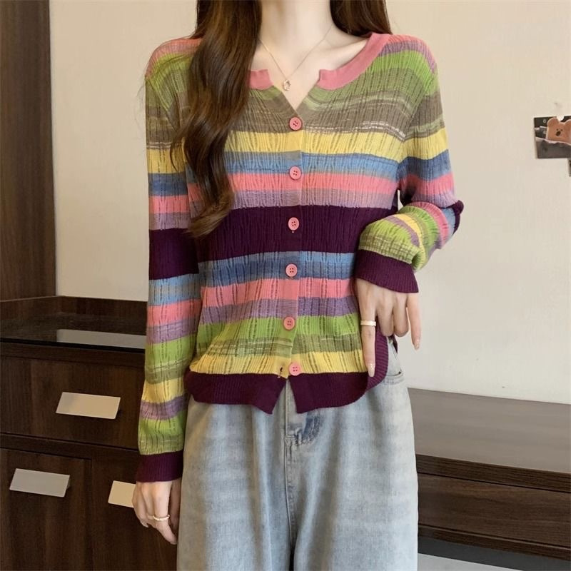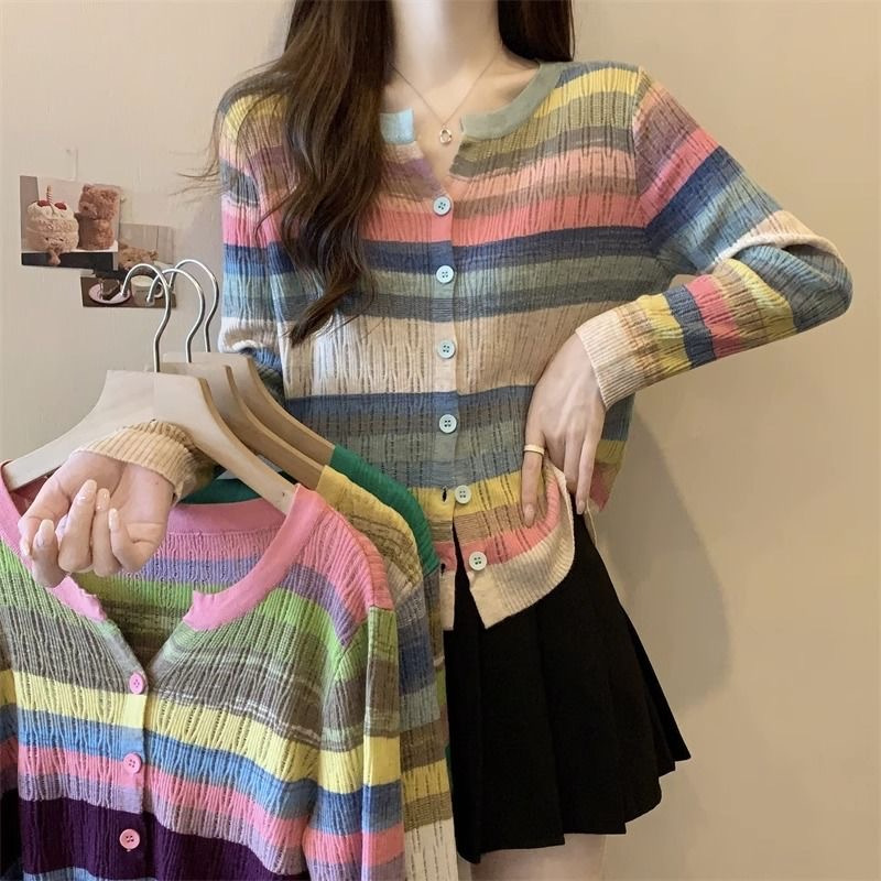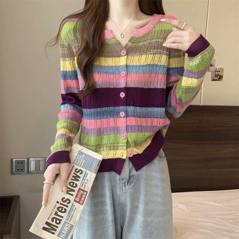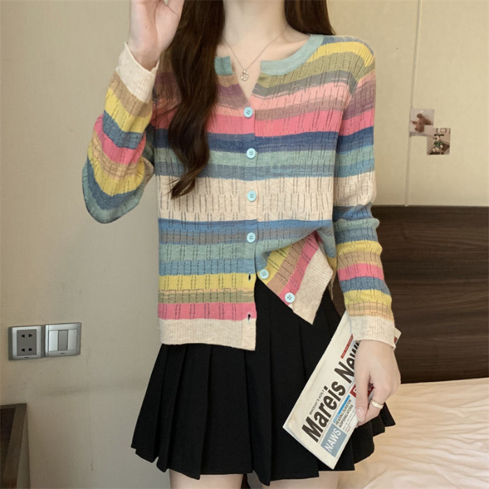 2023 새로운 가을 무지개 줄무늬 라운드 넥 한국 스타일 긴팔 니트 카디건 여성을위한 느슨한 슬리밍 중공 스웨터