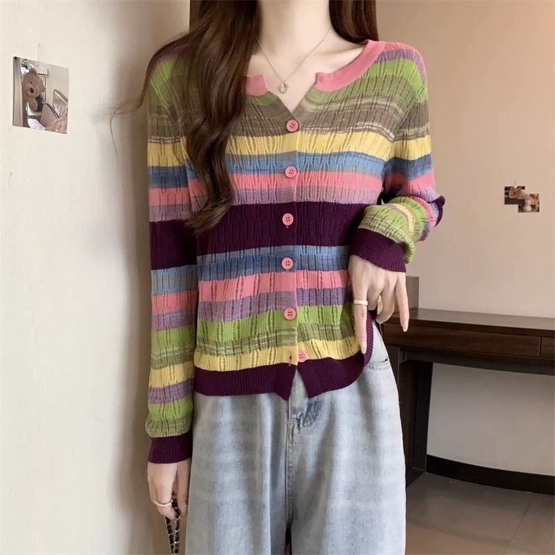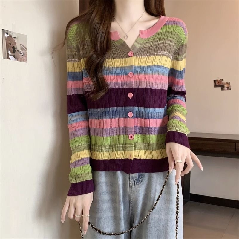 2023 새로운 가을 무지개 줄무늬 라운드 넥 한국 스타일 긴팔 니트 카디건 여성을위한 느슨한 슬리밍 중공 스웨터스토어 가기