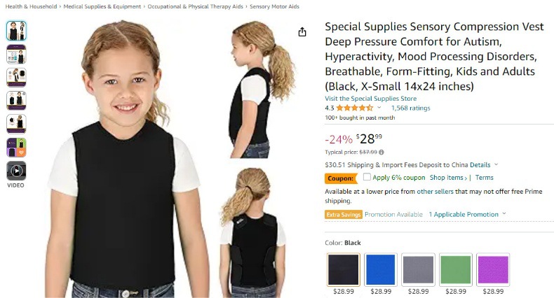 5、平静 恢复性感官背心 – 这款专为有感官问题的孩子设计的压缩背心有助于缓解由多动症或自闭症引起的压力、焦虑和压倒性的情绪,让您的孩子在他人周围感到更加专注、平静和放松。