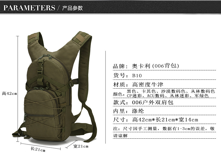 广州市路客箱包厂是一家专业设计、生产、销售户外背包、腰包、腿包、水袋、腰带、背心、迷彩服等产品的诚信经营商家。拥有完整、科学的质量管理体系。自设有生产工厂,多名老员工在户外产品领域有着丰富的设计、生产经验,所有材料均由老板谈总亲自选料,严格把关,我们秉承服务优质、全面周到等优势占有市场,在产品的设计、包装、质量上不断的提升,满足了大批客户,产品远销海外。专门为国内外贸易公司、实体店、国内外网上店铺军迷户外用品、箱包行业创业者供应大量现货。