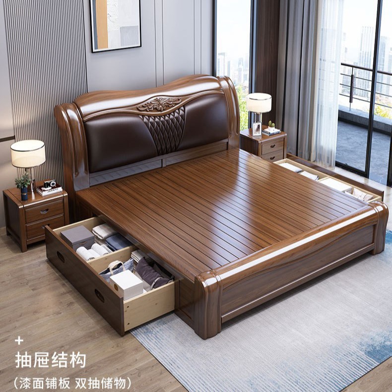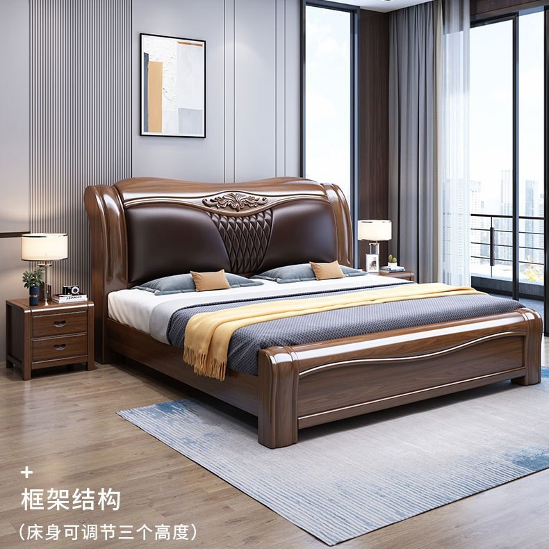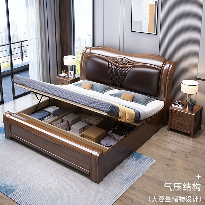 골드 월넛 원목 침대 1.8* 2m 대형 침대 모던 심플 수납 침대 마스터 침실 더블 소프트 가죽 침대