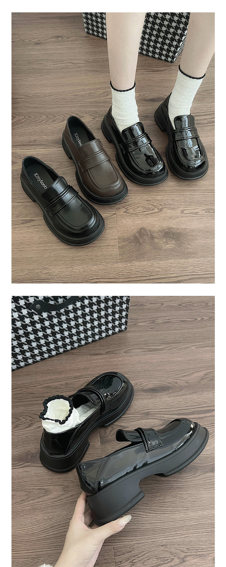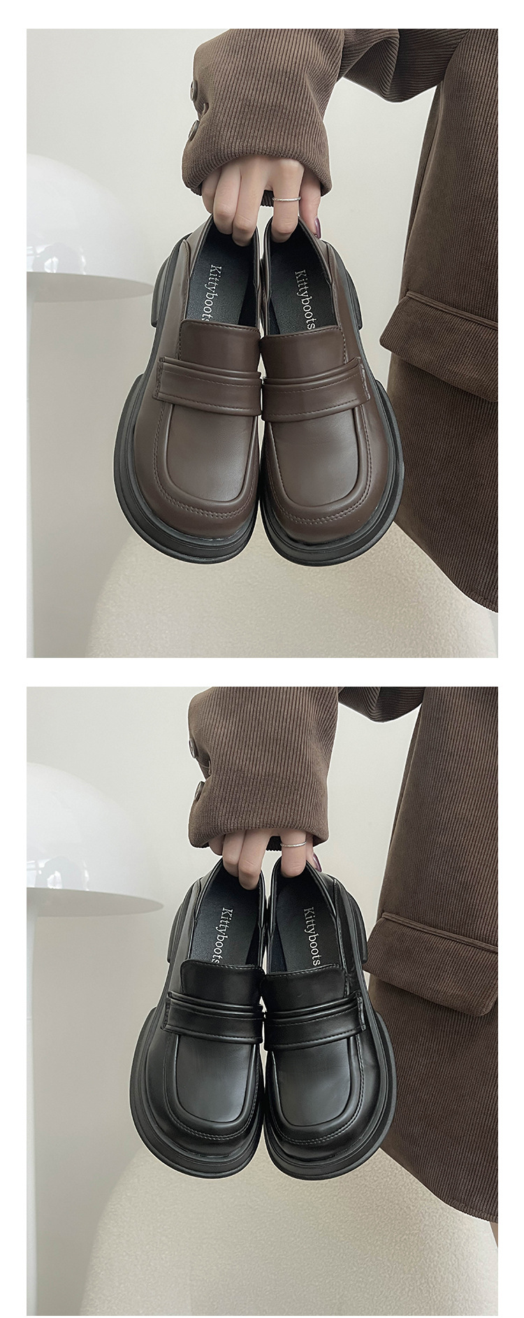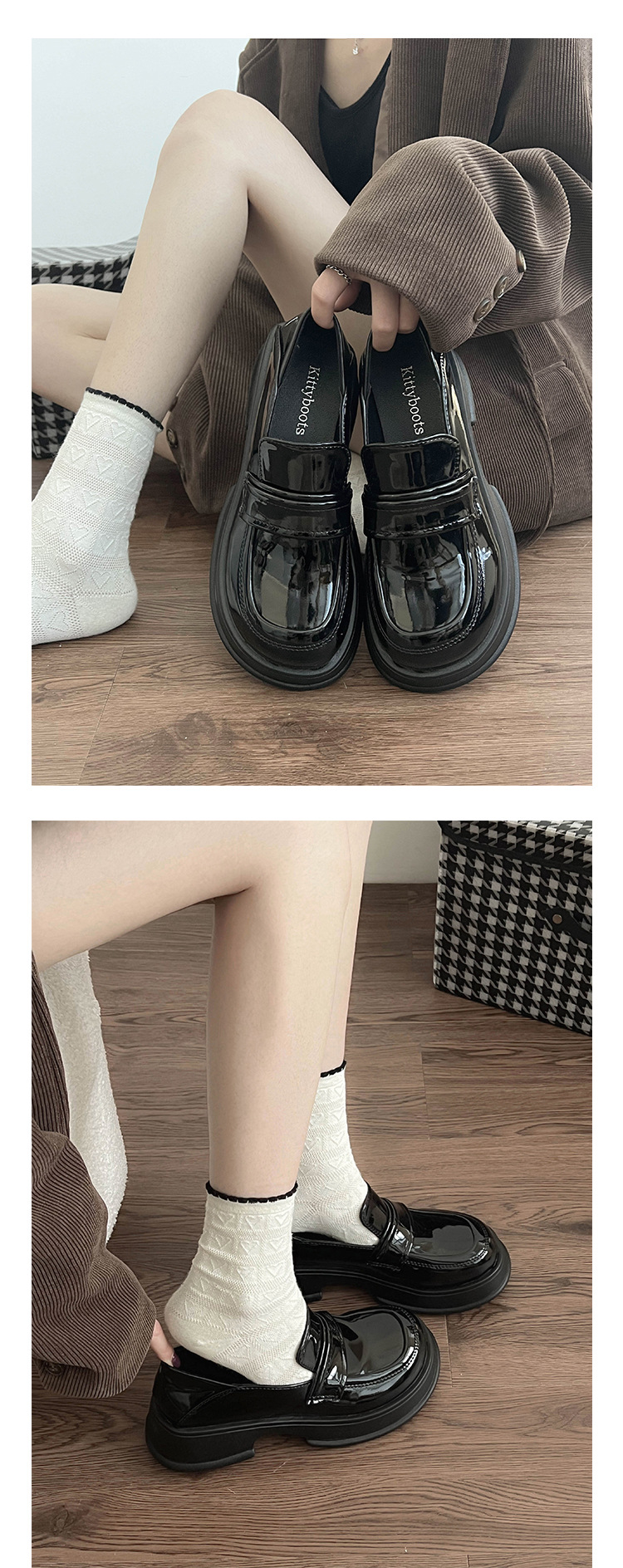 블랙 프렌치 플랫폼 로퍼 여성용 2023 신상품 가을 모든 매치 라운드 발가락 신발 복고풍 영국 스타일 작은 가죽 신발스토어 가기