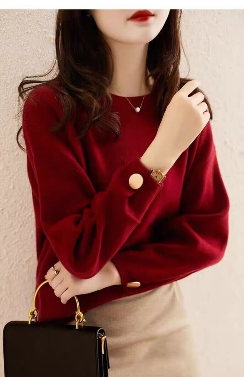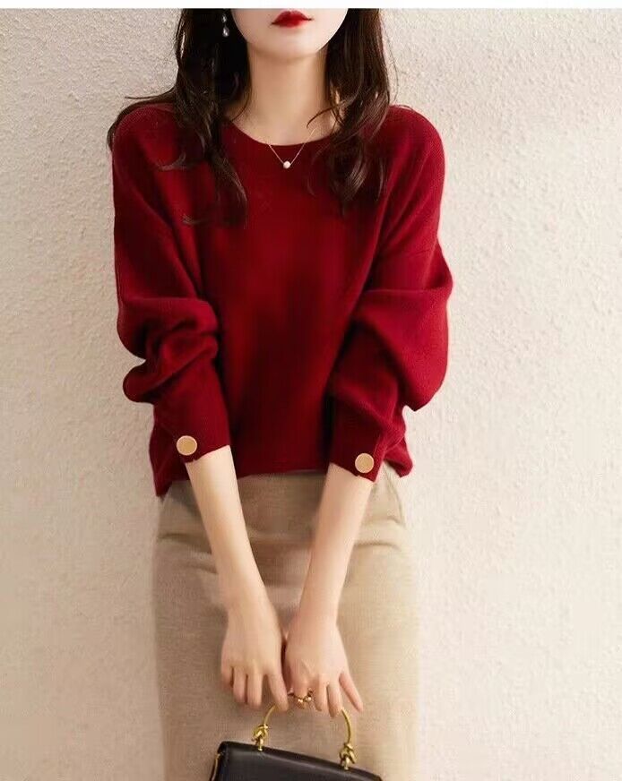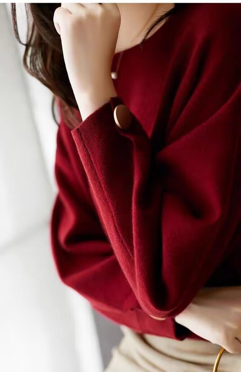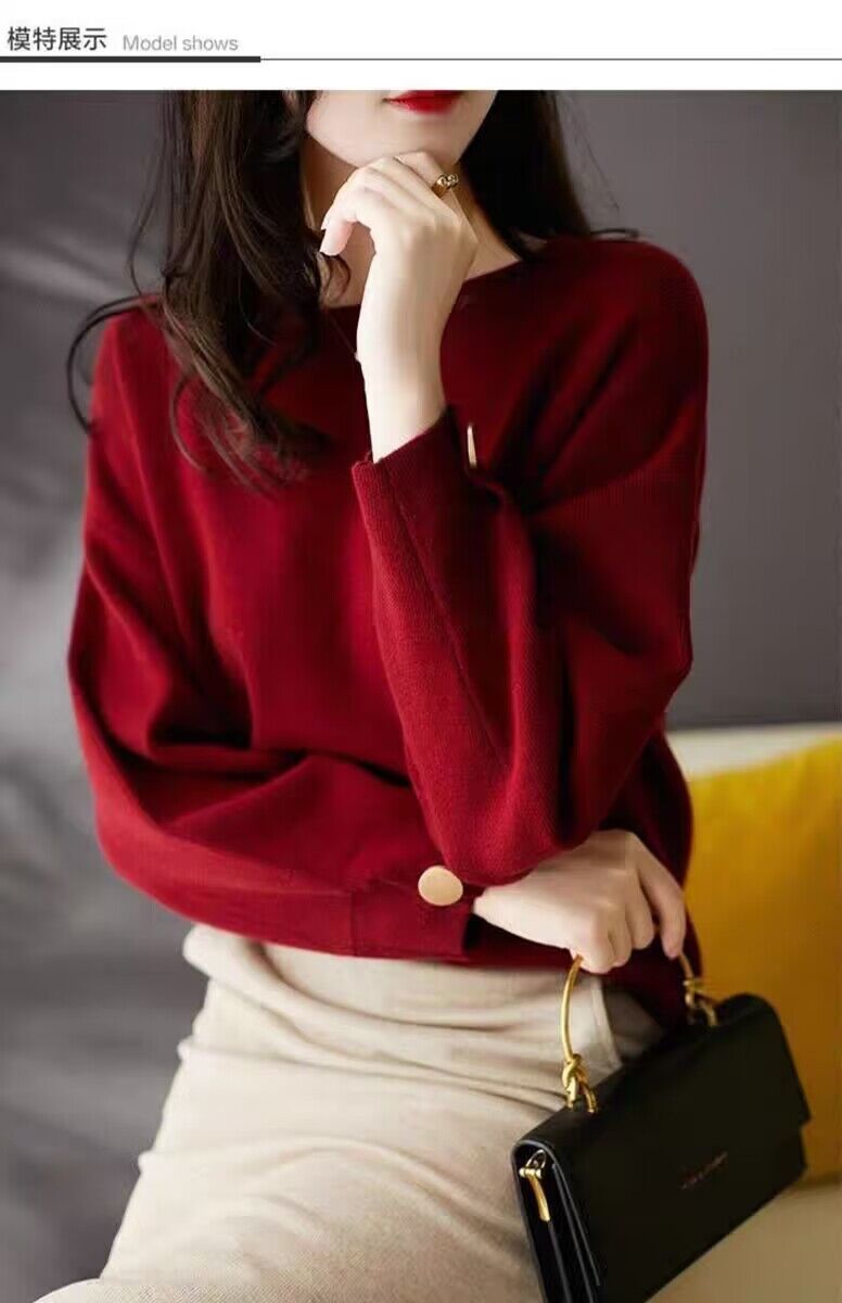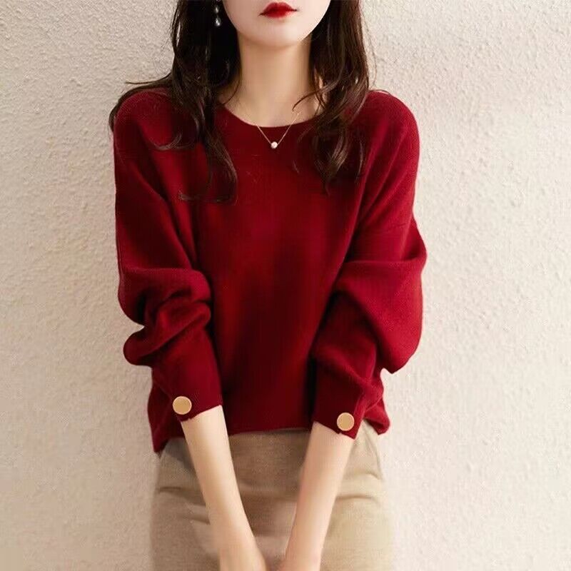 여자 2023 가을과 겨울 새로운 긴 소매 크루 넥 풀오버 올 매치 레드 니트 배트 모빌 탑 트렌디