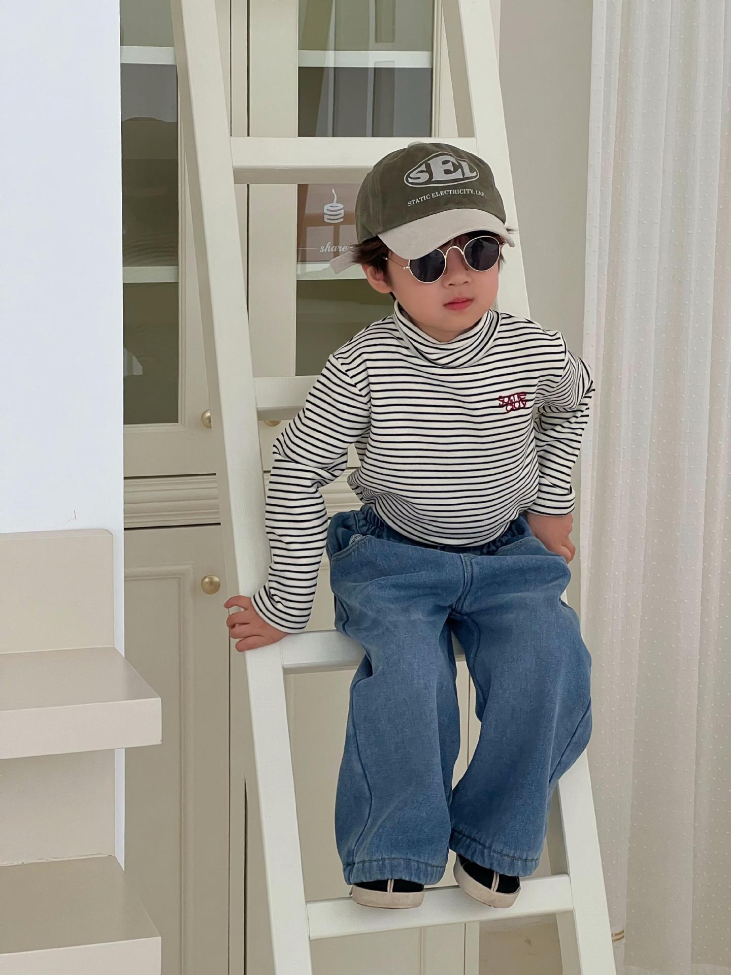 탑 에그 한국 아동복 2023 겨울 새로운 어린이 베이스 셔츠 자수 레터 스트라이프 하프 하이 넥 브러시 소프트스토어 가기