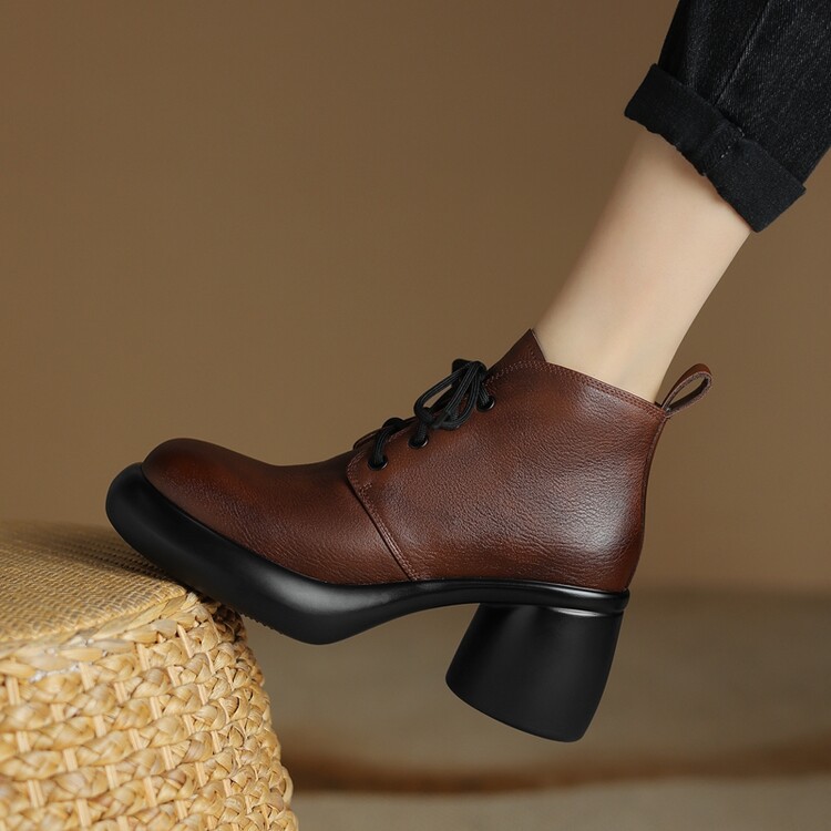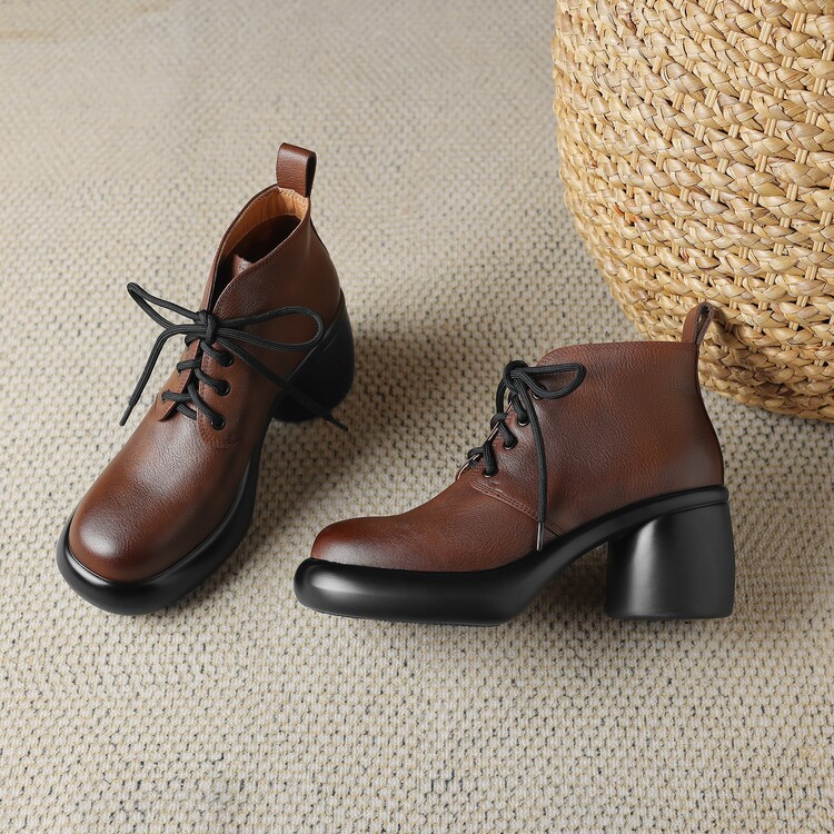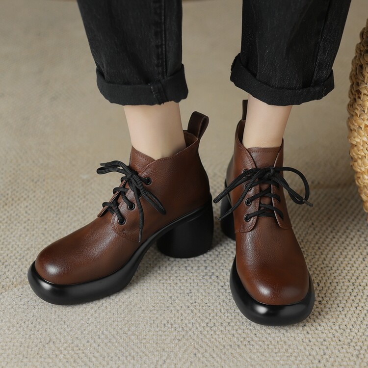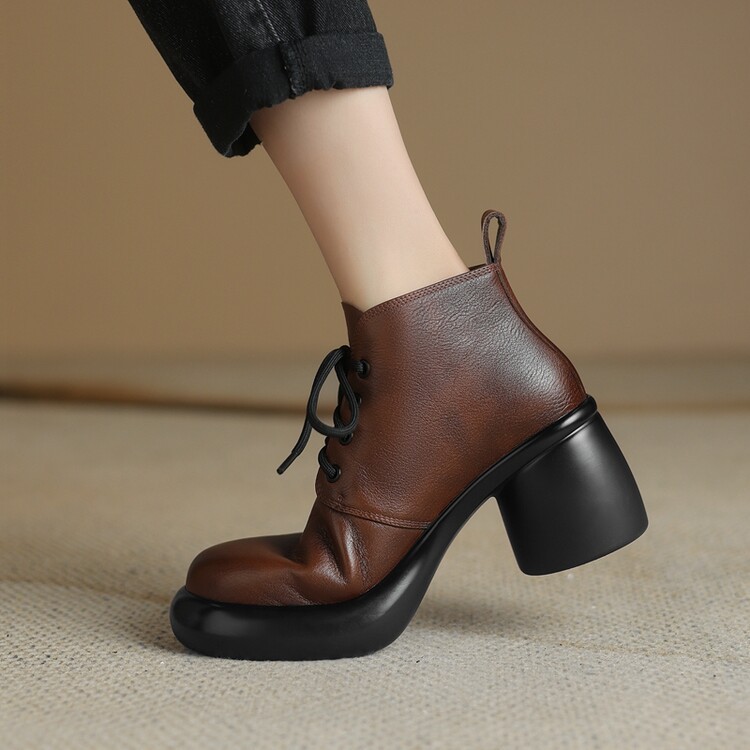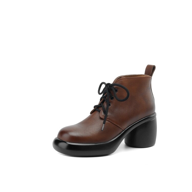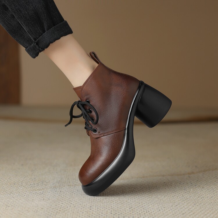 하이힐 마틴 부츠 여성의 2023 가을과 겨울 새로운 잘 생긴 영국 스타일 소가죽 수제 빈티지 다크 브라운 부츠 두꺼운 굽 여성 신발