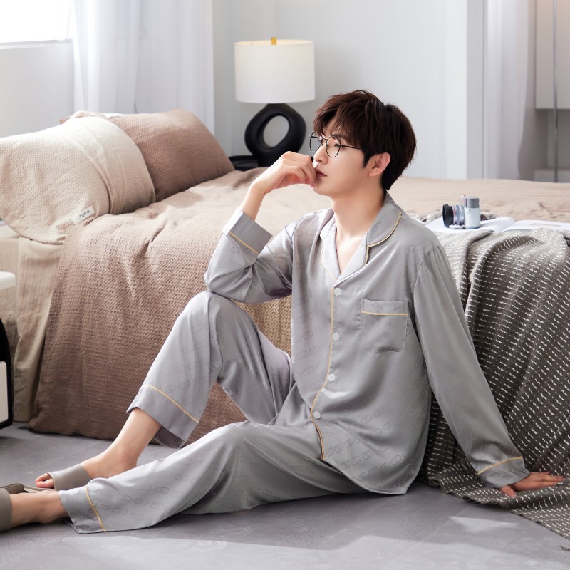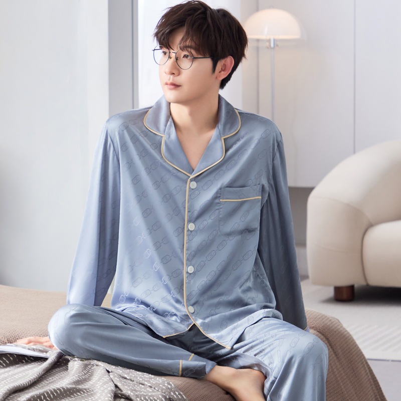 2023 새로운 잠옷 남자의 아이스 실크 긴 소매 봄과 가을 얇은 체인 남자 친구 고급 남자 실크 세트
