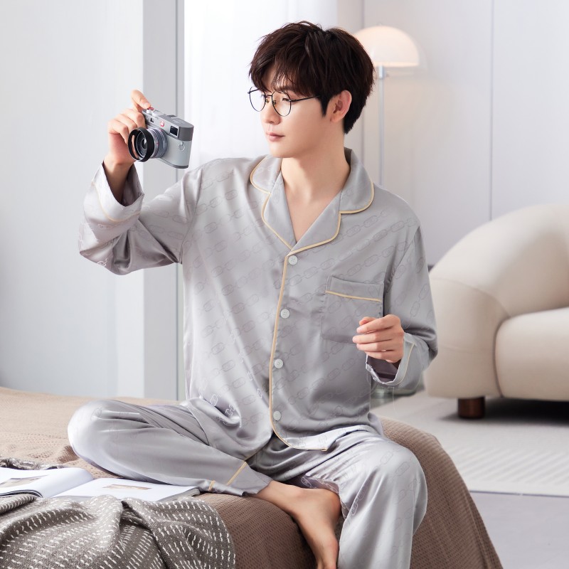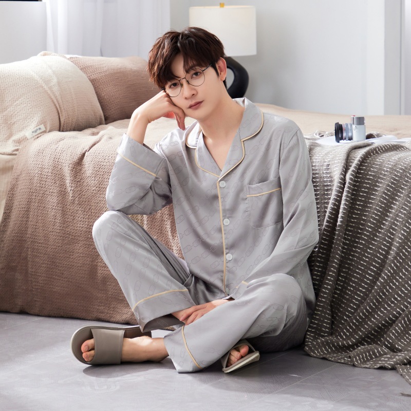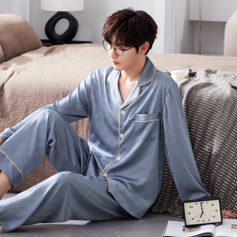 2023 새로운 잠옷 남자의 아이스 실크 긴 소매 봄과 가을 얇은 체인 남자 친구 고급 남자 실크 세트스토어 가기