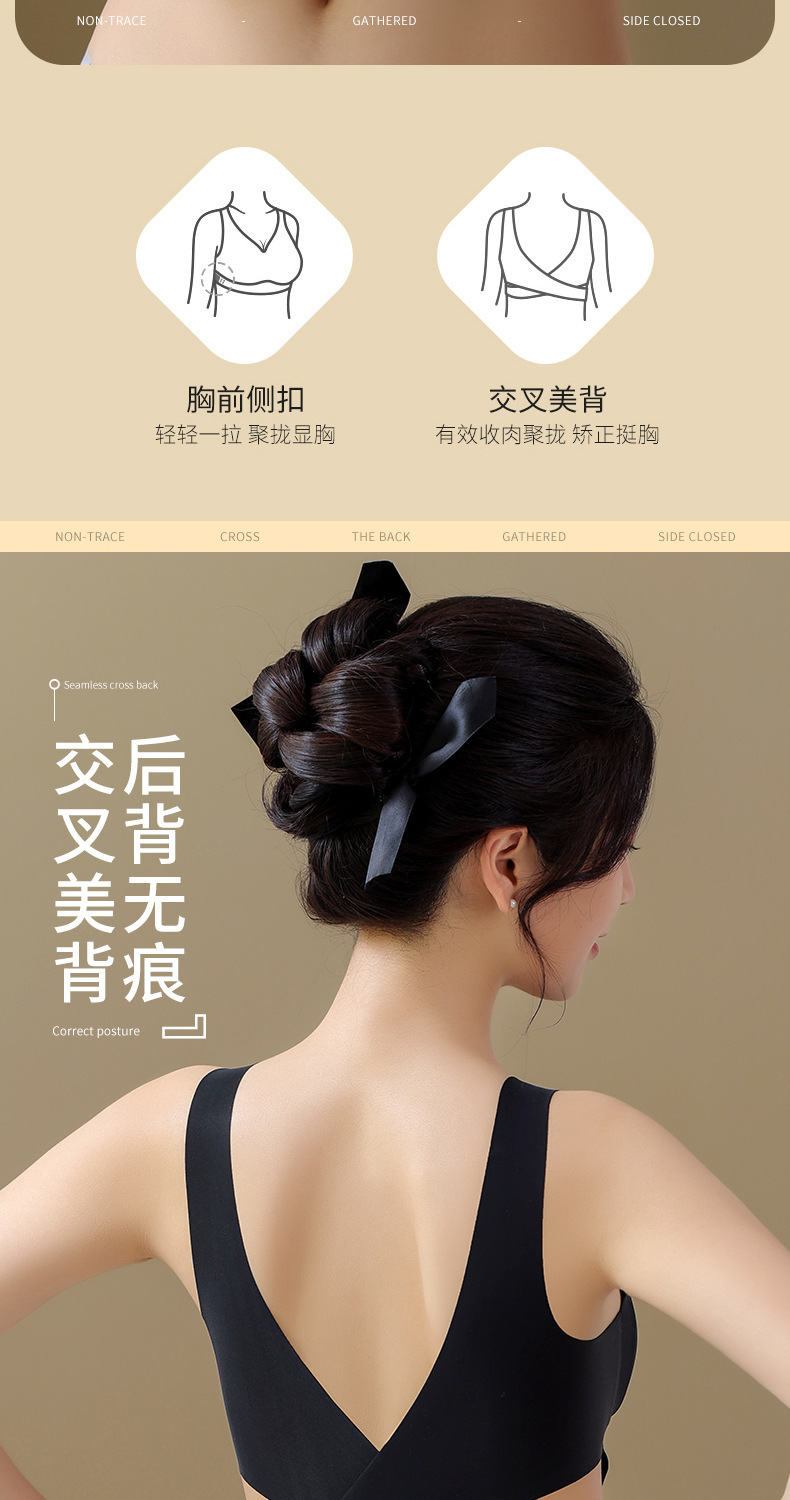 폭발성 차 폴리 페놀 유지 관리 속옷 원활한 작은 가슴 푸시 업 크로스 프론트 사이드 버클 뷰티 백 브라 여성용 반지 없음 속옷