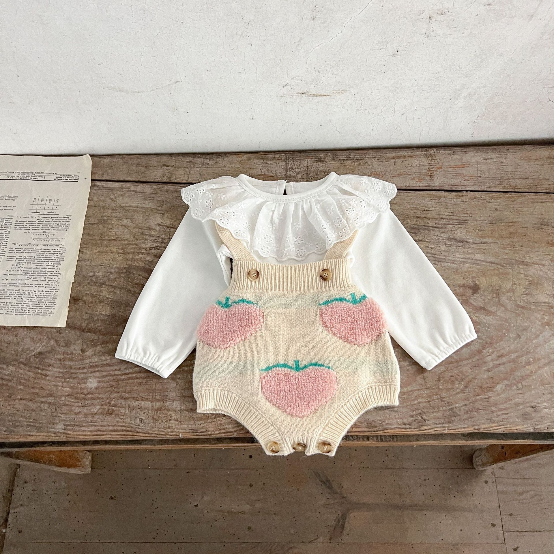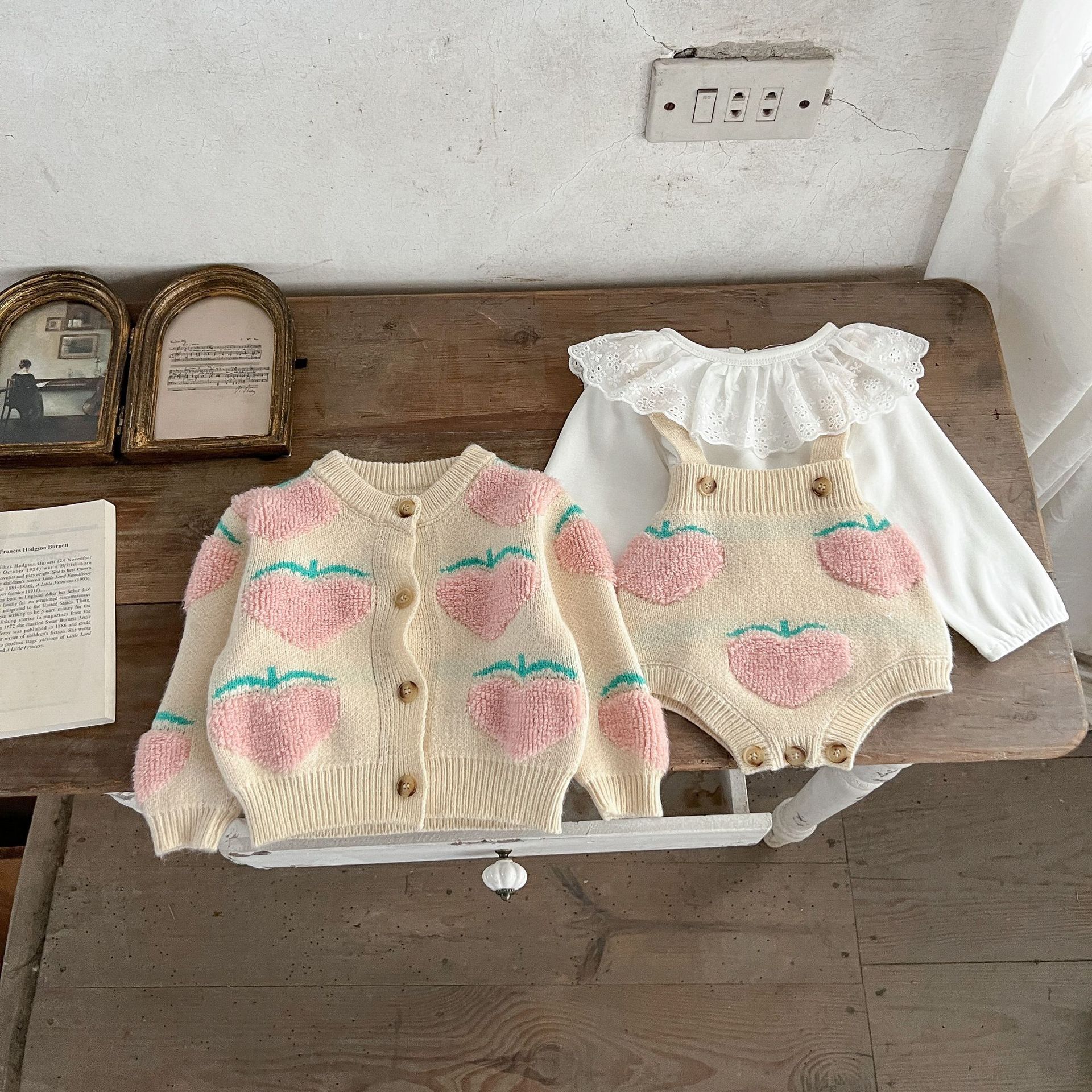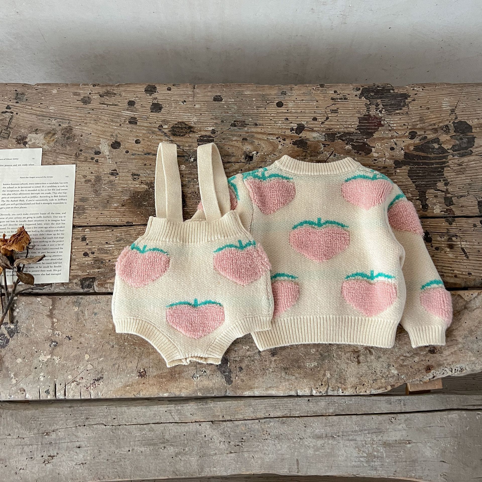남성과 여성의 아기 스웨터 가을과 겨울 투피스 코튼 복숭아 자수 카디건 + 멜빵 세트 한국어 버전
