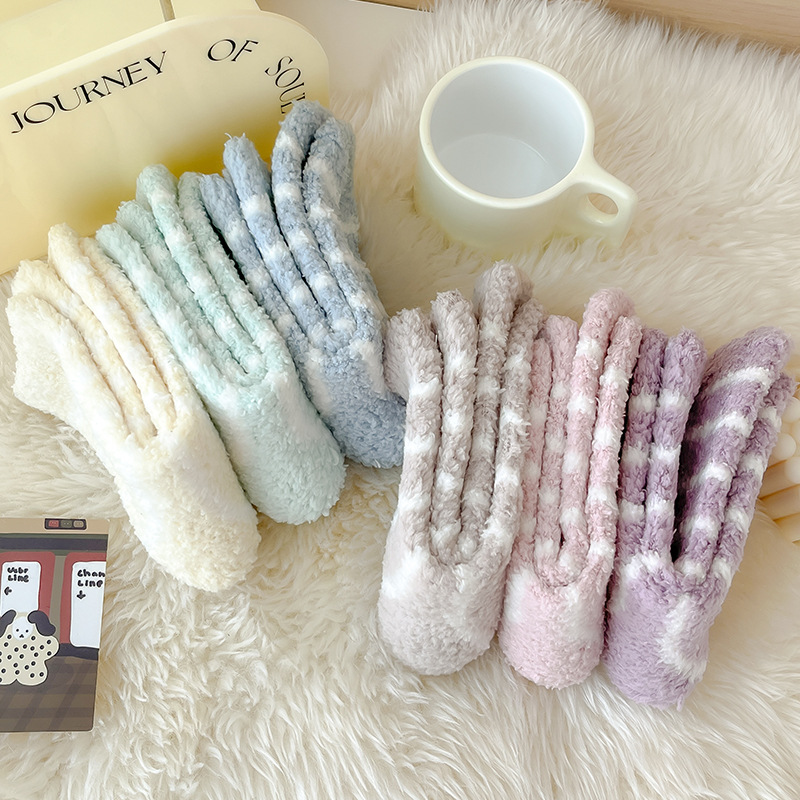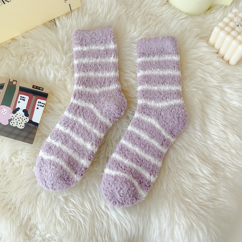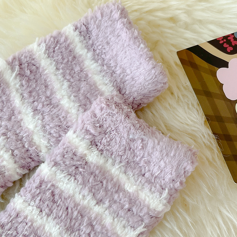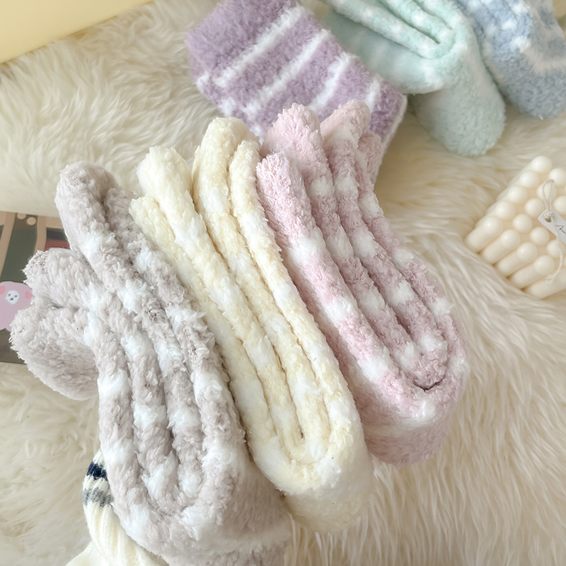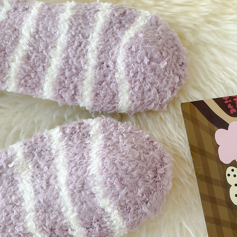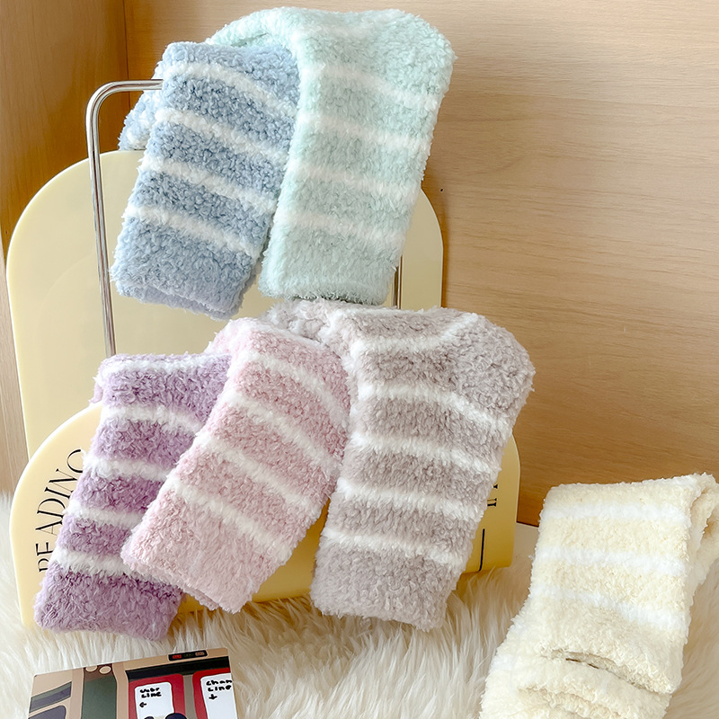 산호 양털 양말 여자의 가을과 겨울 중간 배럴 기모 두꺼운 귀여운 스트라이프 홈 수면 겨울 봉제 달 양말