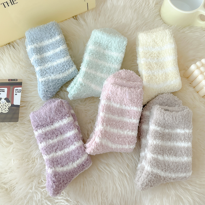 산호 양털 양말 여자의 가을과 겨울 중간 배럴 기모 두꺼운 귀여운 스트라이프 홈 수면 겨울 봉제 달 양말스토어 가기