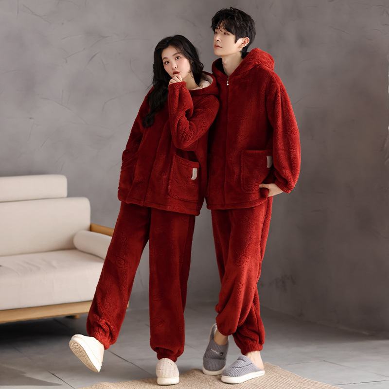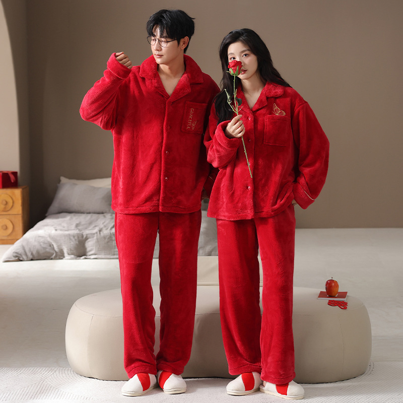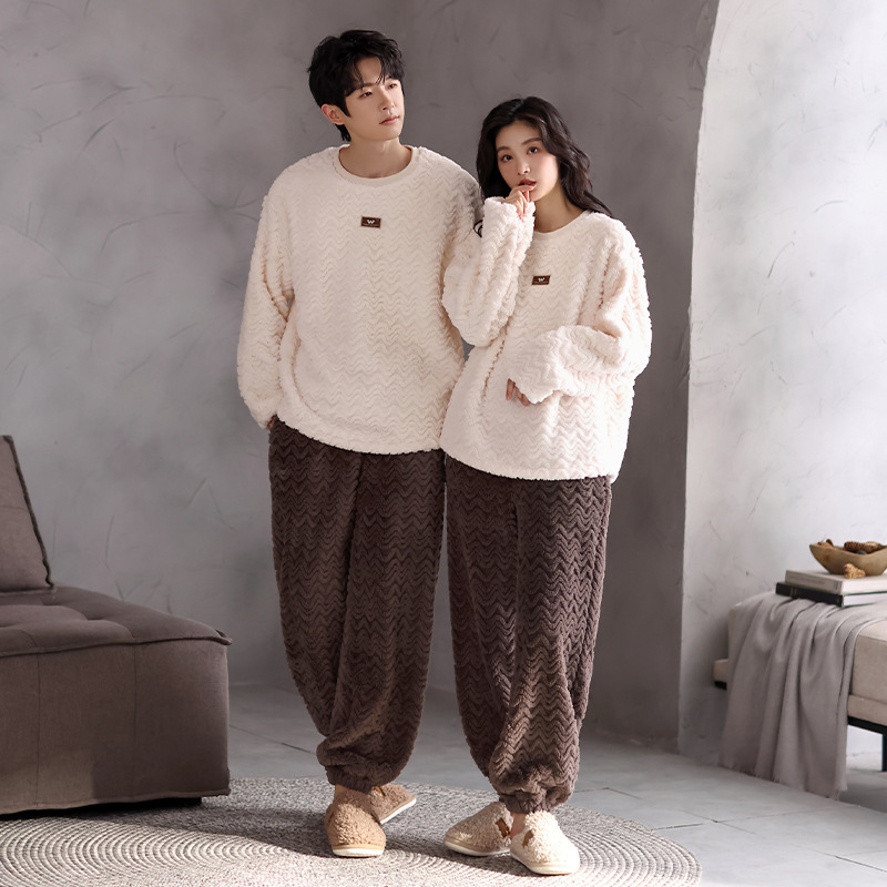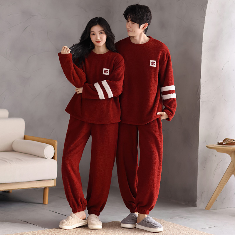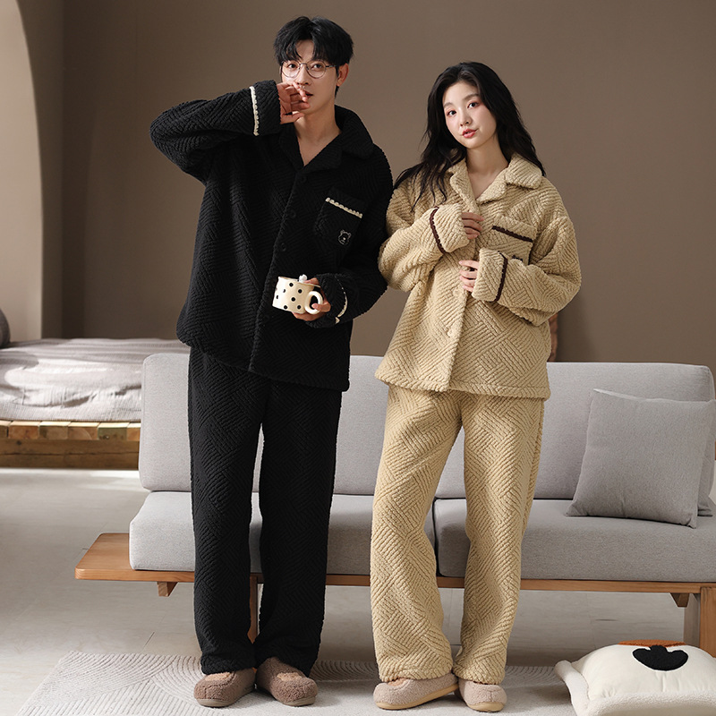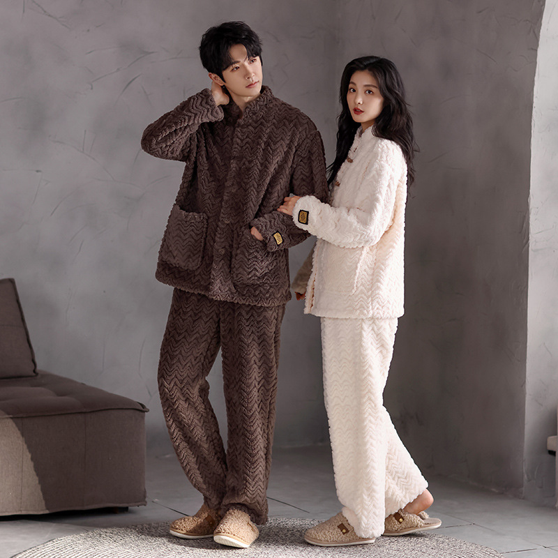 겨울 플란넬 커플 잠옷 겨울 풀오버 긴 소매 바지 세트 남성과 여성을위한 따뜻한 잠옷을 입고