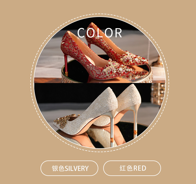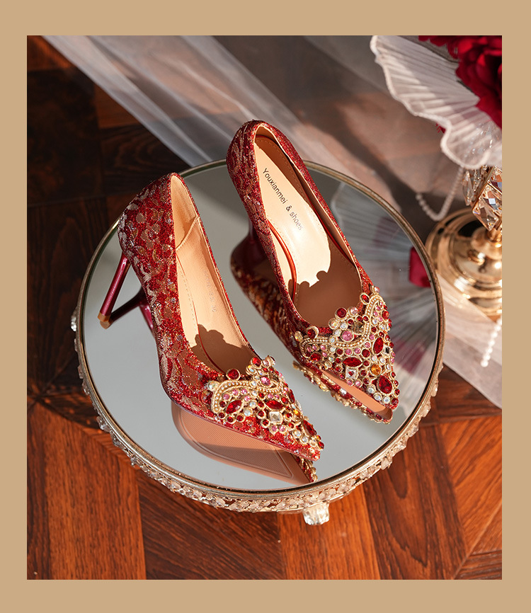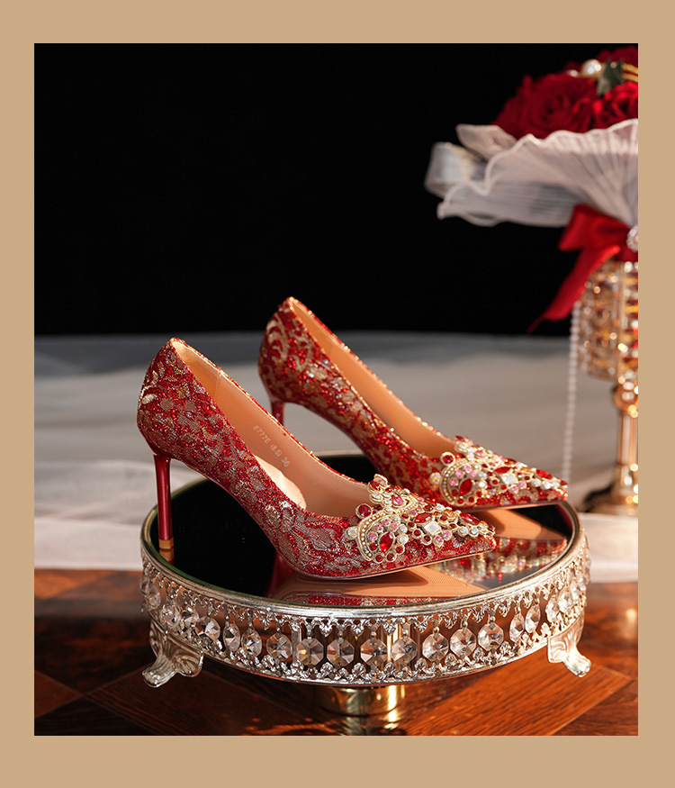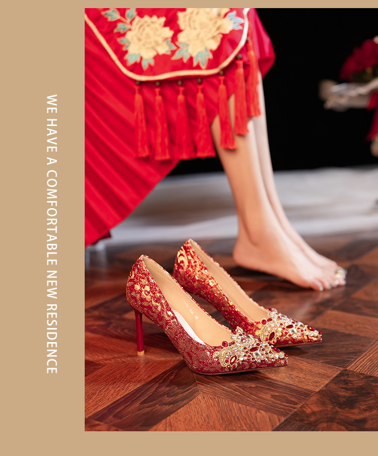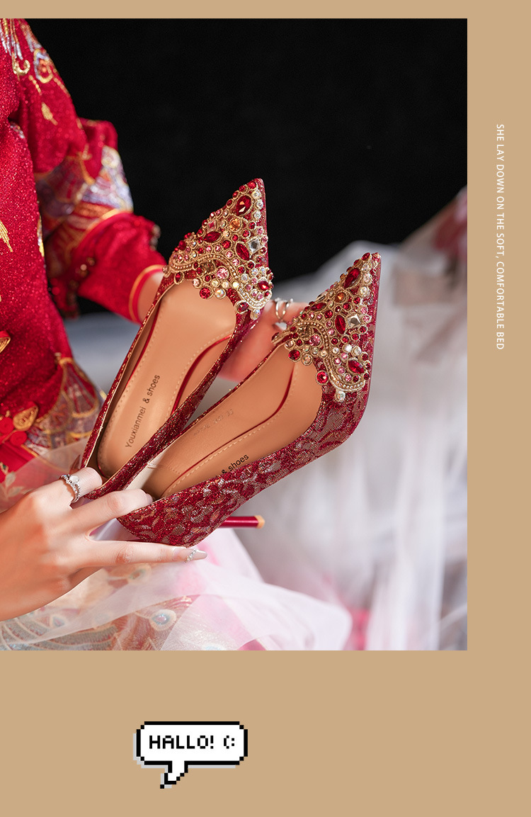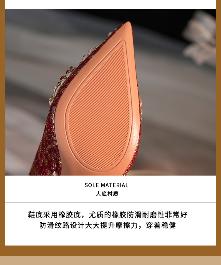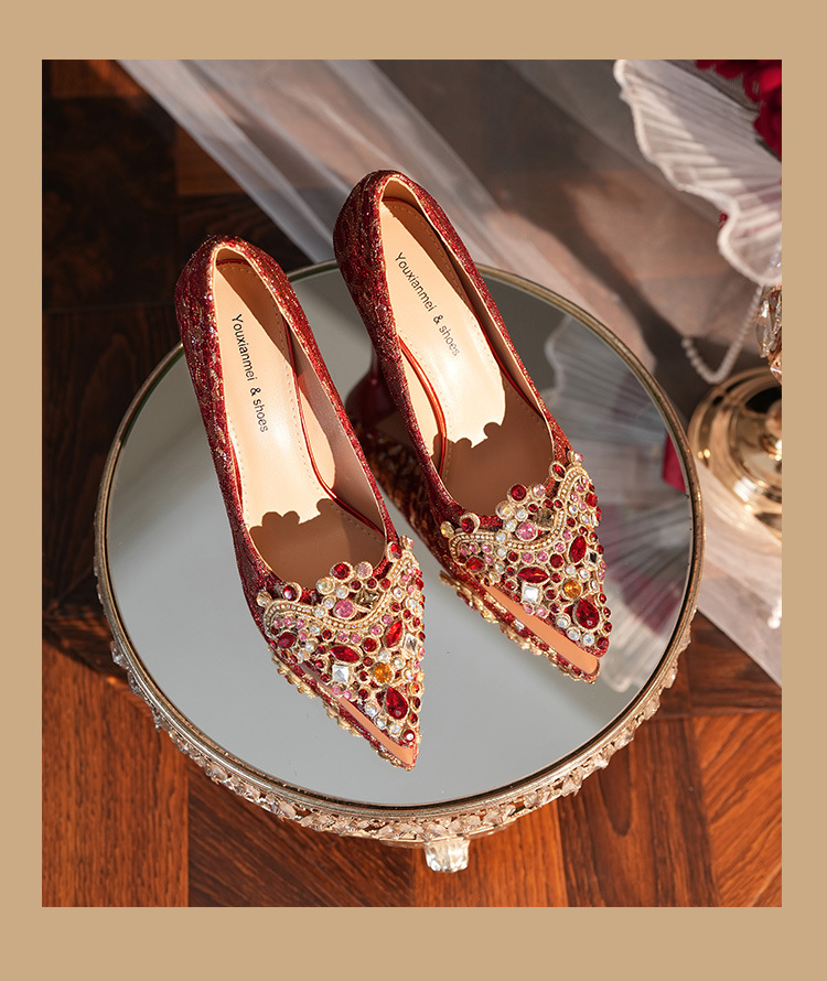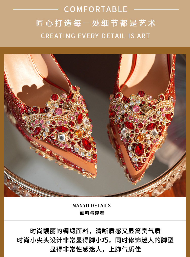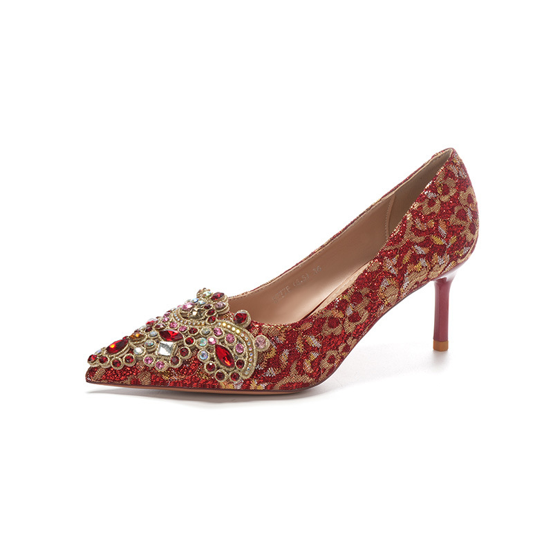 8777E-007 뾰족한 앞코의 라인스톤 장식, 실크 새틴, 금색 테두리, 하이힐, 웨딩, 연회, 신부, 신부 들러리 구두, 빨간색, 축제용스토어 가기