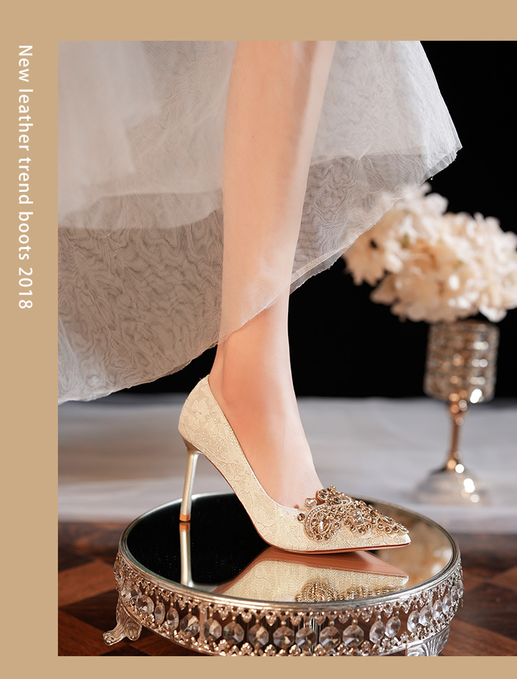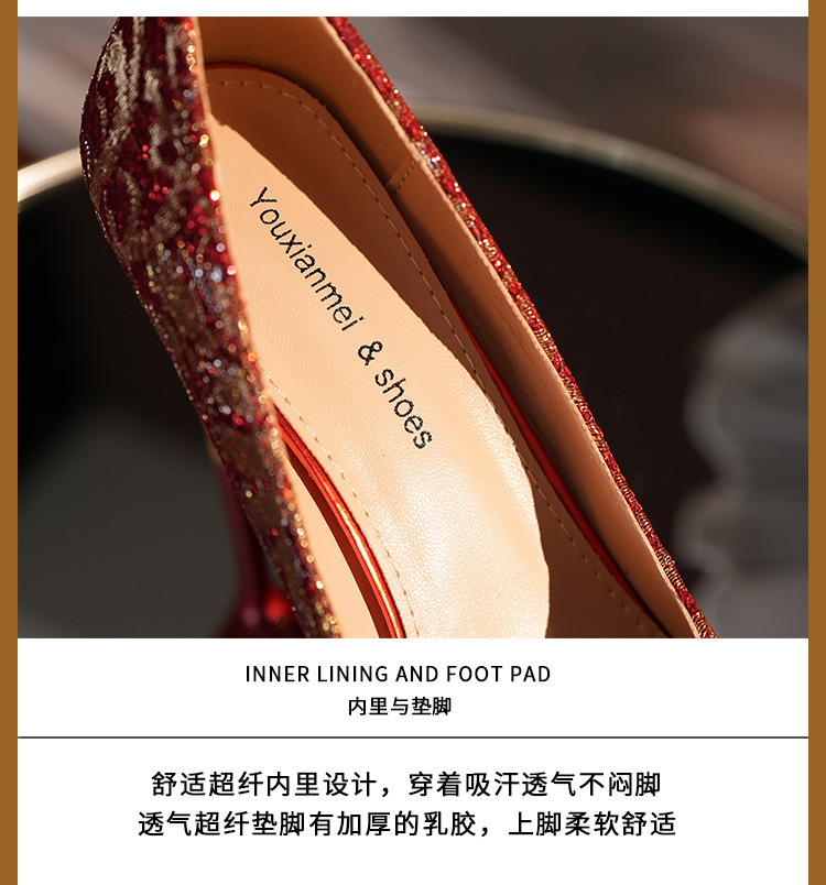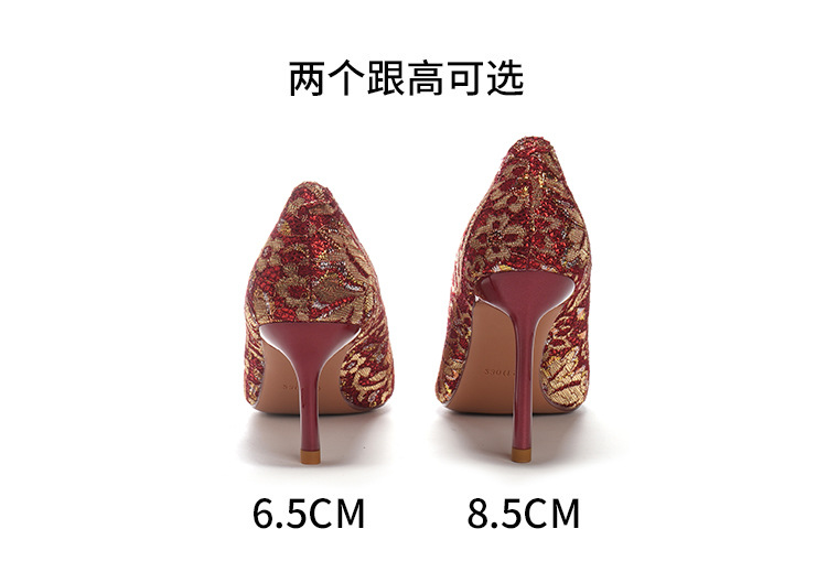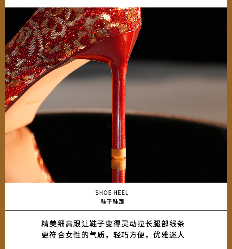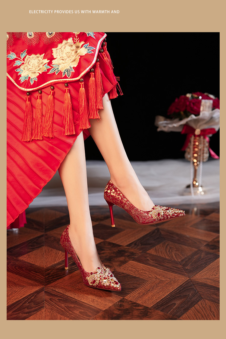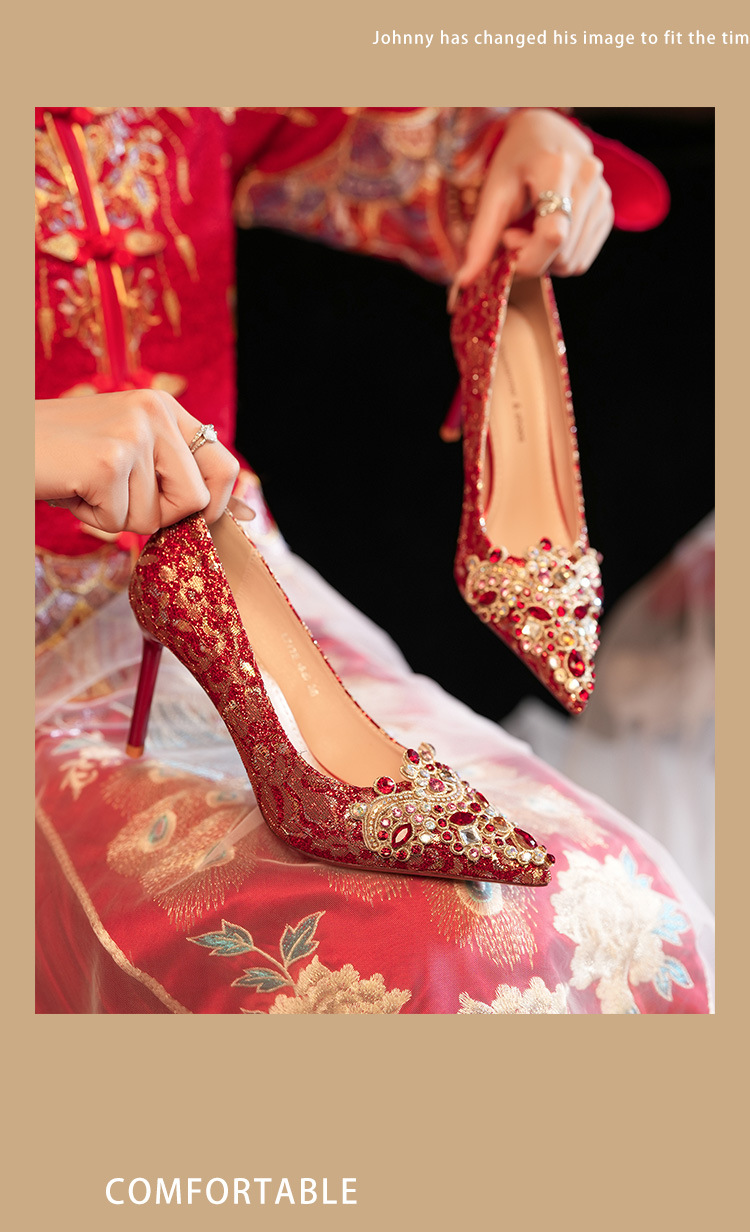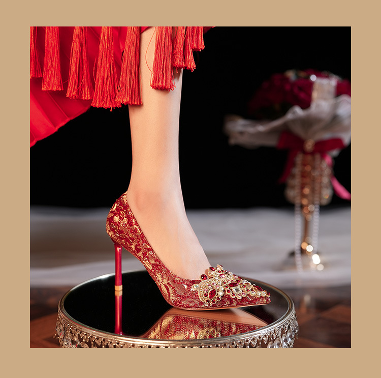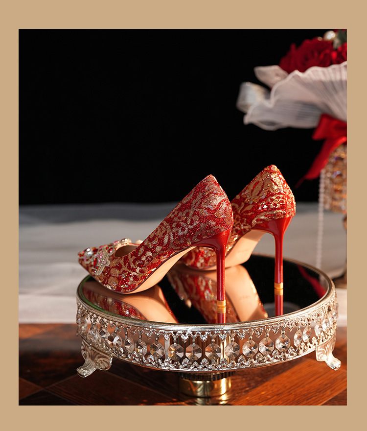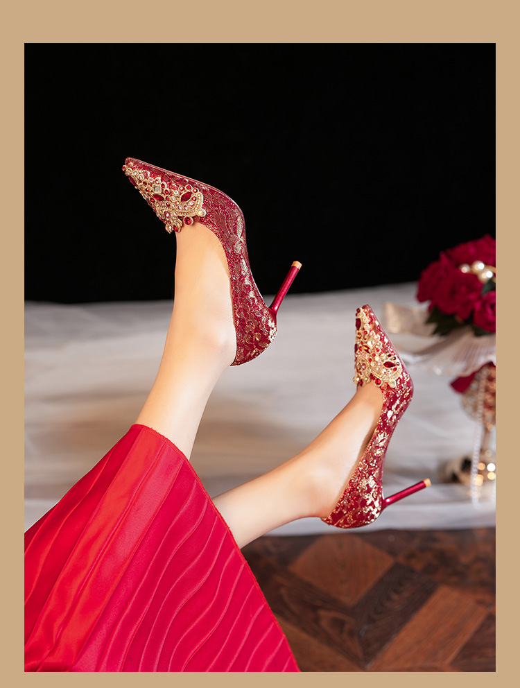8777E-007 뾰족한 앞코의 라인스톤 장식, 실크 새틴, 금색 테두리, 하이힐, 웨딩, 연회, 신부, 신부 들러리 구두, 빨간색, 축제용스토어 가기