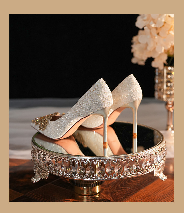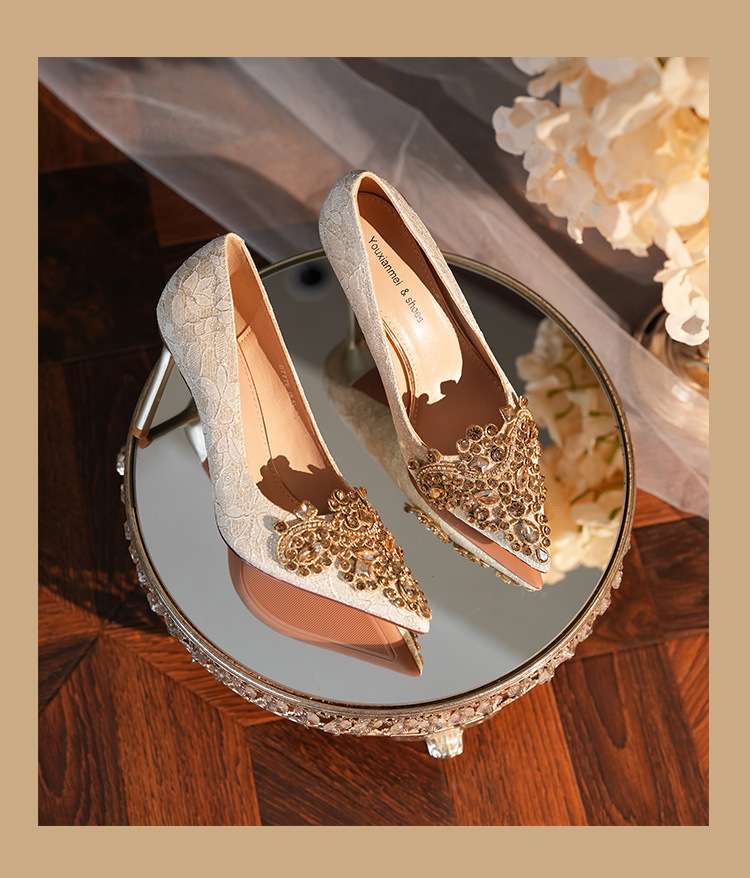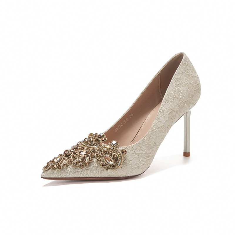 8777E-007 뾰족한 앞코의 라인스톤 장식, 실크 새틴, 금색 테두리, 하이힐, 웨딩, 연회, 신부, 신부 들러리 구두, 빨간색, 축제용