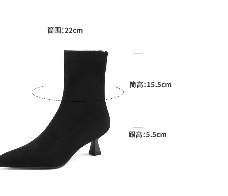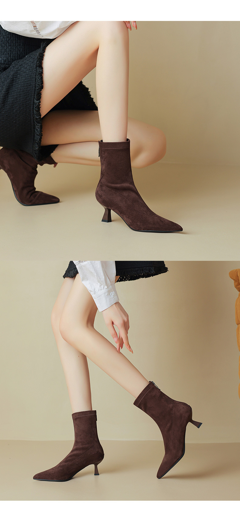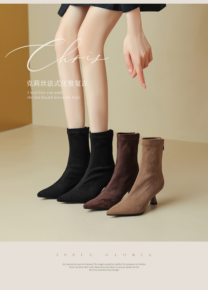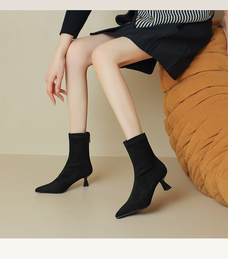 빈티지 뾰족한 하이힐 앵클 부츠 여성 가을과 겨울 2023 새로운 지퍼 스웨이드 얇은 굽 알몸 부츠 스트레치 얇은 부츠 양말 부츠