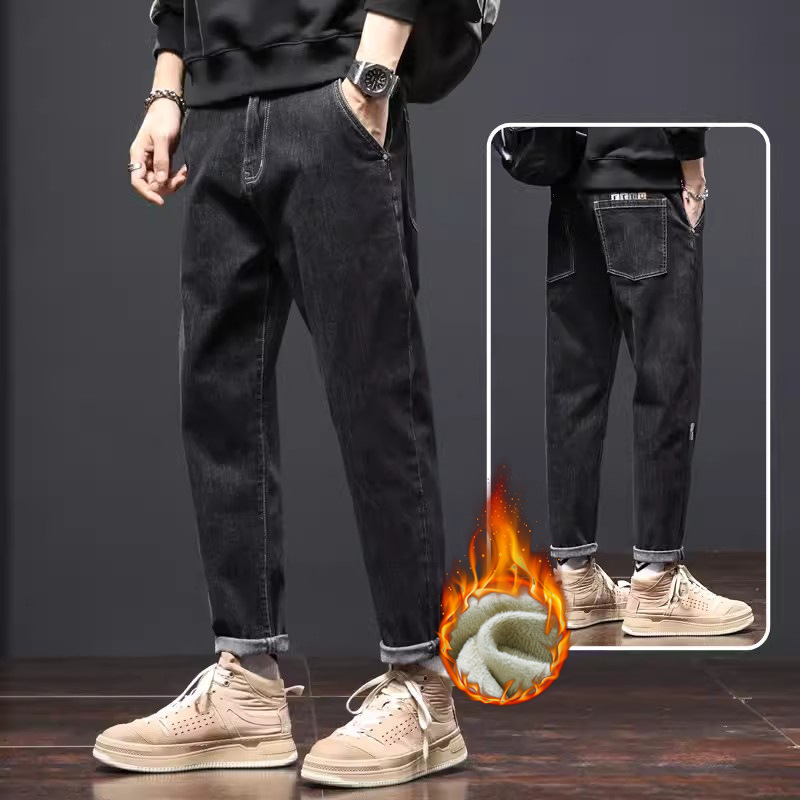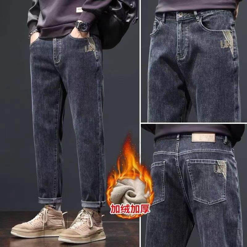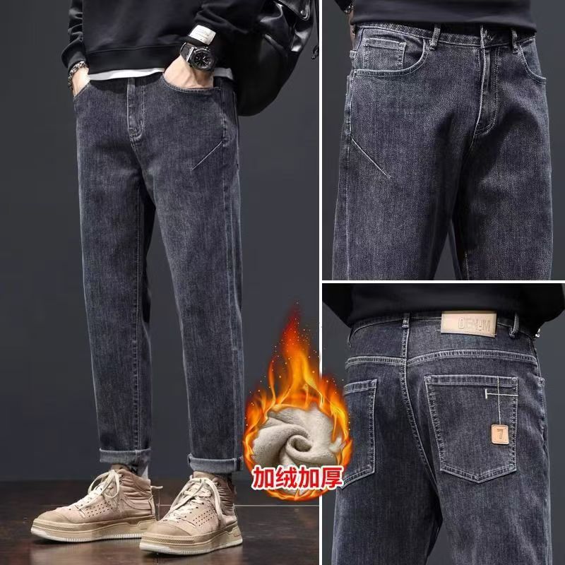 남성용 기모 데님 팬츠 가을 겨울 트렌디 브랜드 루즈핏 스트레이트 2025 신상 겨울 신축성 캐주얼 롱 팬츠 공장스토어 가기
