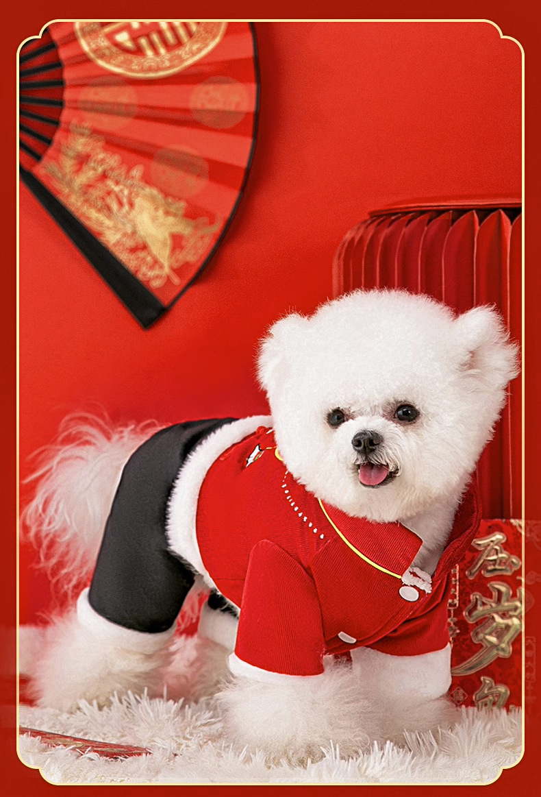 가을과 겨울 개 탕 세트 황금 잠금 수 놓은 디스크 버클 새해 네 발 면 코트 중소 개 테디 애완 동물 개 옷스토어 가기