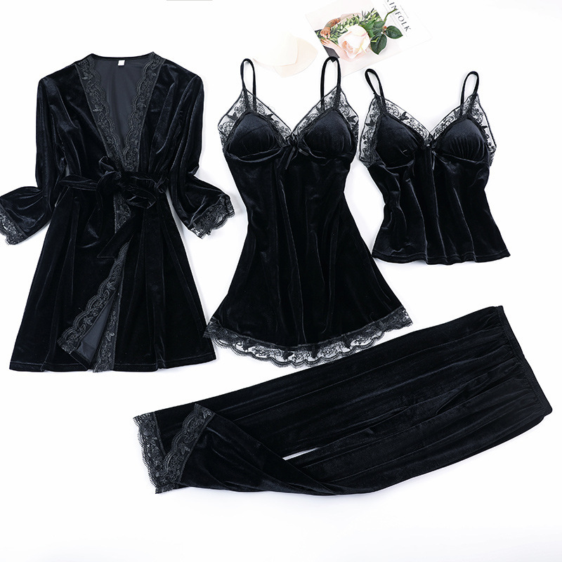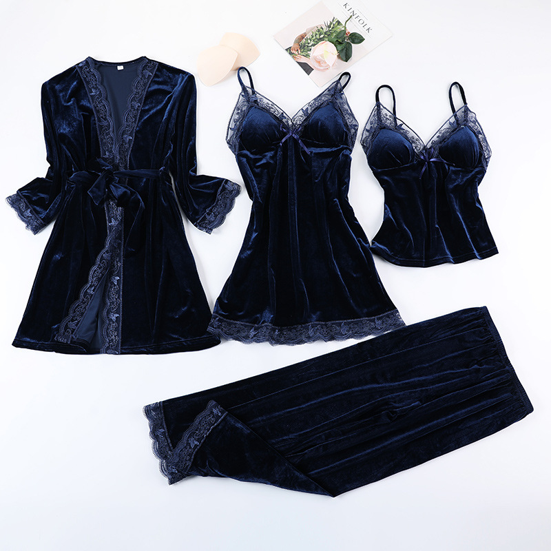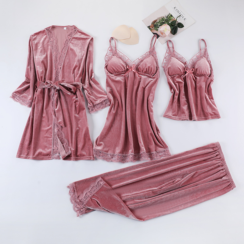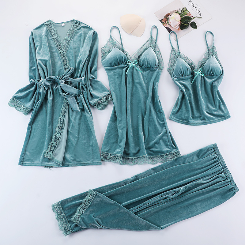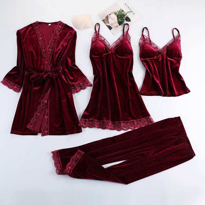 새로운 가을과 겨울 골든 벨벳 잠옷 슬링 로브 4 종 세트 여성의 유혹 섹시한 매력적인 여성의 가정복 세트