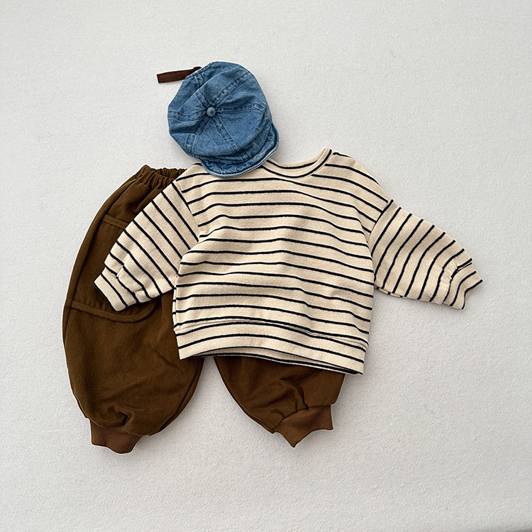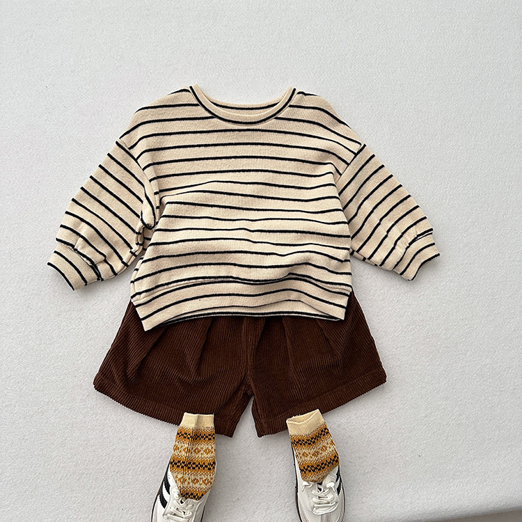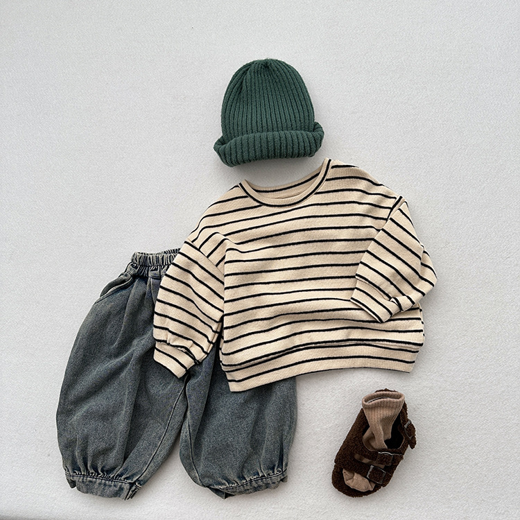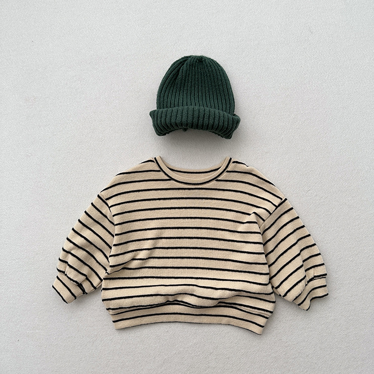 부드러운 하이 퀄리티 ~ 봄과 가을 어린이 샌딩 스트라이프 긴 소매 티셔츠 소년과 소녀를위한 느슨한 복고풍 일본 운동복스토어 가기